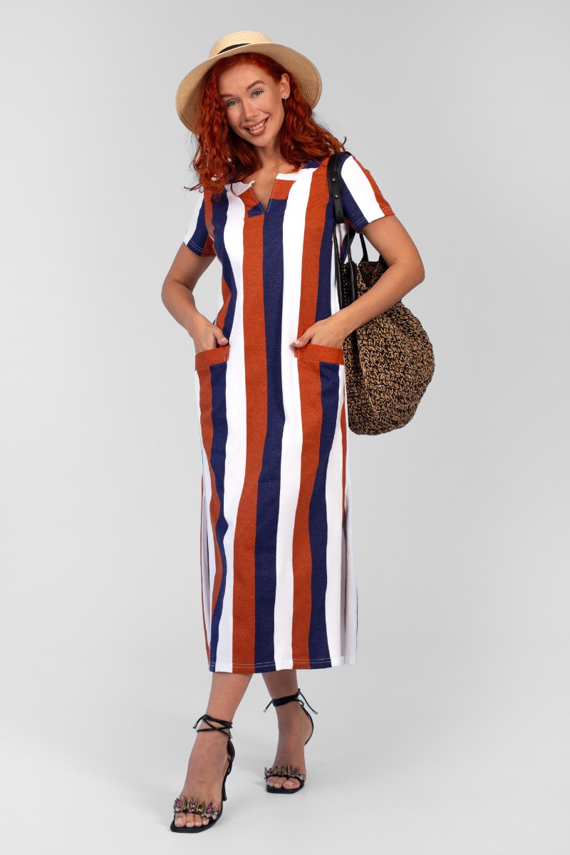 Представляем Вашему вниманию легкое женское платье из кулирки - 100% натурального, дышащего хлопка. Модель имеет яркую расцветку, которая интересно смотрится и поднимает настроение. Изделие красиво сидит на фигуре и подчеркивает её достоинства. В нём Вы будете чувствовать себя комфортно и уверенно.