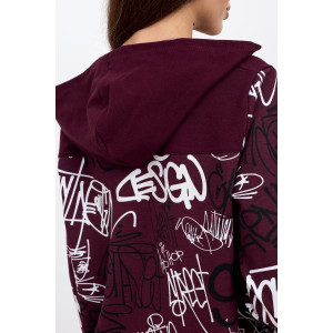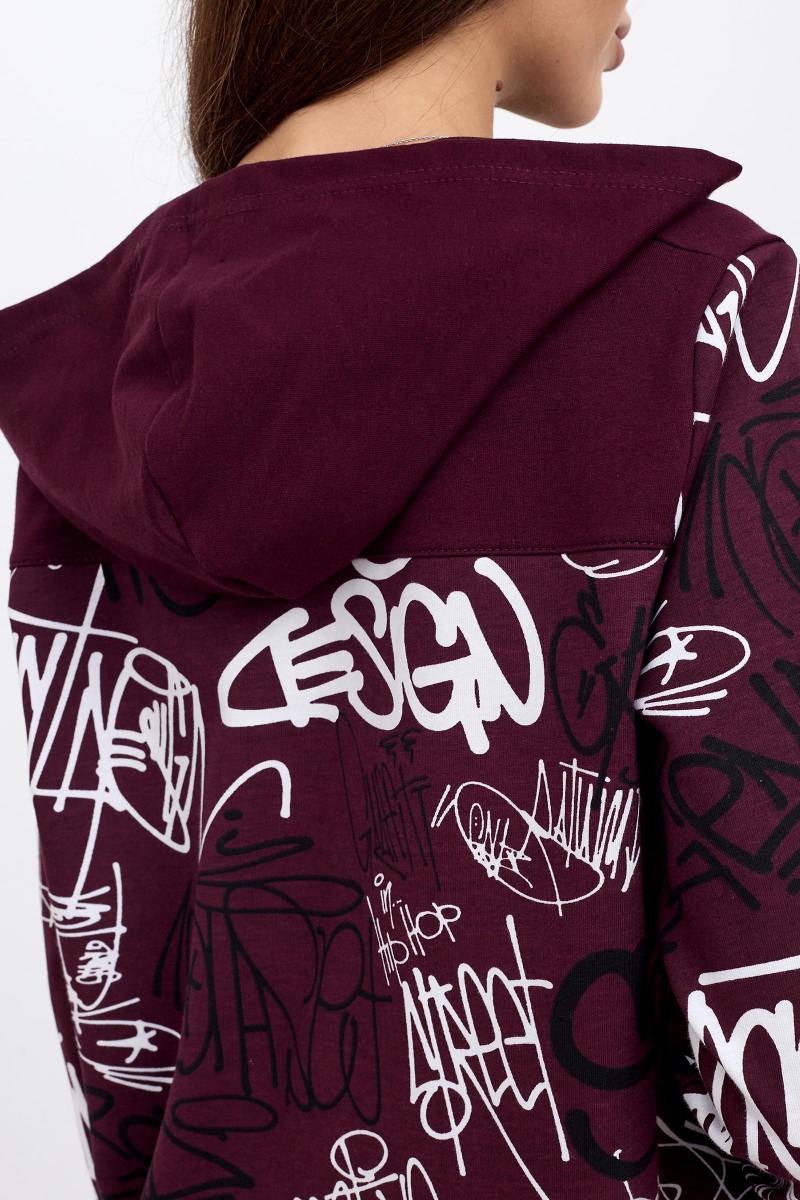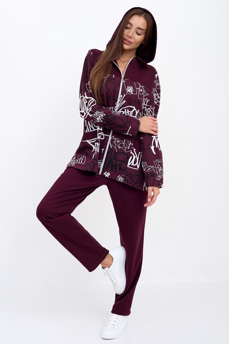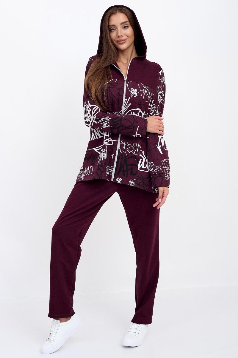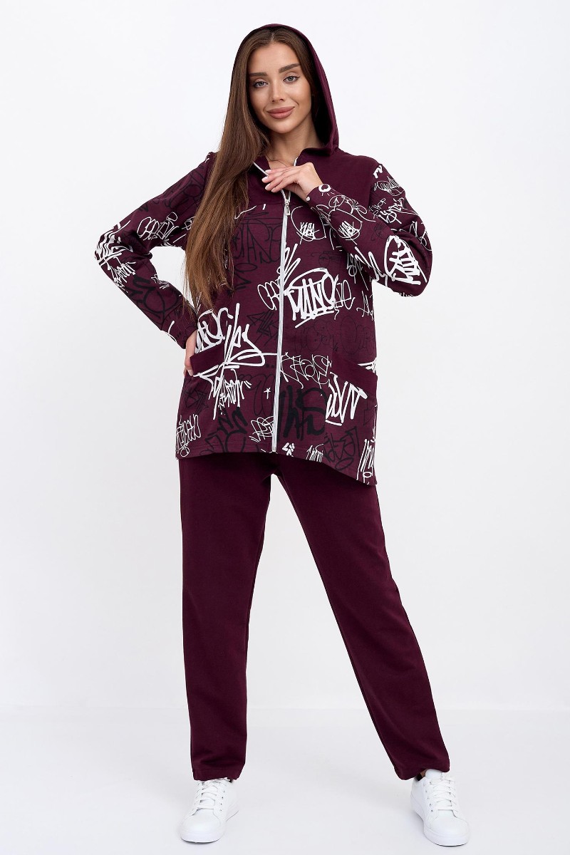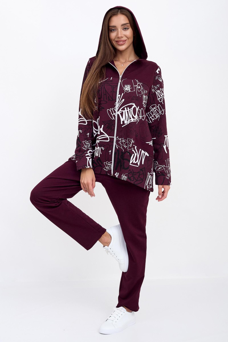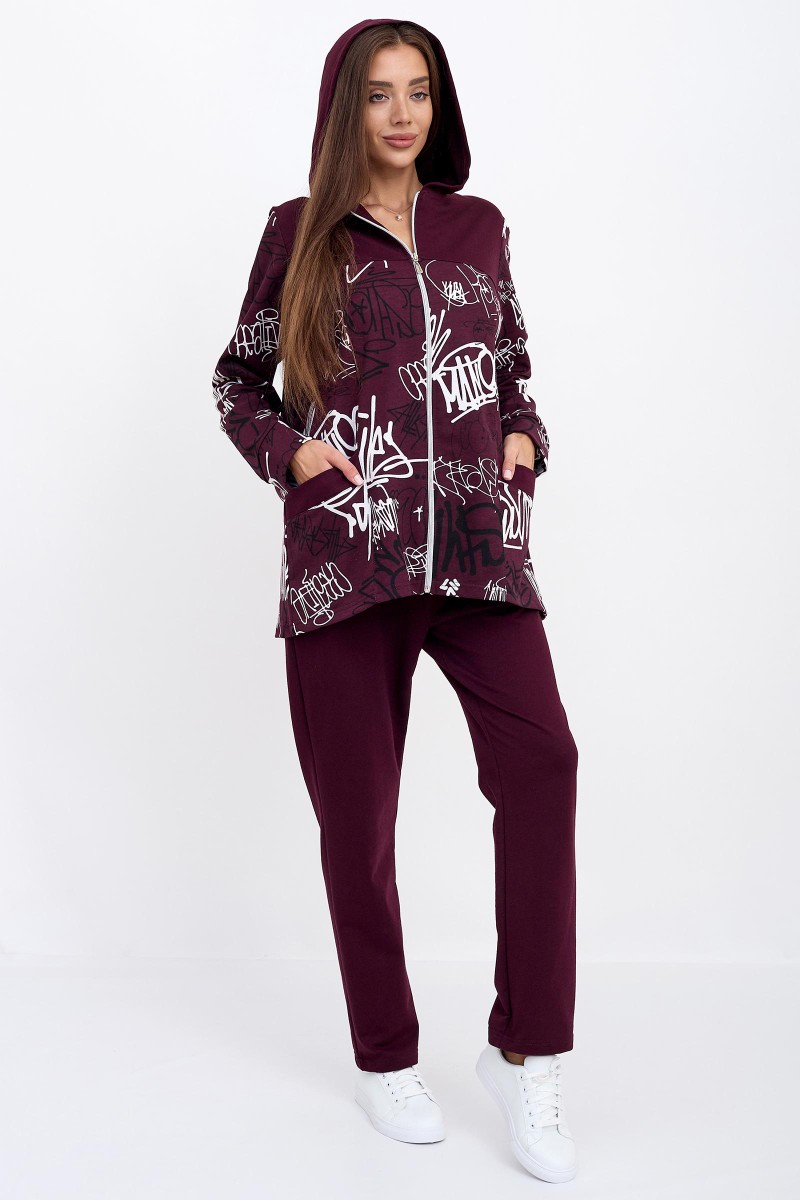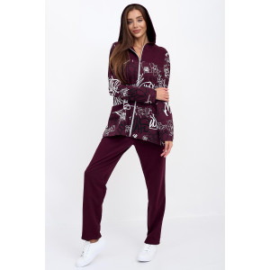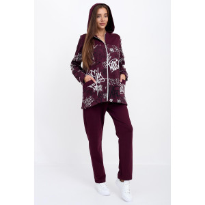 Представляем Вашему вниманию оригинальный женский костюм, в который можно влюбиться с первого взгляда. Сам костюм очень удобен и комфортен для ношения. Куртка прямого кроя с карманами, капюшоном и застёжкой на молнию. Основание куртки с рисунком, а кокетка и капюшон выполнены из однотонной ткани. Брюки прямые, в однотонном цвете. Удобную посадку изделия обеспечивает поясная резинка. Прекрасный костюм для дома, отдыха или спорта.