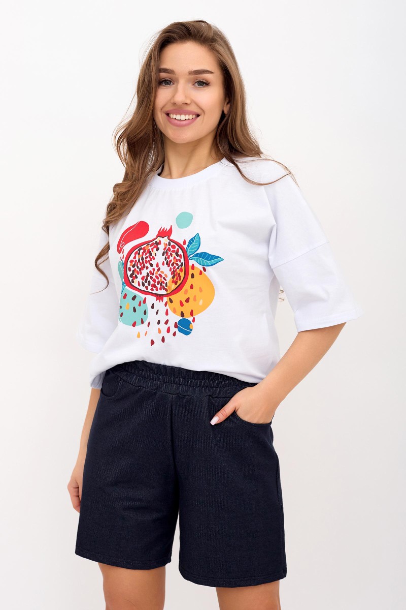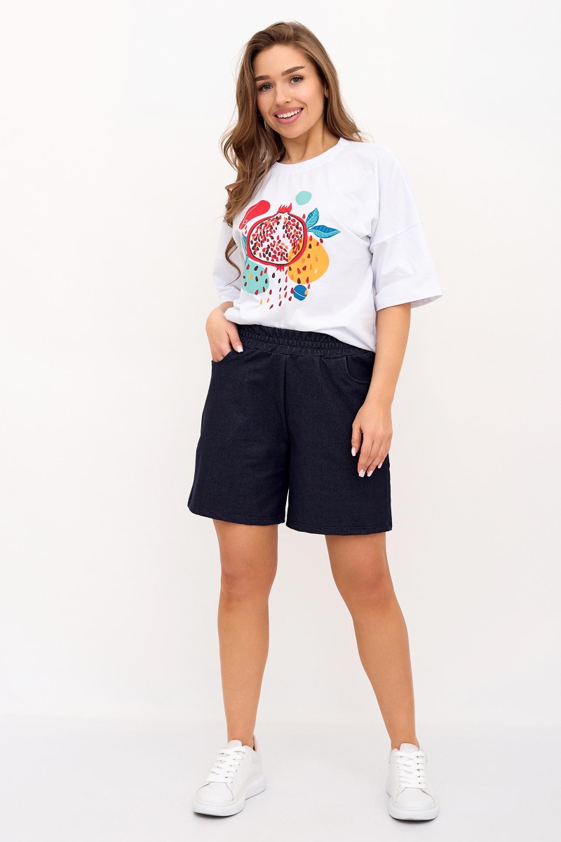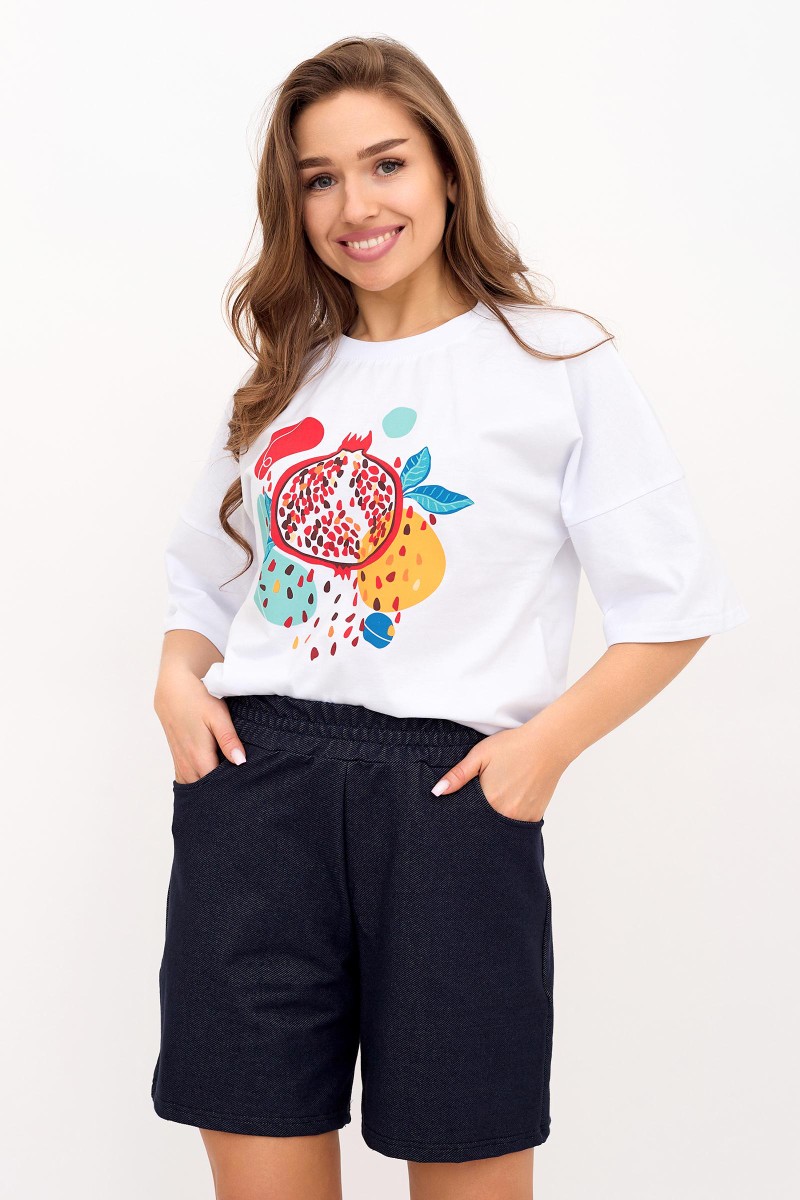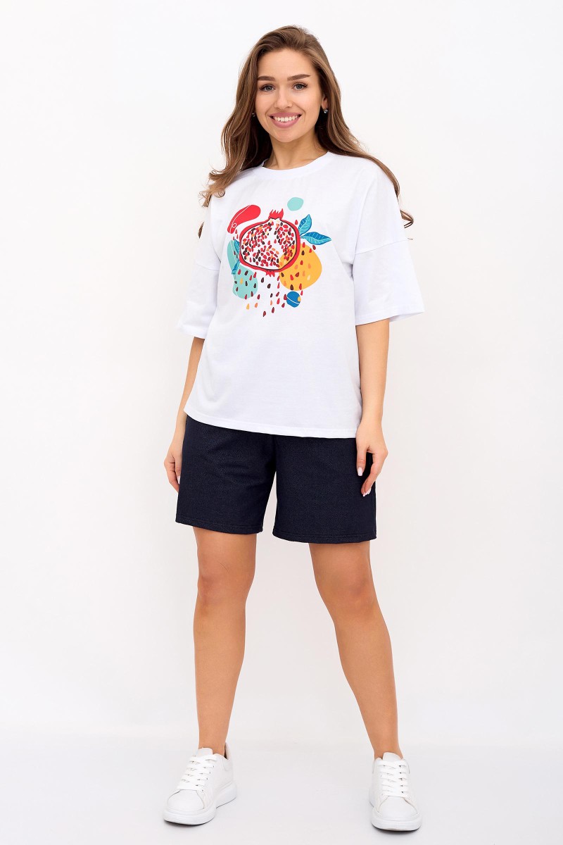 Представляем Вашему вниманию легкий женский костюм двойку, состоящий из футболки и шорт. Комплект имеет интересную расцветку, которая красиво смотрится и поднимает настроение. Костюм хорошо сидит на фигуре и подчеркивает её достоинства. В нём Вы будете чувствовать себя комфортно и уверенно.