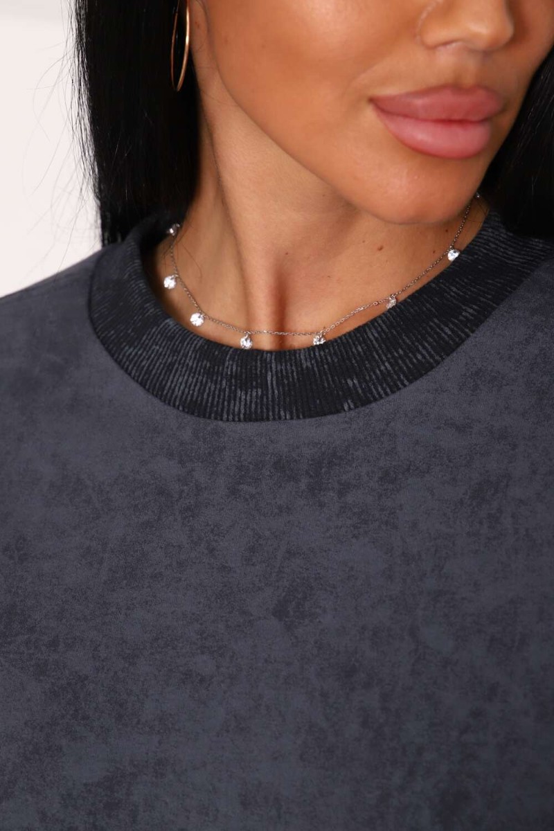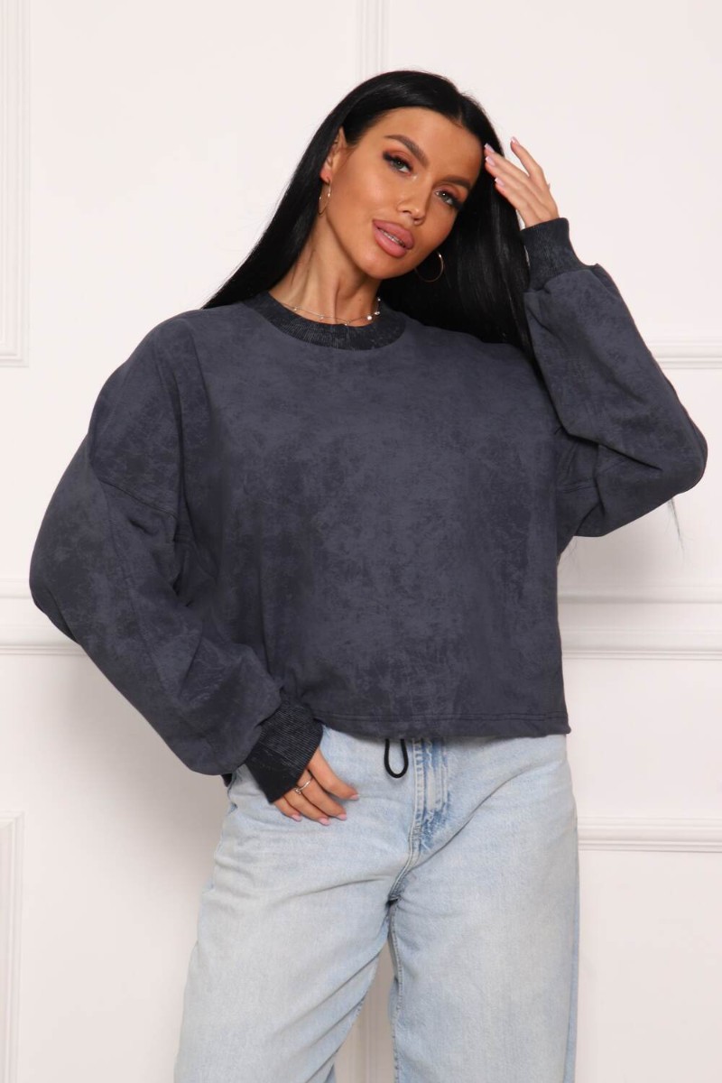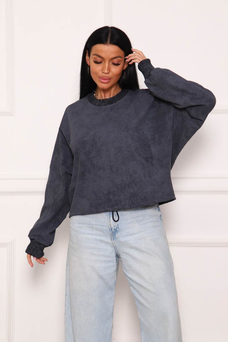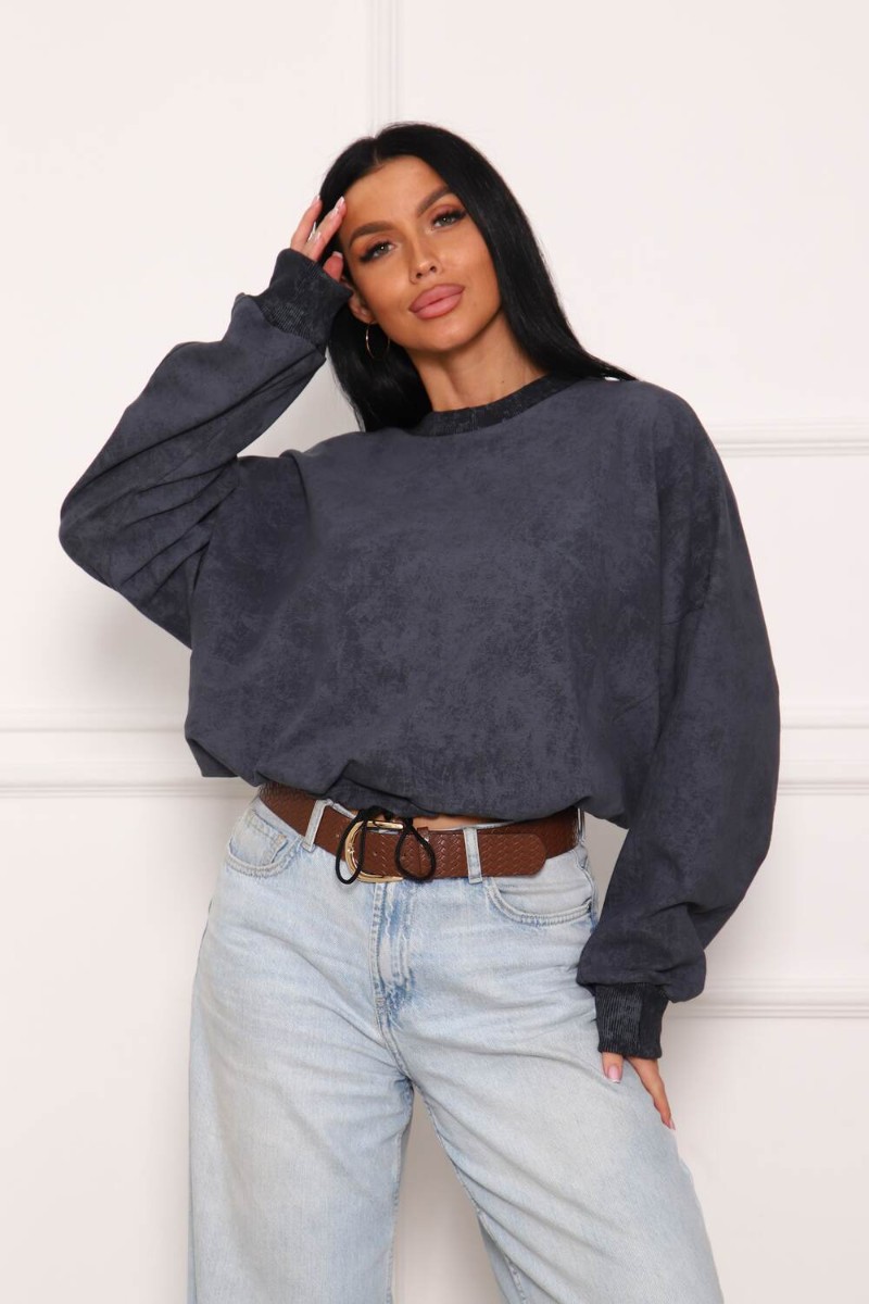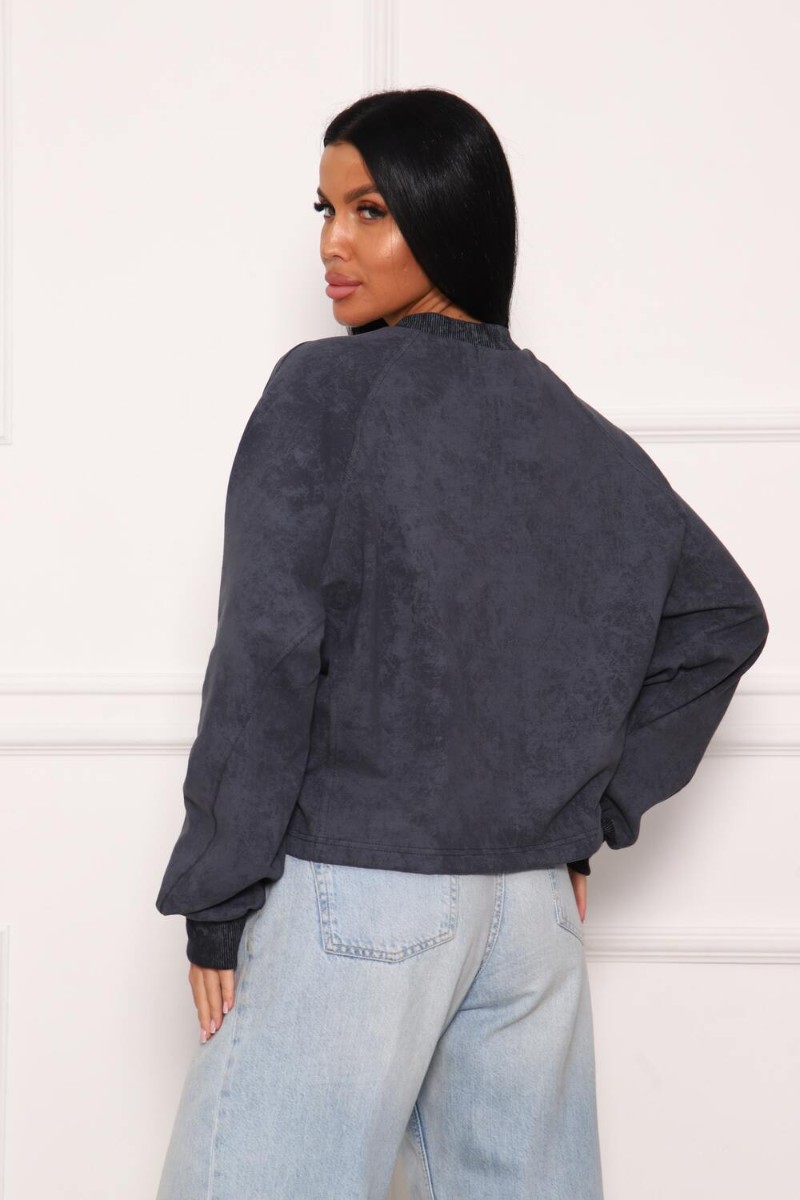 Представляем Вашему вниманию свитшот женский сложного кроя, из трикотажного полотна с напылением, которое создает эффект стиля винтаж. Свитшот свободного облегания, рукав летучая мышь, на манжете. Горловина круглой формы, обработана обтачкой. Низ изделия на регулируемой кулисе со шнуром. Манжеты и обтачка горловины выполнены из кашкорсе в цвет основной ткани.