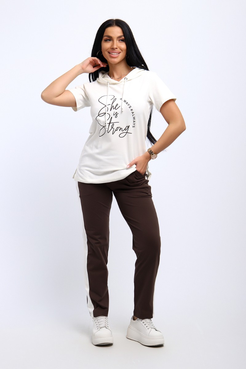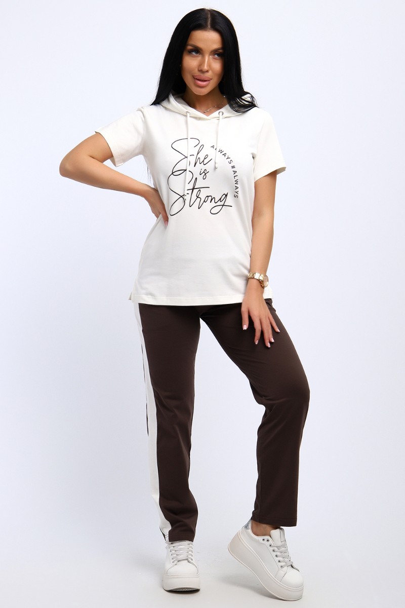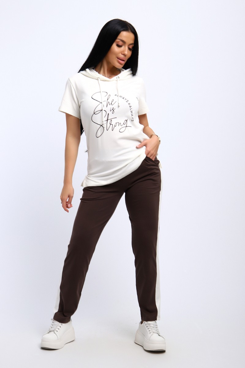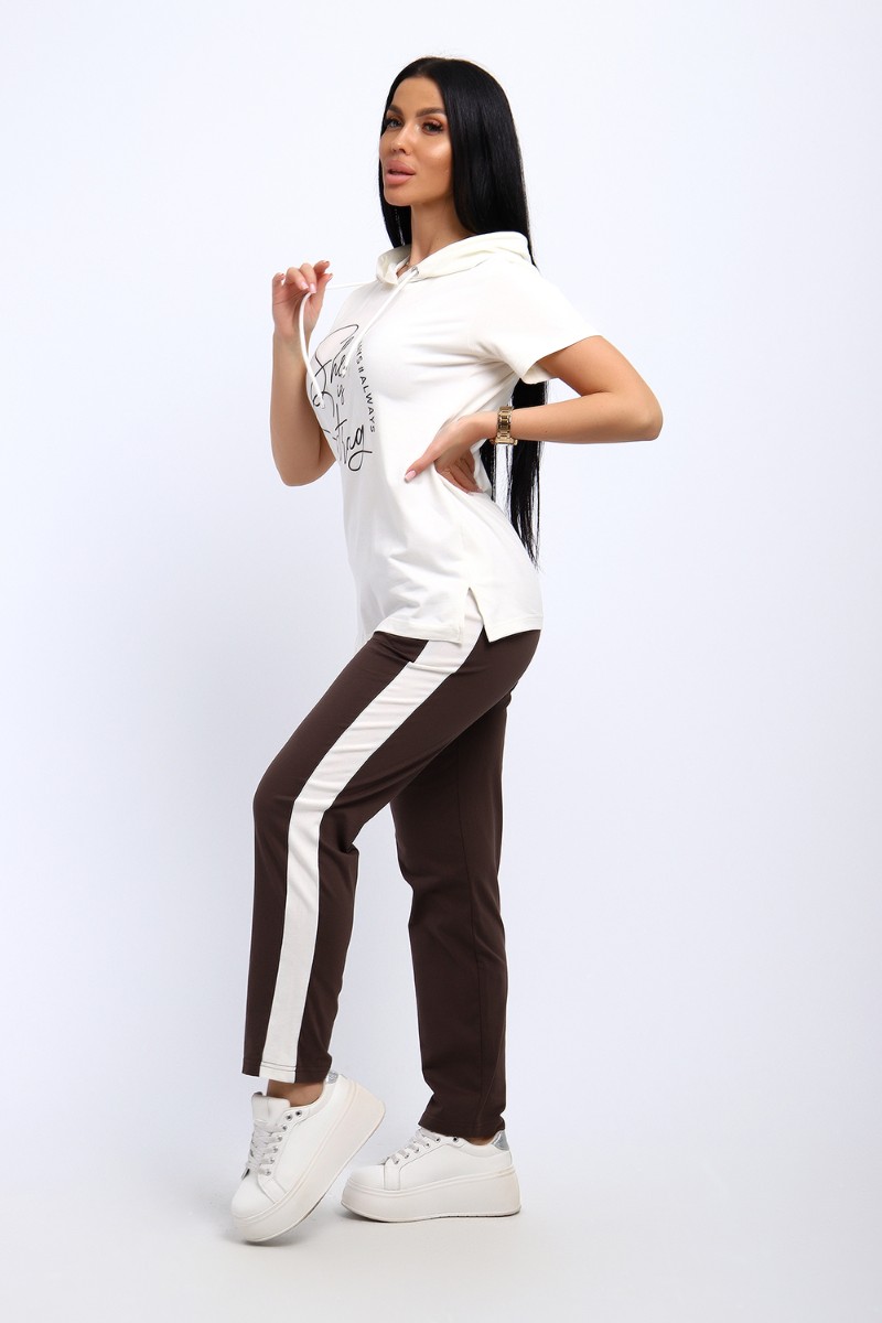 Представляем Вашему вниманию удобный, женственный трикотажный костюм со спортивной ноткой подарит вам чувство комфорта и позволит выглядеть сногсшибательно в любой ситуации! Костюм прекрасно подойдет для занятий спортом, пробежек или прогулок! Кофта белого цвета, с надписью латинскими буквами в цвет брюк, имеет капюшон, способный защитить волосы от солнечных лучей, ветра или дождя. Объем капюшона регулирует изящный шнурок. На брюках имеются лампасы белого цвета, гармонирующие с цветом кофты.