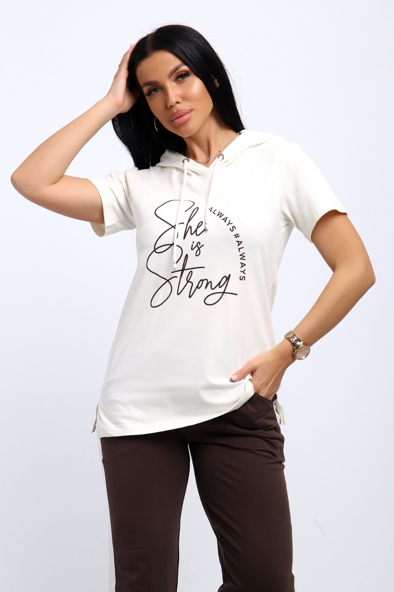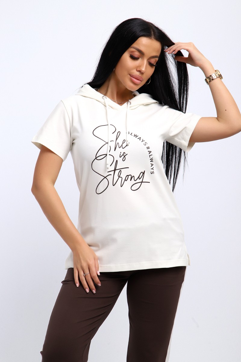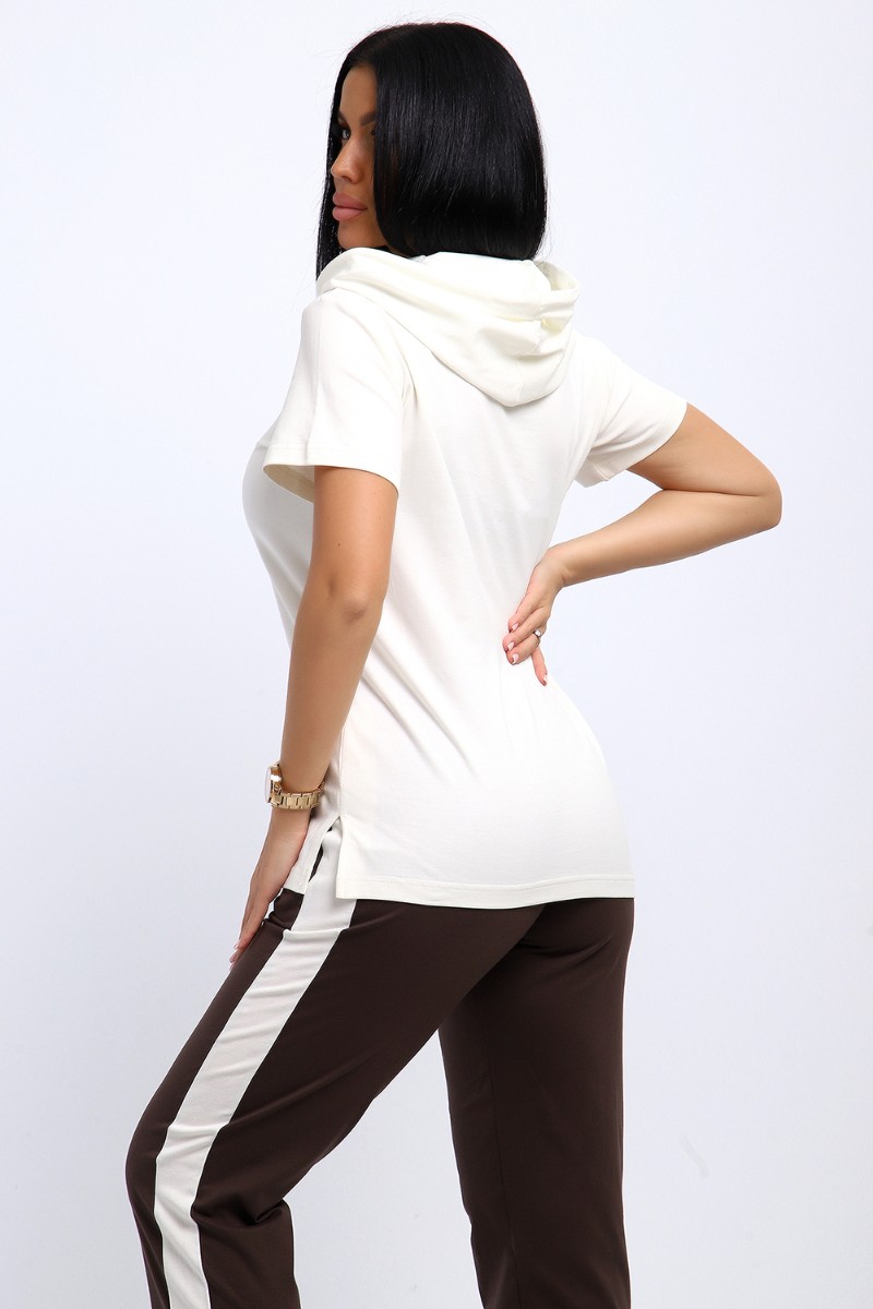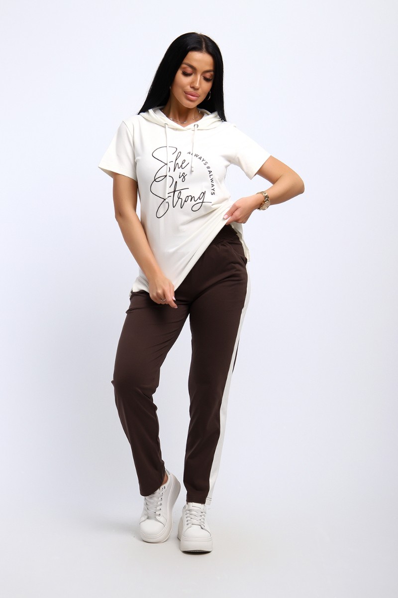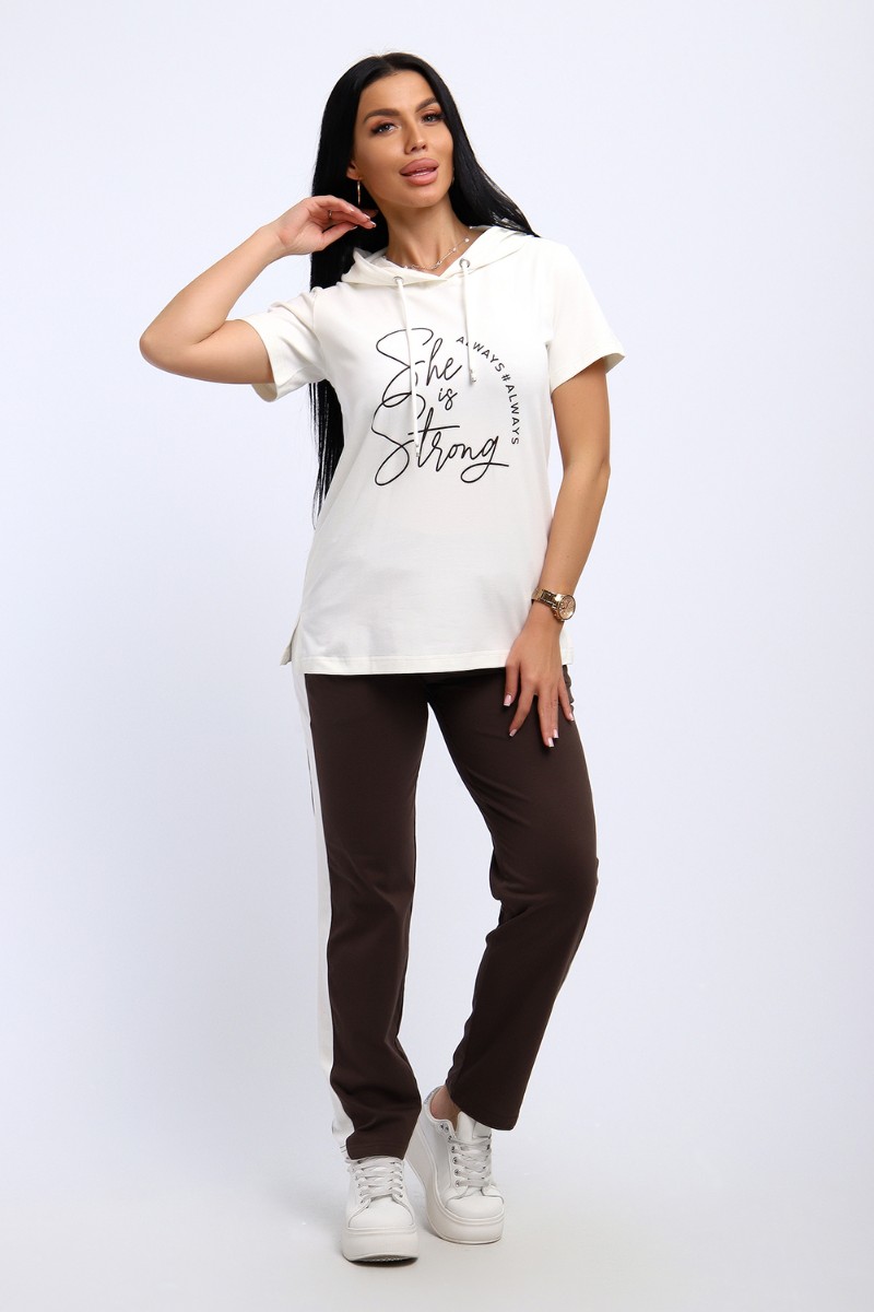 Представляем Вашему вниманию удобный, женственный трикотажный костюм со спортивной ноткой подарит вам чувство комфорта и позволит выглядеть сногсшибательно в любой ситуации! Костюм прекрасно подойдет для занятий спортом, пробежек или прогулок! Кофта белого цвета, с надписью латинскими буквами в цвет брюк, имеет капюшон, способный защитить волосы от солнечных лучей, ветра или дождя. Объем капюшона регулирует изящный шнурок. На брюках имеются лампасы белого цвета, гармонирующие с цветом кофты.