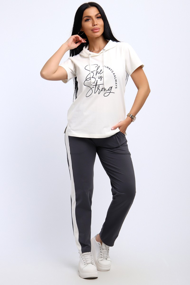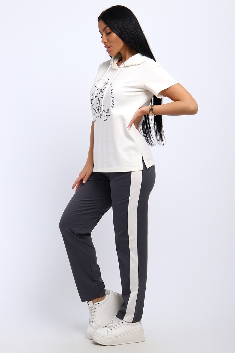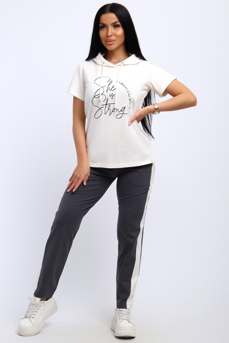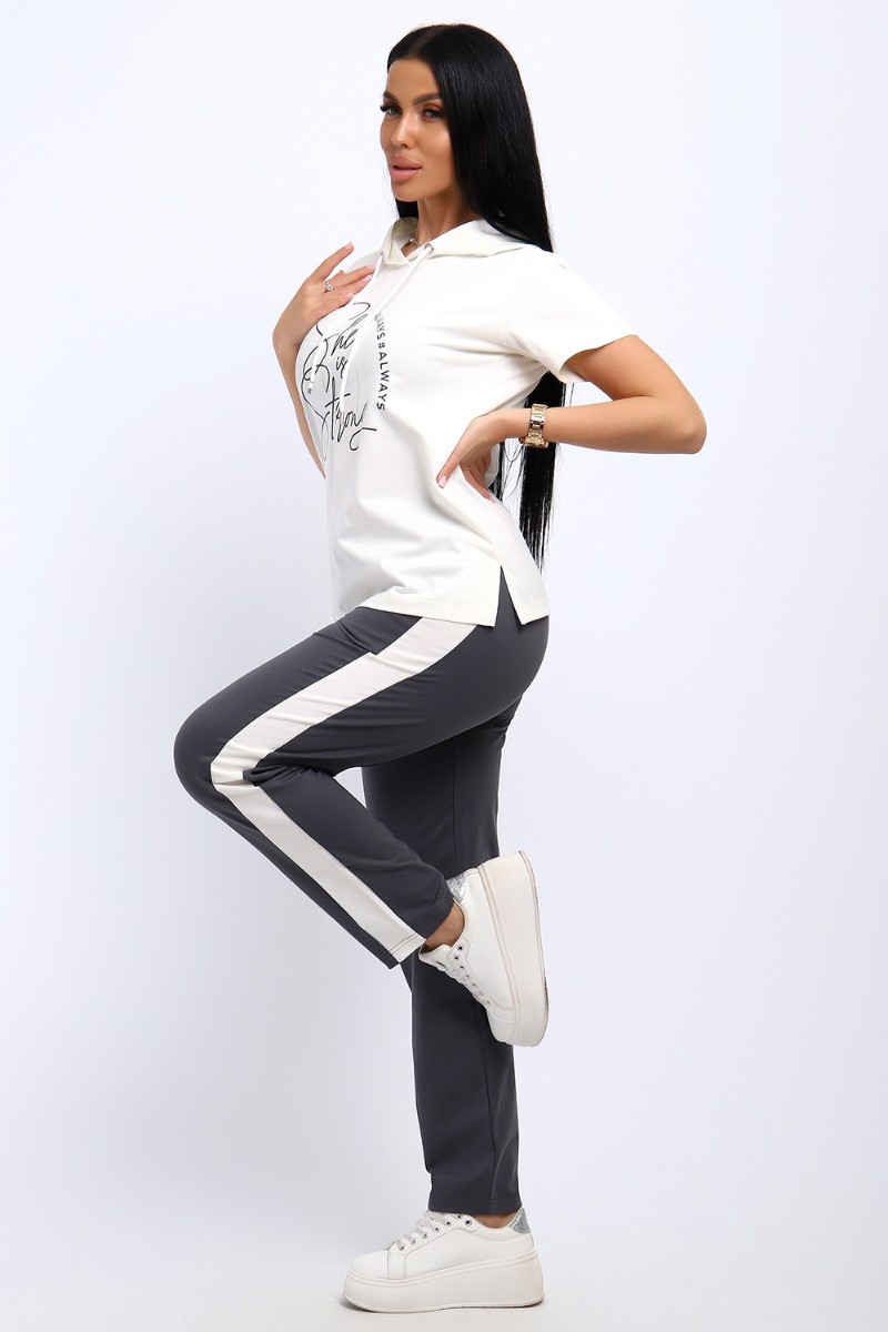 Представляем Вашему вниманию удобный, женственный трикотажный костюм со спортивной ноткой подарит вам чувство комфорта и позволит выглядеть сногсшибательно в любой ситуации! Костюм прекрасно подойдет для занятий спортом, пробежек или прогулок! Кофта белого цвета, с надписью латинскими буквами в цвет брюк, имеет капюшон, способный защитить волосы от солнечных лучей, ветра или дождя. Объем капюшона регулирует изящный шнурок. На брюках имеются лампасы белого цвета, гармонирующие с цветом кофты.