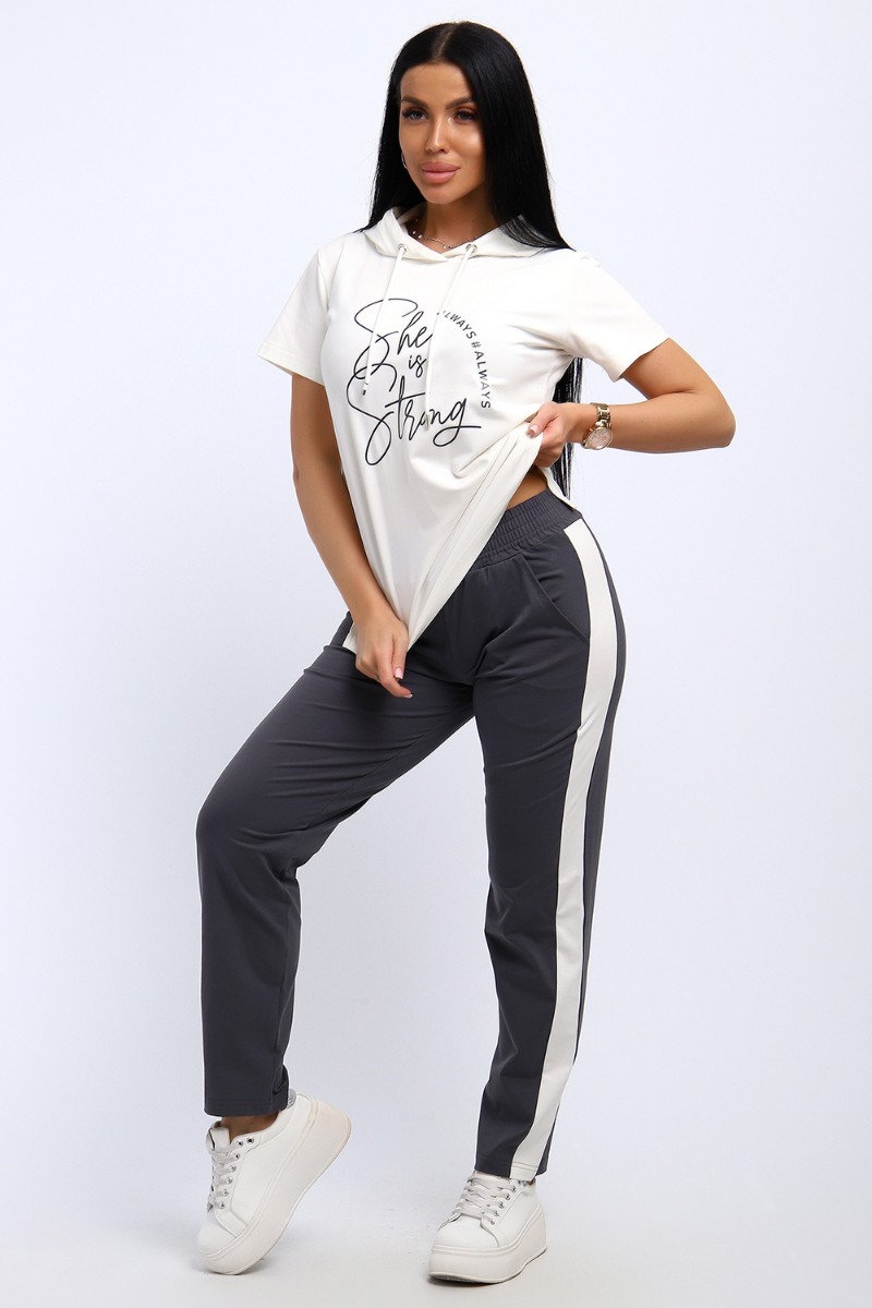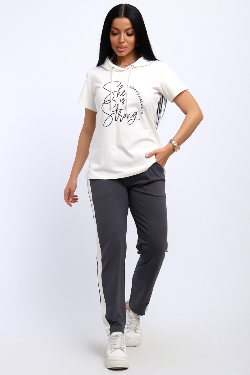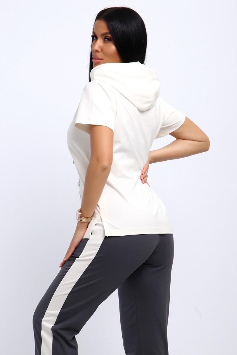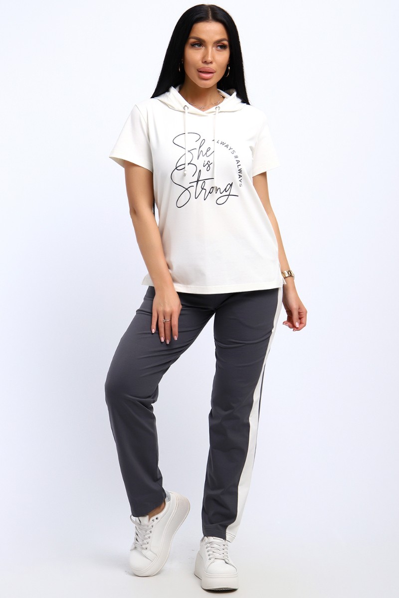 Представляем Вашему вниманию удобный, женственный трикотажный костюм со спортивной ноткой подарит вам чувство комфорта и позволит выглядеть сногсшибательно в любой ситуации! Костюм прекрасно подойдет для занятий спортом, пробежек или прогулок! Кофта белого цвета, с надписью латинскими буквами в цвет брюк, имеет капюшон, способный защитить волосы от солнечных лучей, ветра или дождя. Объем капюшона регулирует изящный шнурок. На брюках имеются лампасы белого цвета, гармонирующие с цветом кофты.