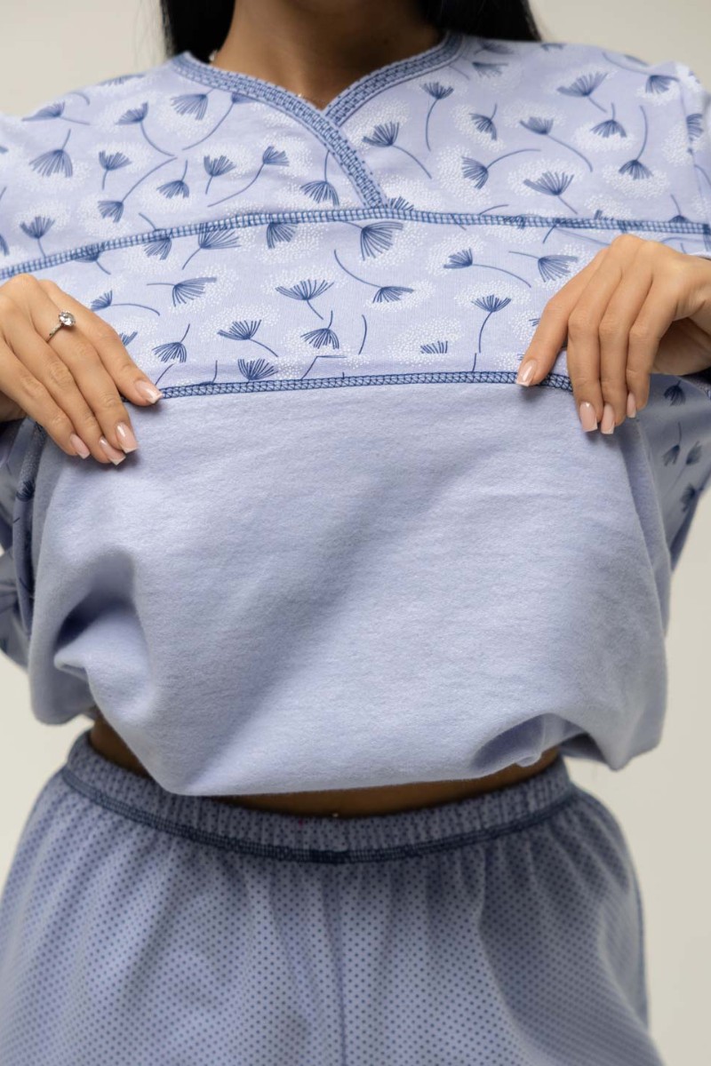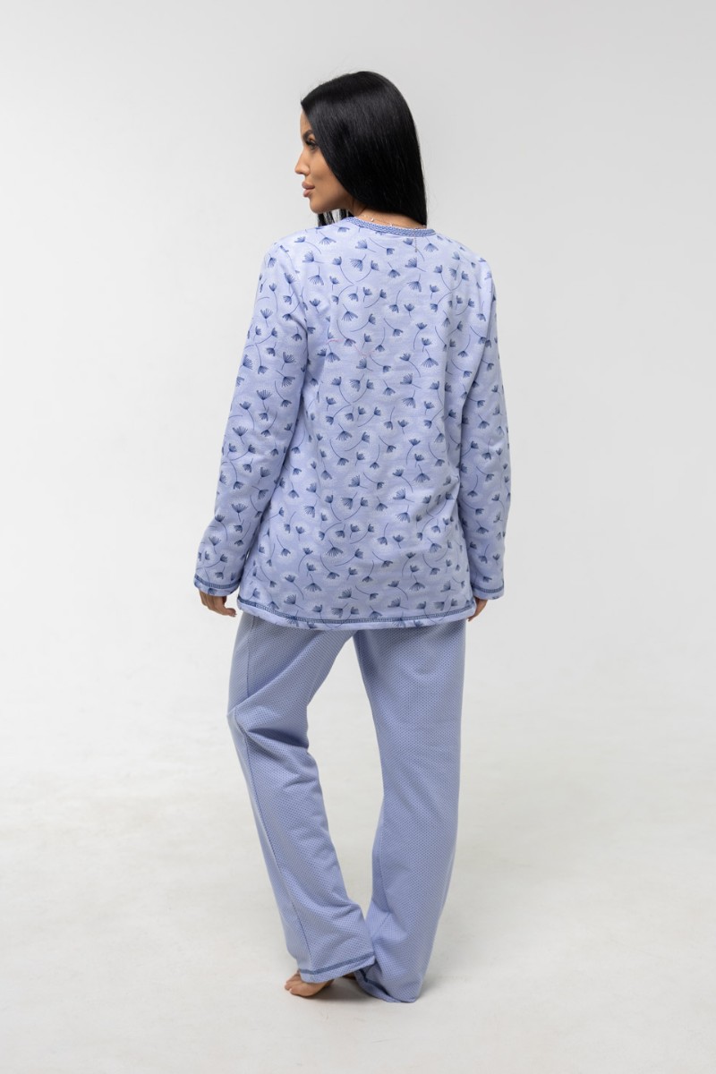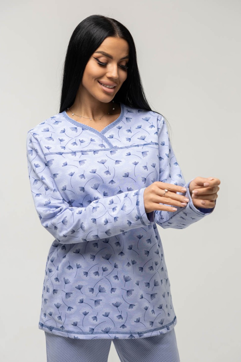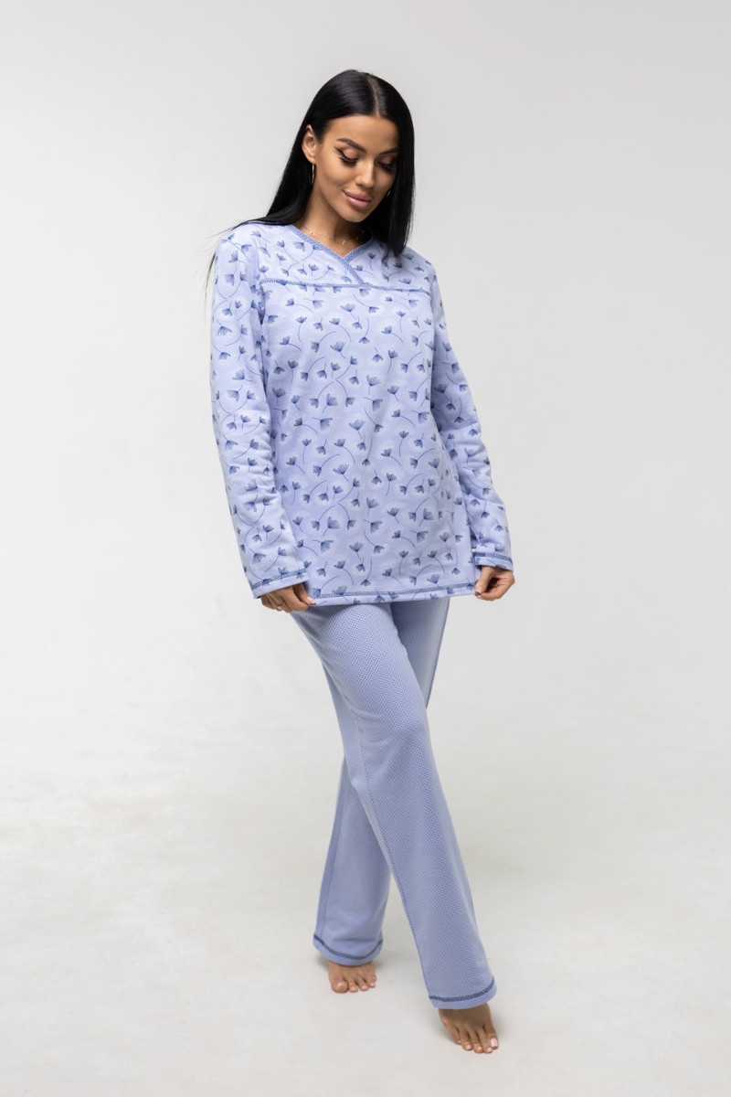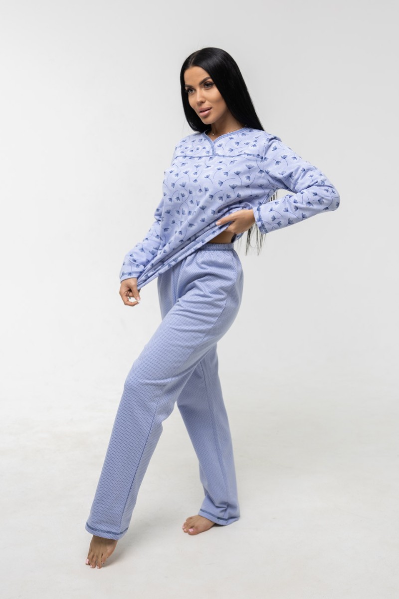 Представляем Вашему вниманию женскую пижаму, сшитую из приятной трикотажной ткани с мягким начесом. Отличный комплект для сна и отдыха, в нем Вы будете засыпать с комфортом. Пижама выполнена из тканей компаньонов, которые идеально подходят друг другу. Верх свободного силуэта, не сковывает движения, с кокеткой на запах. Брюки свободного силуэта, полноценной длины, без карманов.