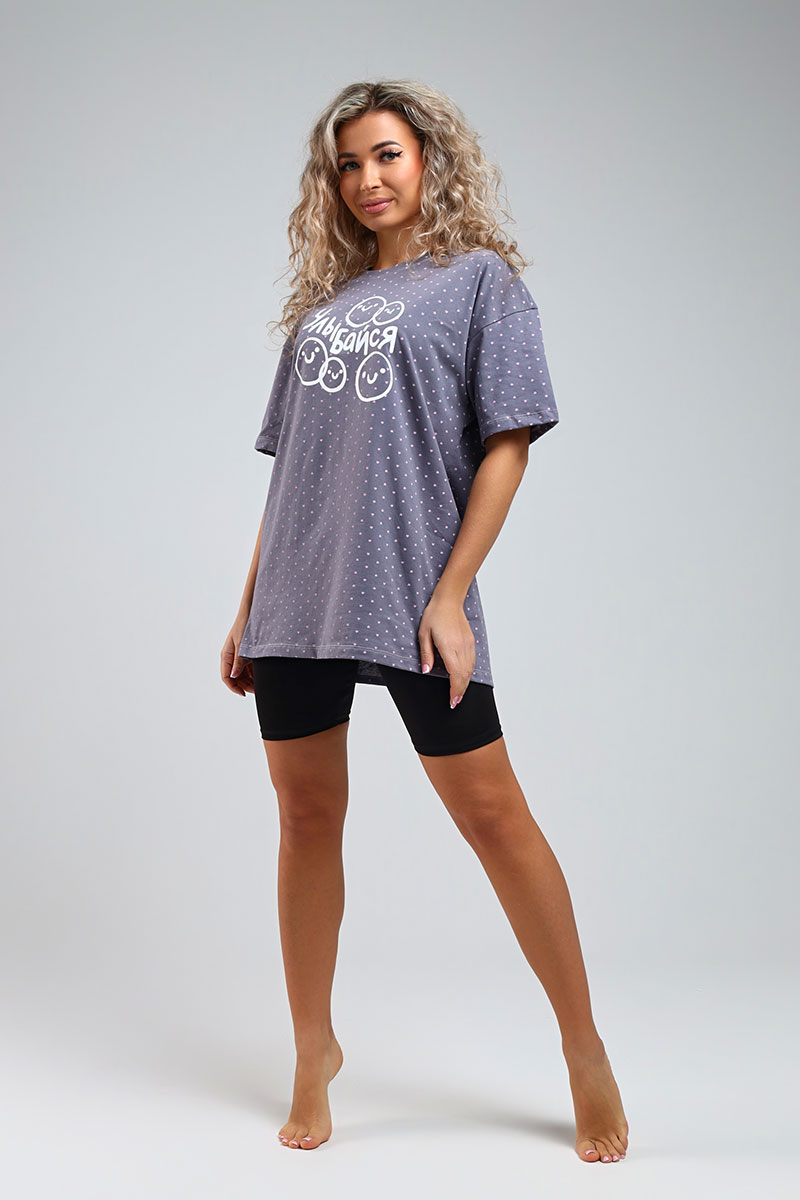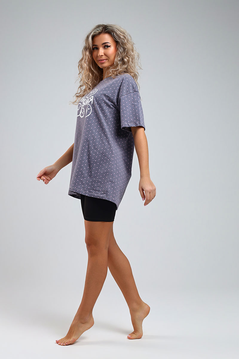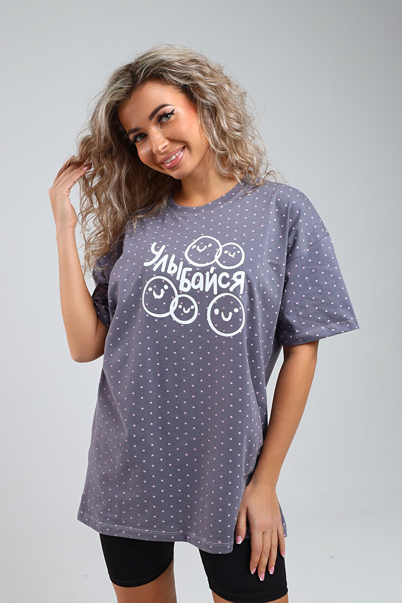 Представляем Вашему вниманию футболку женскую, удлиненную. Силуэт свободный. Данная модель имеет округлый вырез и спущенный рукав, что придает ей дополнительный неповторимый шарм. На полочке печатный рисунок в виде надписи.