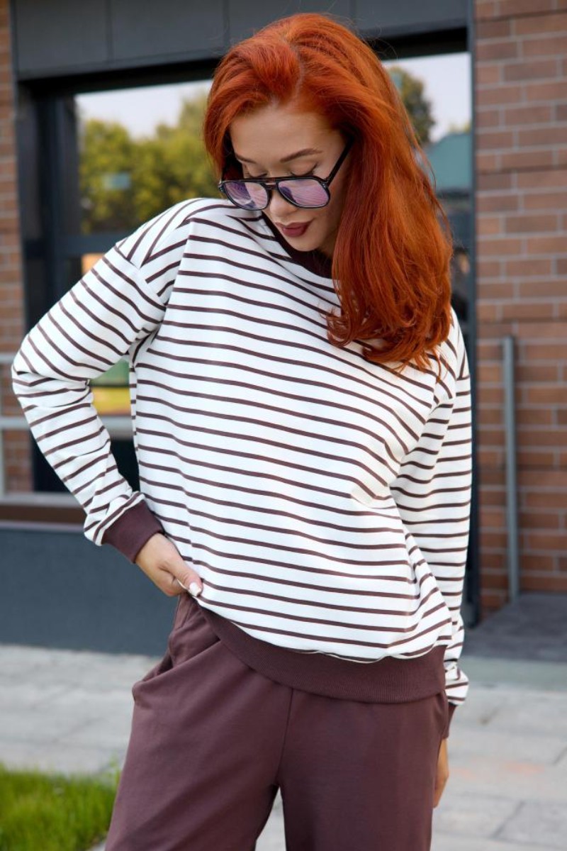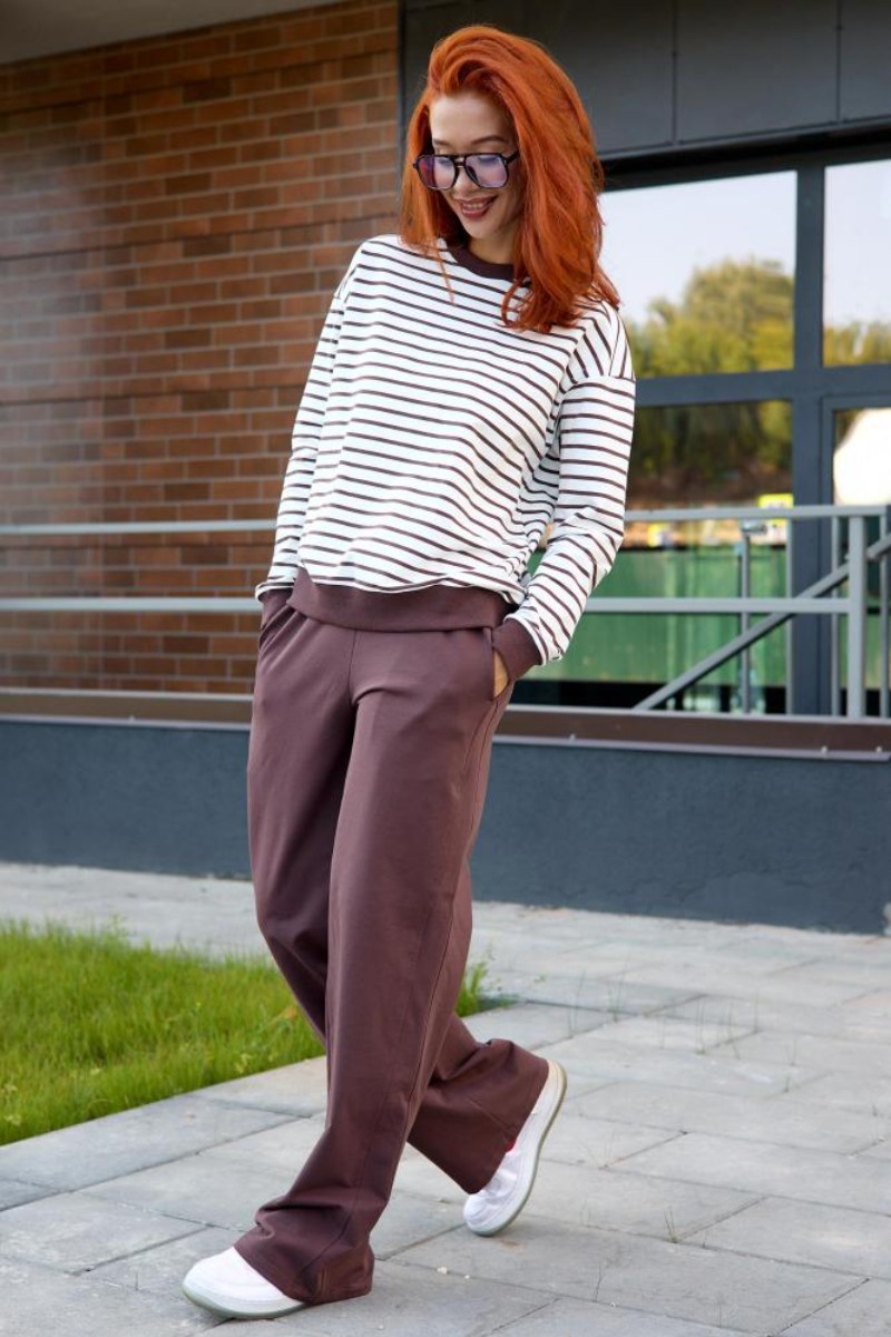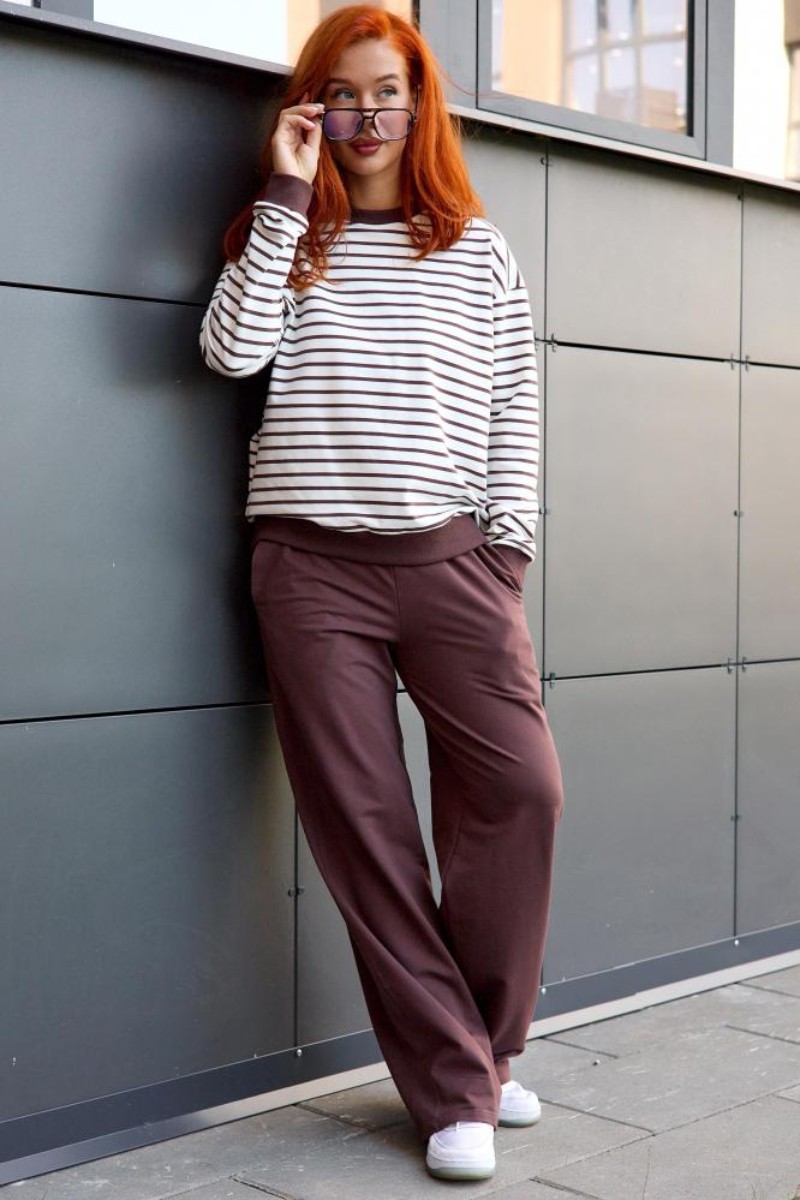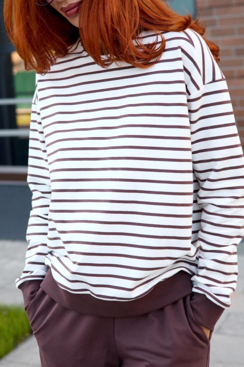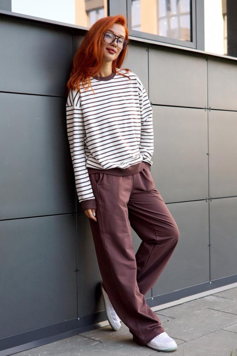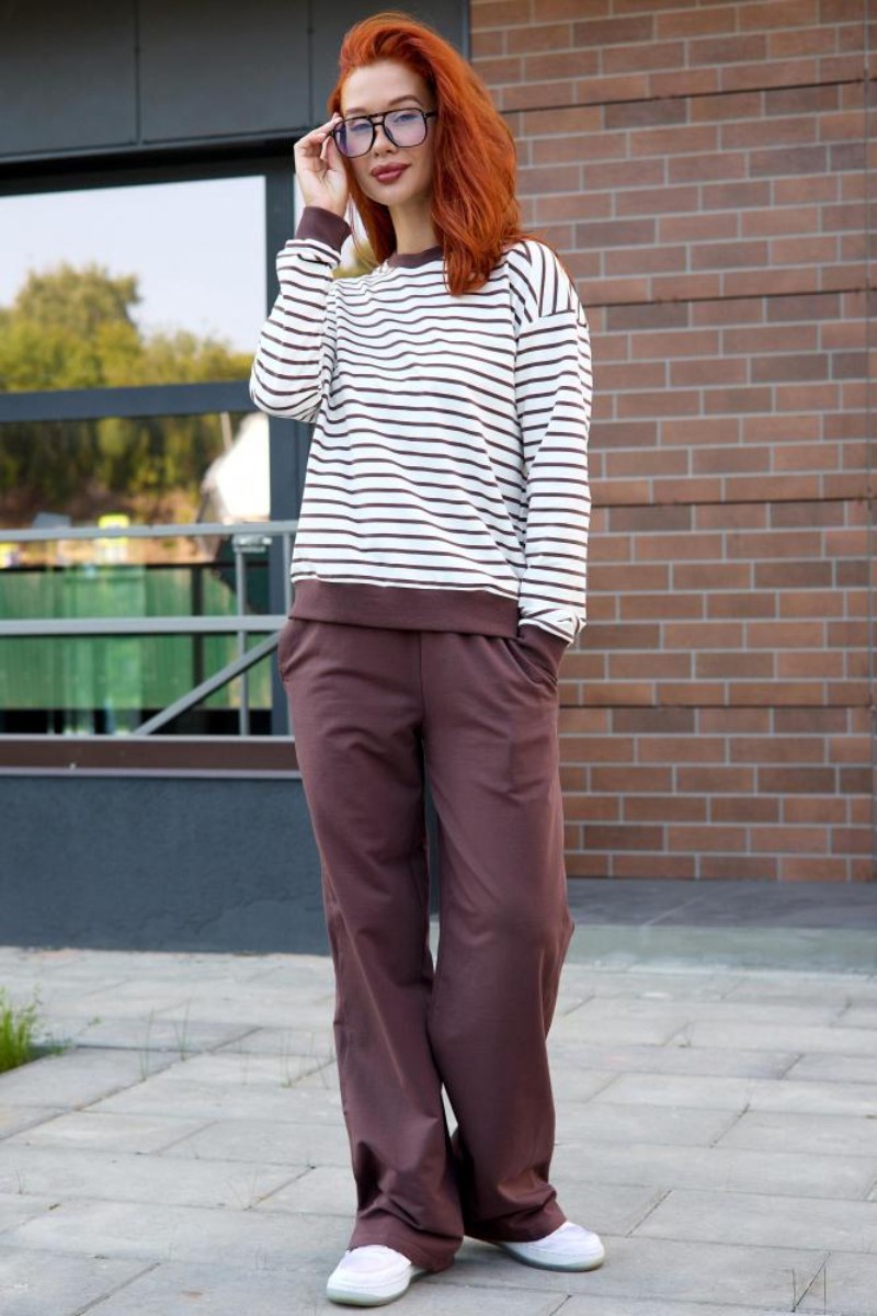 Представляем Вашему вниманию женский костюм двойку, который состоит из однотонных брюк и свитшота в тонкую полоску. Комплект обеспечит полную свободу движений в повседневной носке. В нём Вы будете чувствовать себя комфортно и уверенно.
