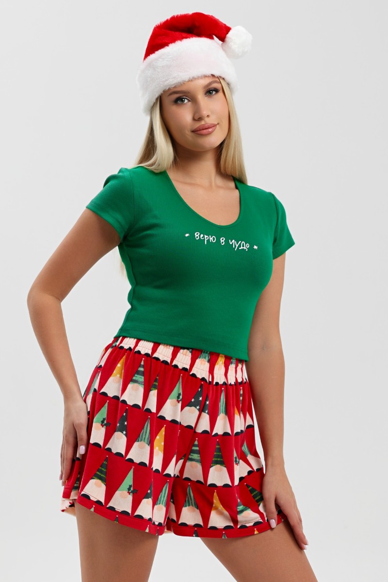 Представляем Вашему вниманию костюм молодежный из трикотажного полотна двух видов: «кашкорсе» и «велюр стрейч», состоящий из футболки и шорт. Футболка – из гладкокрашеного полотна «кашкорсе», классического покроя, с короткими втачными рукавами, горловиной V-образной формы, окантованной основным материалом, принтом на полочке, выполненным в технике «шелкографии».Шорты – из полотна «велюр стрейч » с набивным рисунком, средней длины, широкие, с эластичной тесьмой по талии.