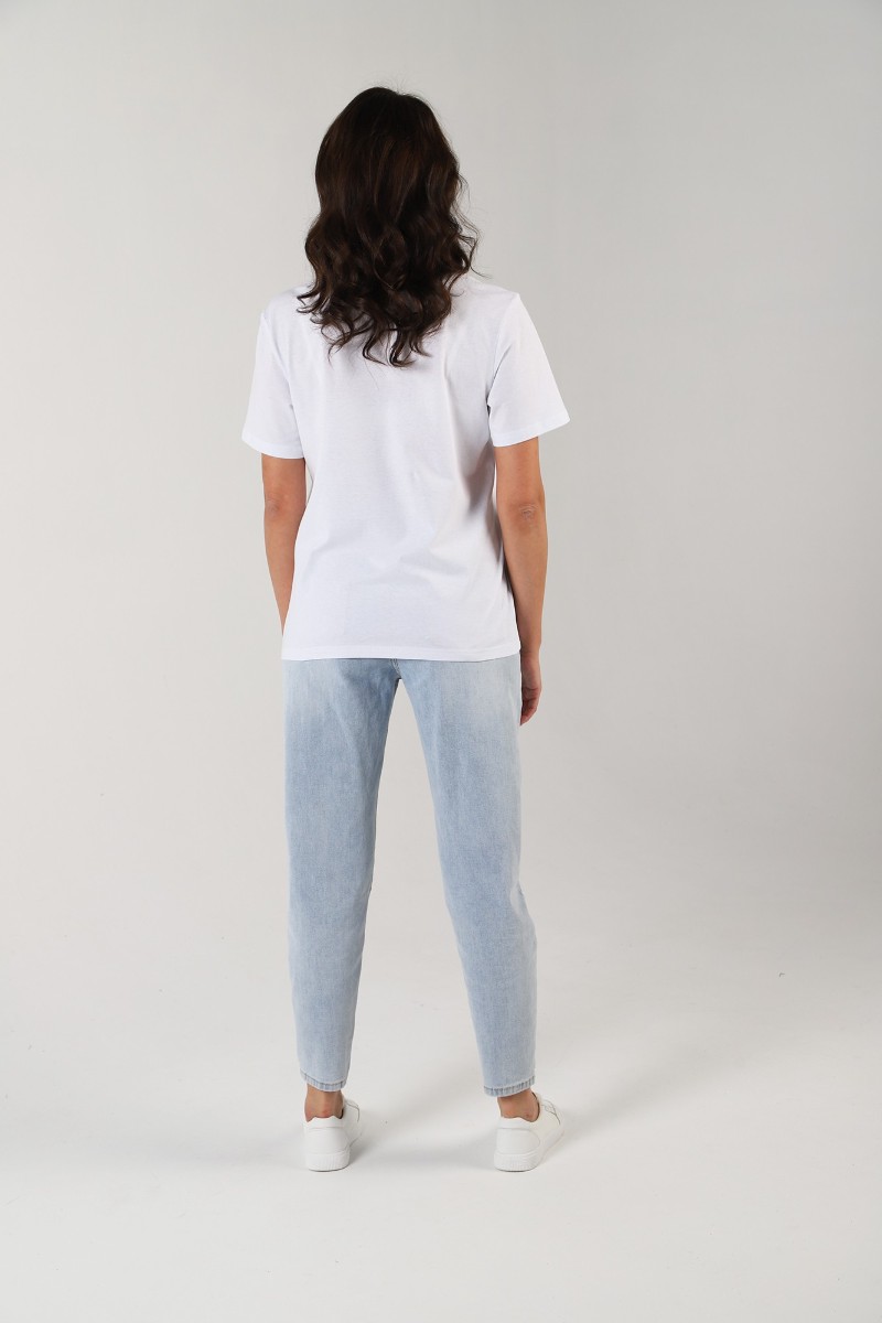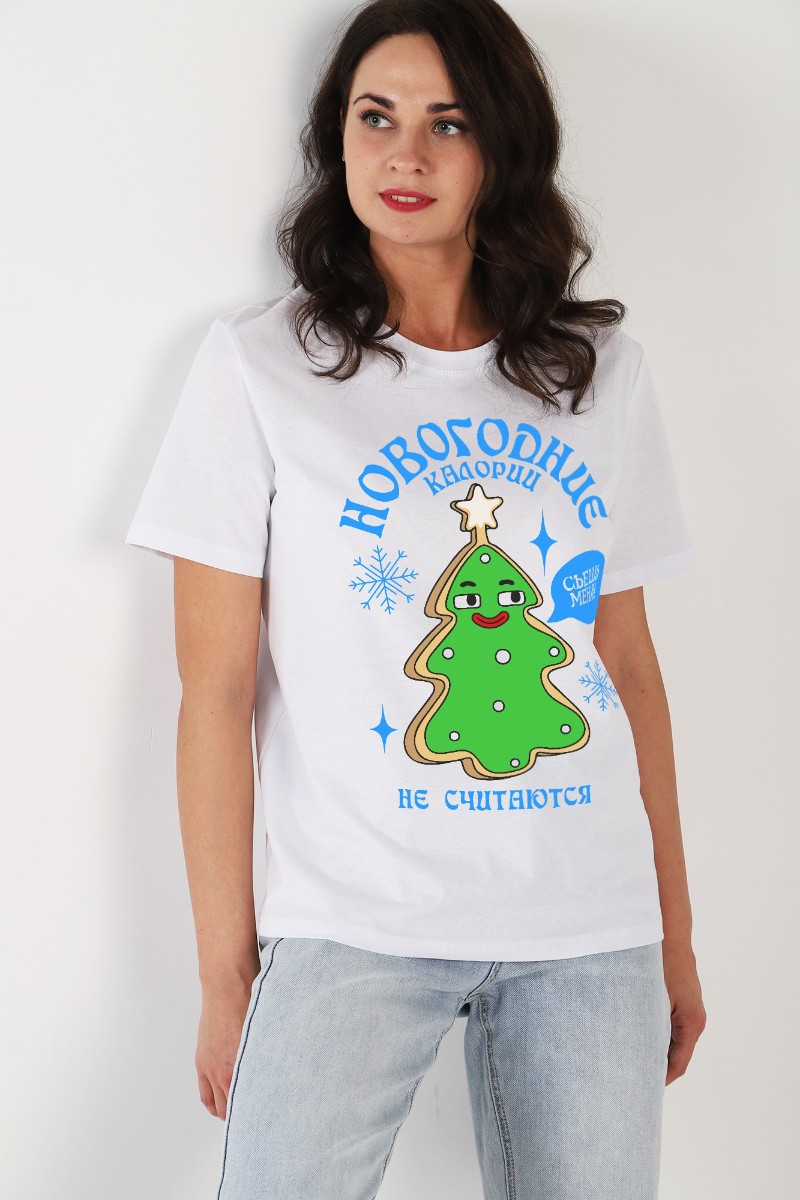 Представляем Вашему вниманию женскую футболку классического покроя: с короткими втачными рукавами, горловиной овальной формы, обработанной втачной планкой, и принтом в центре переда, выполненным в технике шелкографии. По шву втачивания планки в горловину настрочена отделочная строчка на двухигольной машине. Нижние срезы рукавов и изделия обработаны подгибкой.