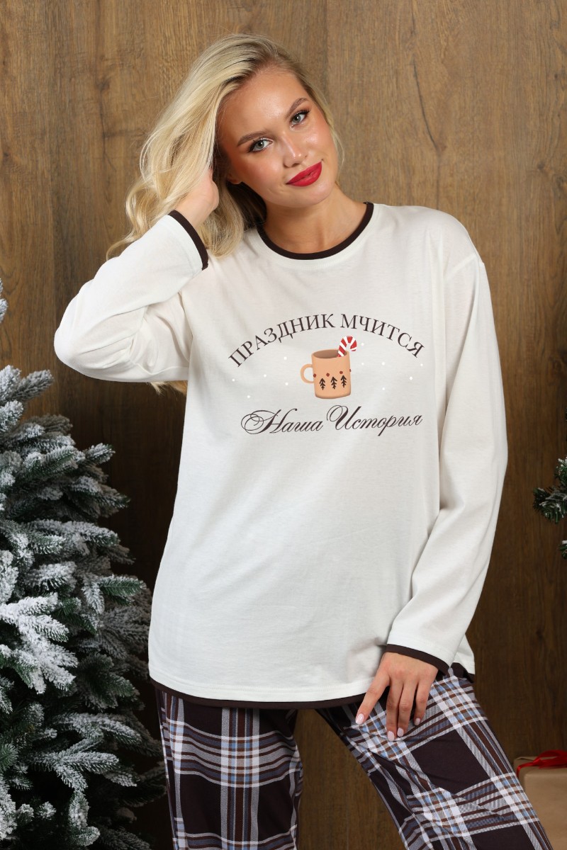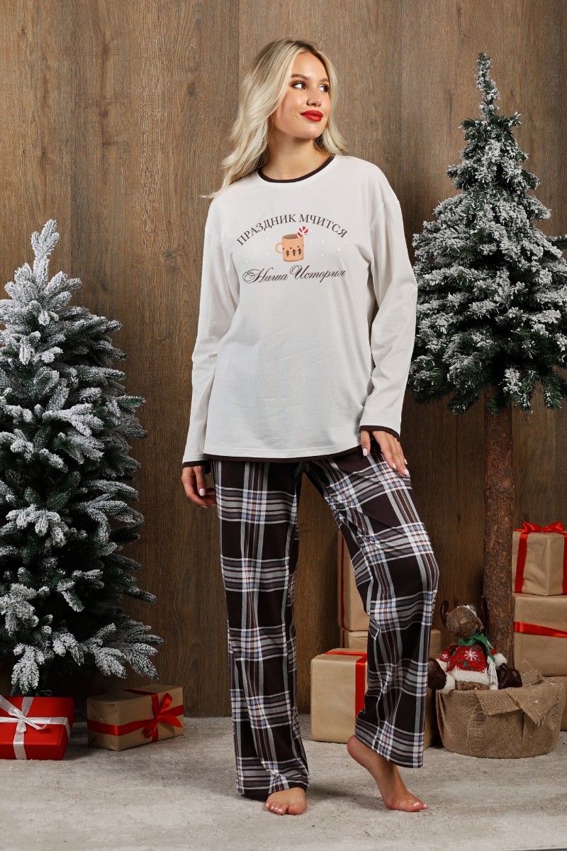 Представляем Вашему вниманию костюм женский из трикотажного полотна "кулирка" в комбинации двух видов: гладкокрашенного и с рисунком в крупную клетку, сочетающихся между собой по цвету, состоящий из джемпера и брюк. Джемпер - из гладкокрашеного полотна, свободного покроя, с длинными втачными рукавами и приспущенными плечами, с горловиной овальной формы и тематическим принтом, выполненным в технике шелкографии. Горловина, нижние срезы рукавов и низ изделия обработаны подгибкой с отделочным широким кантом контрастного цвета. Брюки - из полотна в клетку, свободного покроя, прямые, на притачном поясе с эластичной тесьмой внутри, с карманами в боковых швах. Нижние срезы обработаны подгибкой.