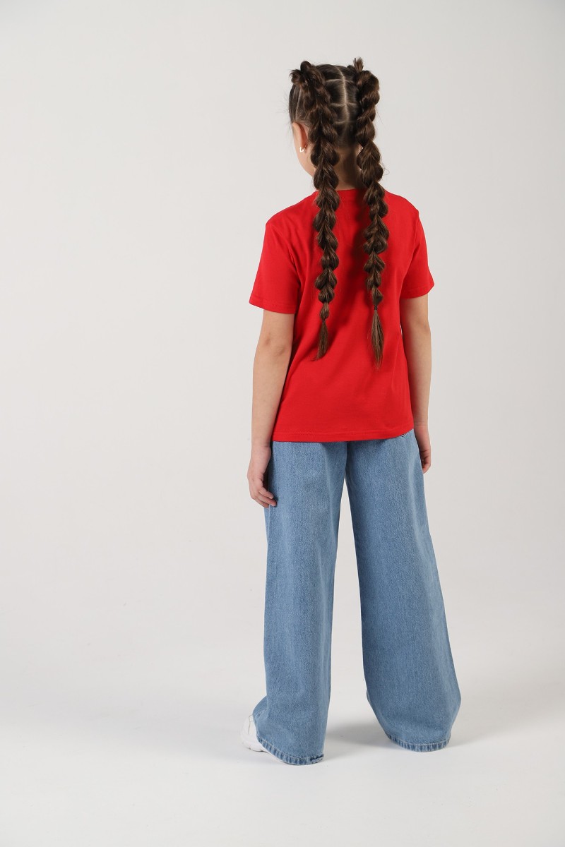 Представляем Вашему вниманию футболку для девочки классического покроя: с короткими втачными рукавами, горловиной овальной формы, обработанной втачной планкой, и принтом в центре переда, выполненным в технике шелкографии. По шву втачивания планки в горловину настрочена отделочная строчка на двухигольной машине. Нижние срезы рукавов и изделия обработаны подгибкой.