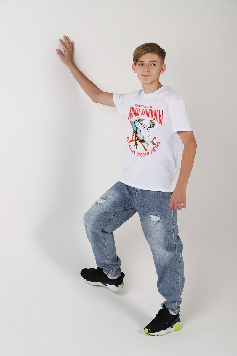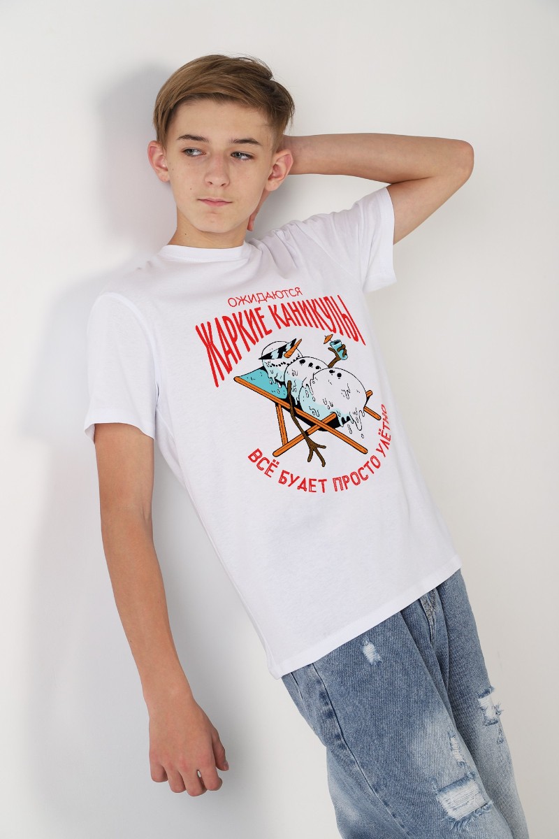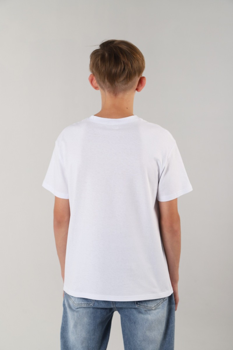Представляем Вашему вниманию футболку для мальчика классического покроя: с короткими втачными рукавами, горловиной овальной формы, обработанной втачной планкой, и принтом в центре переда, выполненным в технике шелкографии. По шву втачивания планки в горловину настрочена отделочная строчка на двухигольной машине. Нижние срезы рукавов и изделия обработаны подгибкой.