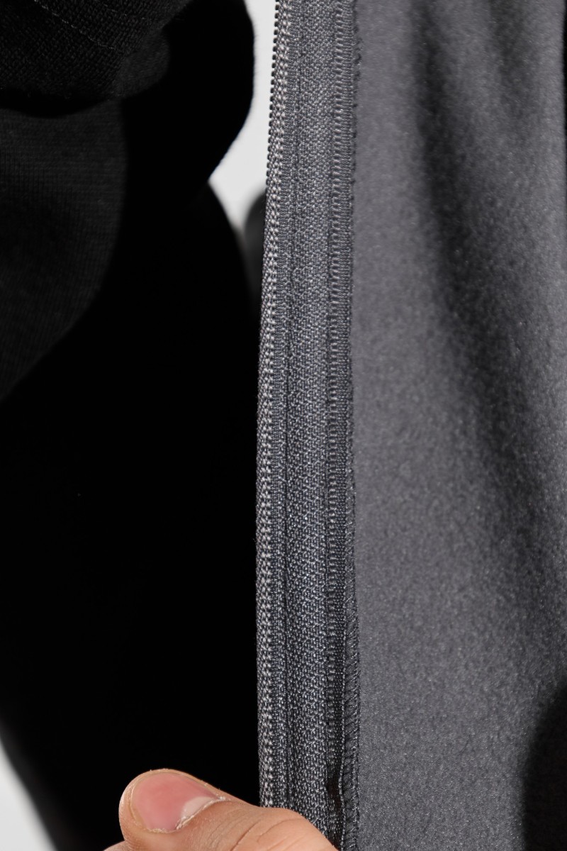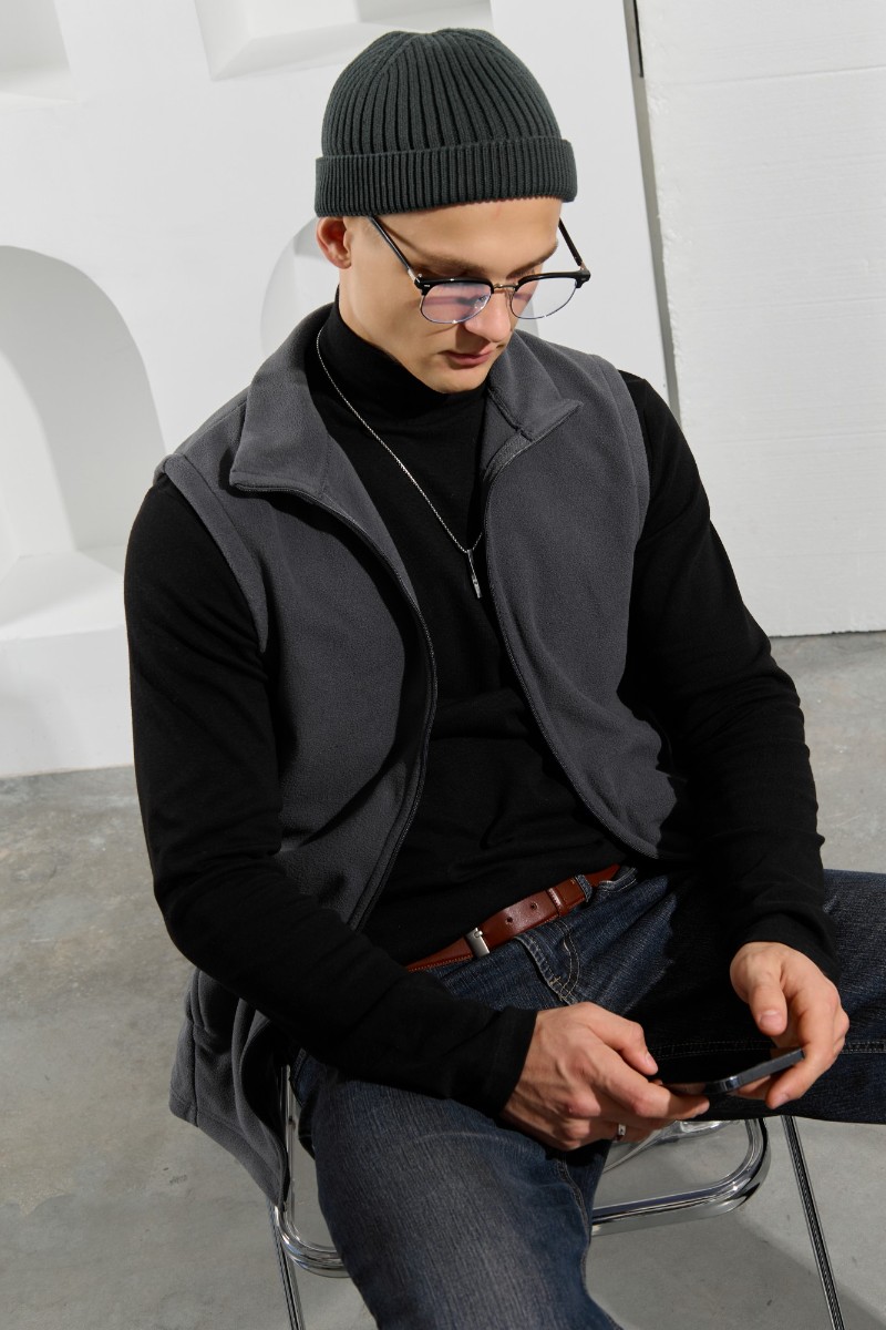 Представляем Вашему вниманию жилет мужской из флиса, прилегающего силуэта, с воротником-стойкой , центральной бортовой застежкой на тесьму "молния" и вертикальными рельефами на полочках, в швах которых обработаны карманы. Проймы и низ изделия обработаны подгибкой. В нижней части левого бокового шва вставлен небольшой декоративный элемент из репсовой ленты.