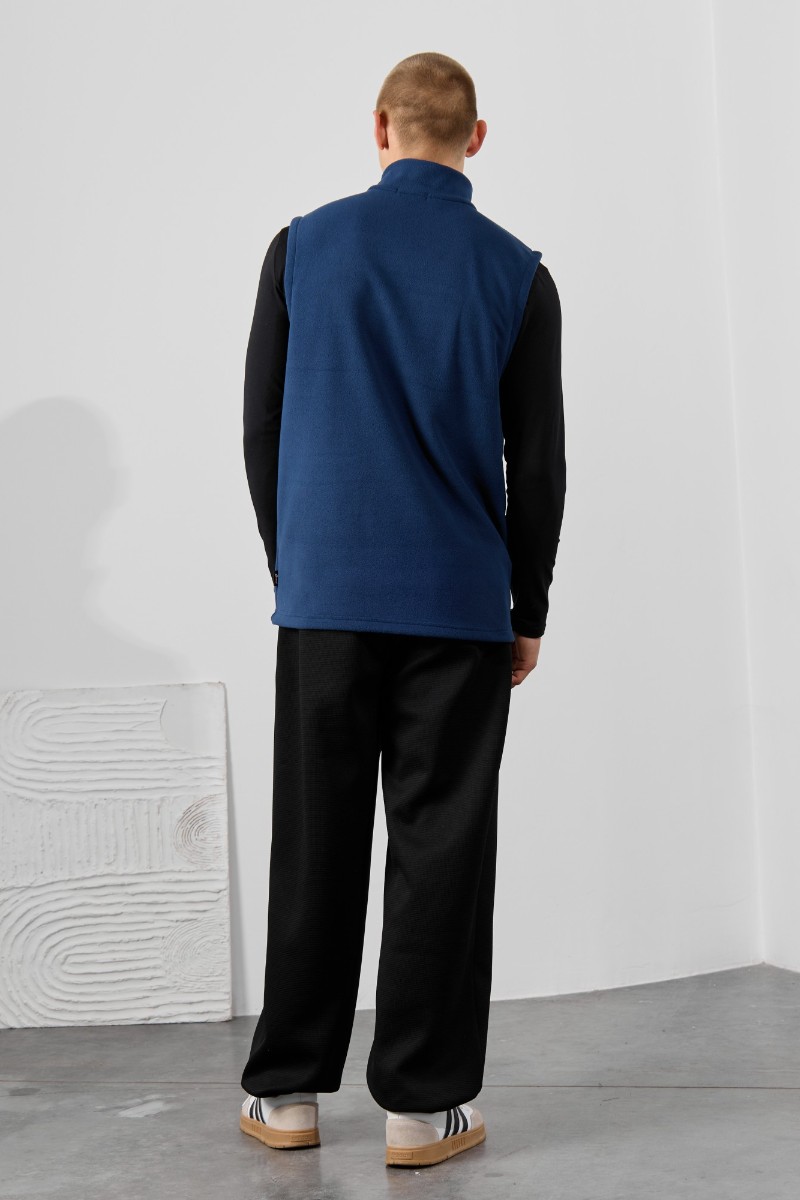 Представляем Вашему вниманию жилет мужской из флиса, прилегающего силуэта, с воротником-стойкой , центральной бортовой застежкой на тесьму "молния" и вертикальными рельефами на полочках, в швах которых обработаны карманы. Проймы и низ изделия обработаны подгибкой. В нижней части левого бокового шва вставлен небольшой декоративный элемент из репсовой ленты.