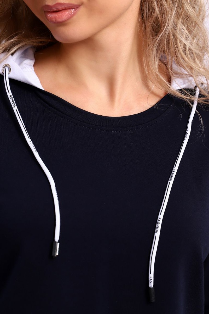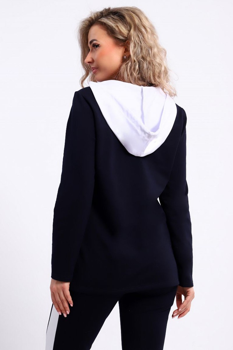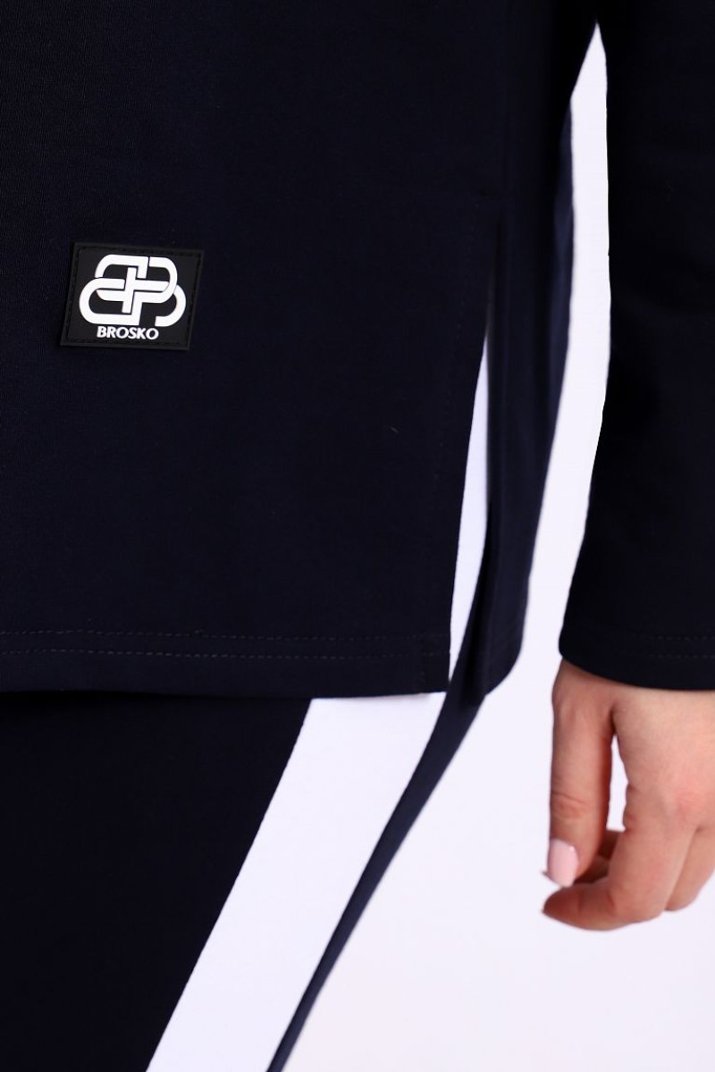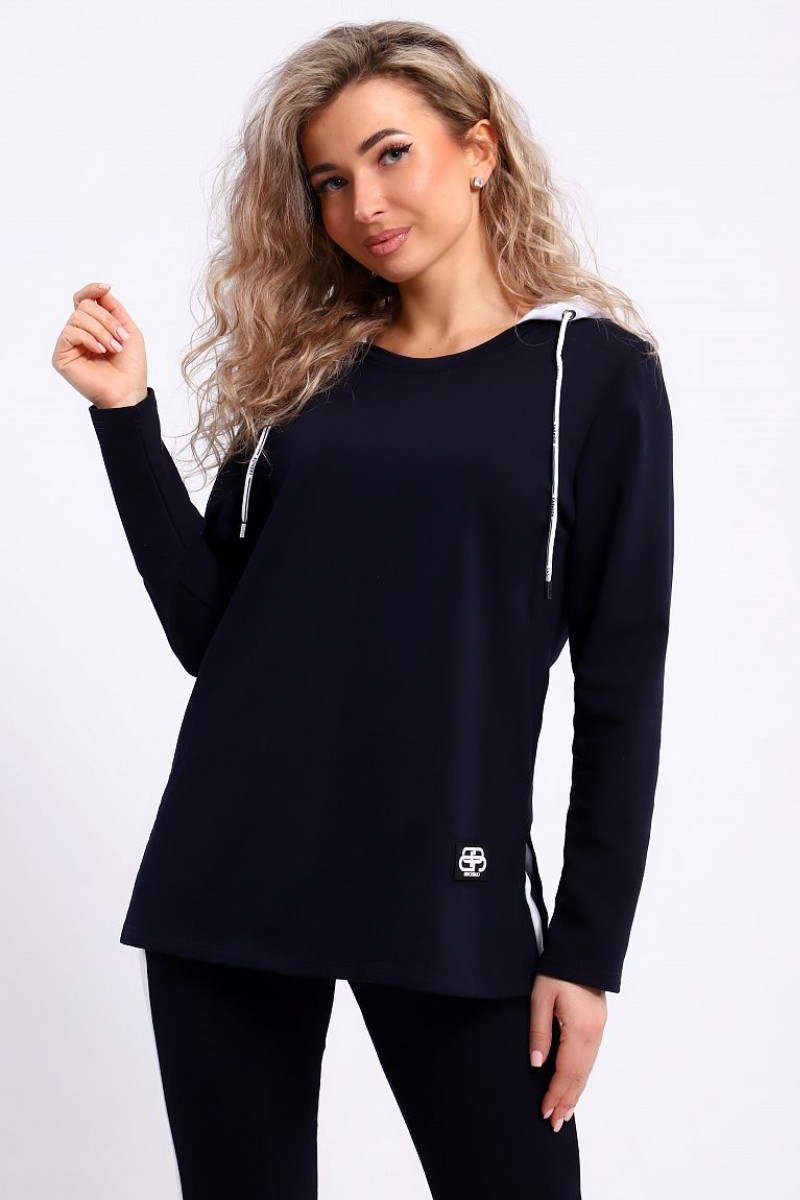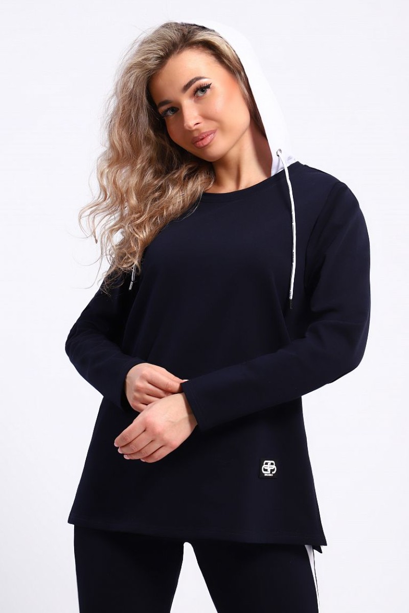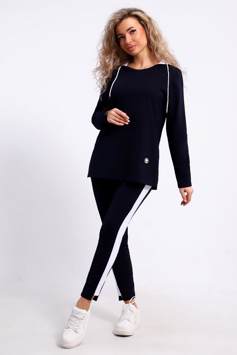 Представляем Вашему вниманию костюм женский повседневный, который состоит из лонгслива и брюк. Лонгслив прямого силуэта, свободной формы, длиной ниже линии бедер с левым боковым разрезом, спущенным плечом и капюшоном. Рукав длинный. Спереди фирменная нашивка. Брюки плотно облегающие длиной до щиколотки, с боковыми внутренними карманами. Боковые вставки-лампасы укорочены, что создает оригинальный фасон брюк. Лампасы выполнены в контрастном цвете.