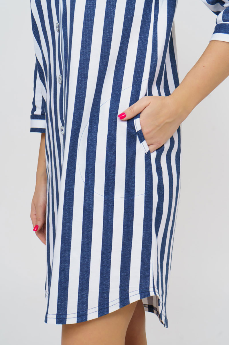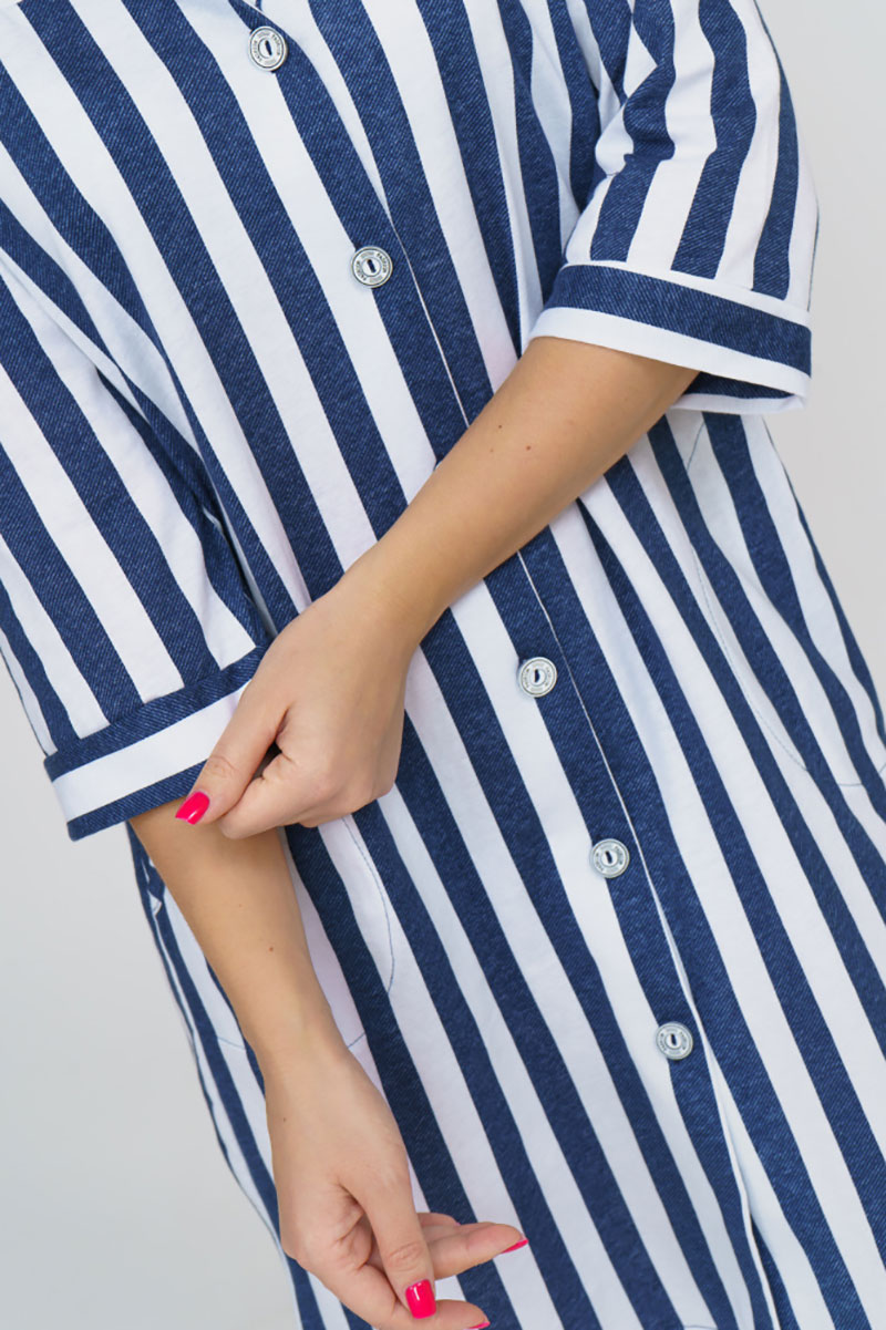 Представляем Вашему вниманию стильный женский халат из кулирки - 100% дышащего хлопка. Рубашечный фасон предоставляет возможность поэкспериментировать и идет всем женщинам без исключения. Модель свободного покроя. Полочка с кокеткой, накладными клапанами, в боковых швах карманы. Спинка цельнокроеная, рукав втачной длиной ¾ с притачной манжетой, застежка центральная на петли пуговицы. Воротник рубашечного типа. Халат длиной ниже уровня бёдер, линия низа с закруглениями. В этом наряде Вы будете чувствовать себя комфортно и уверенно.
