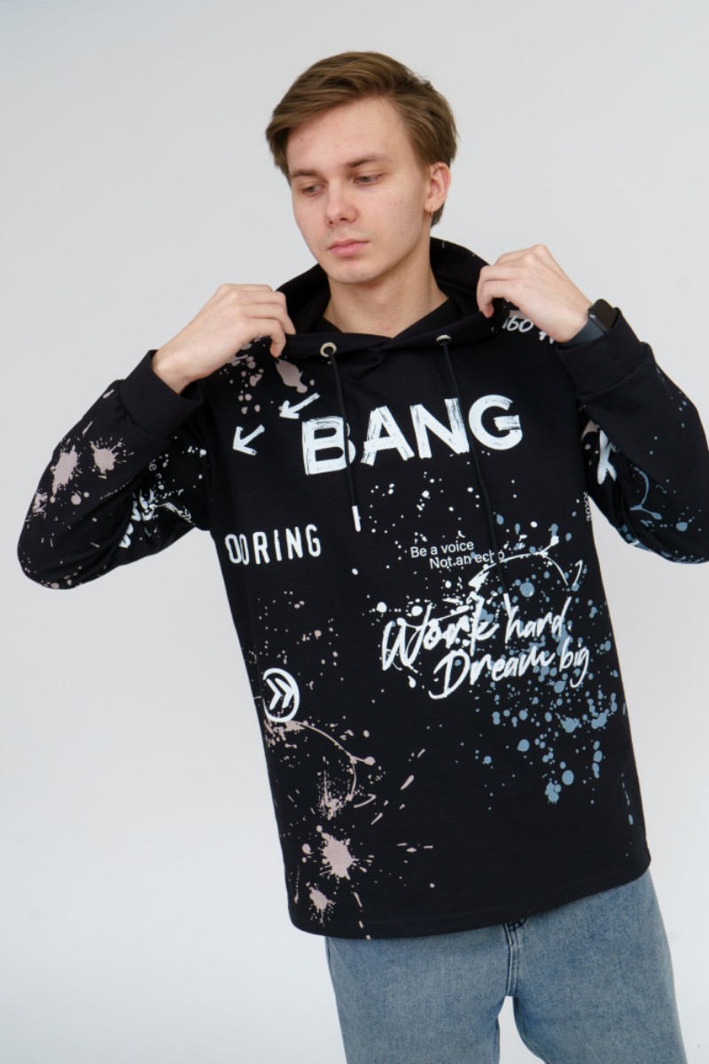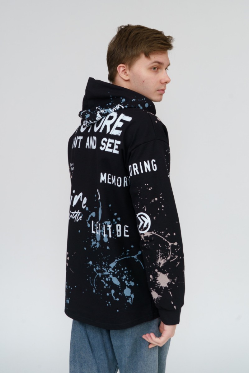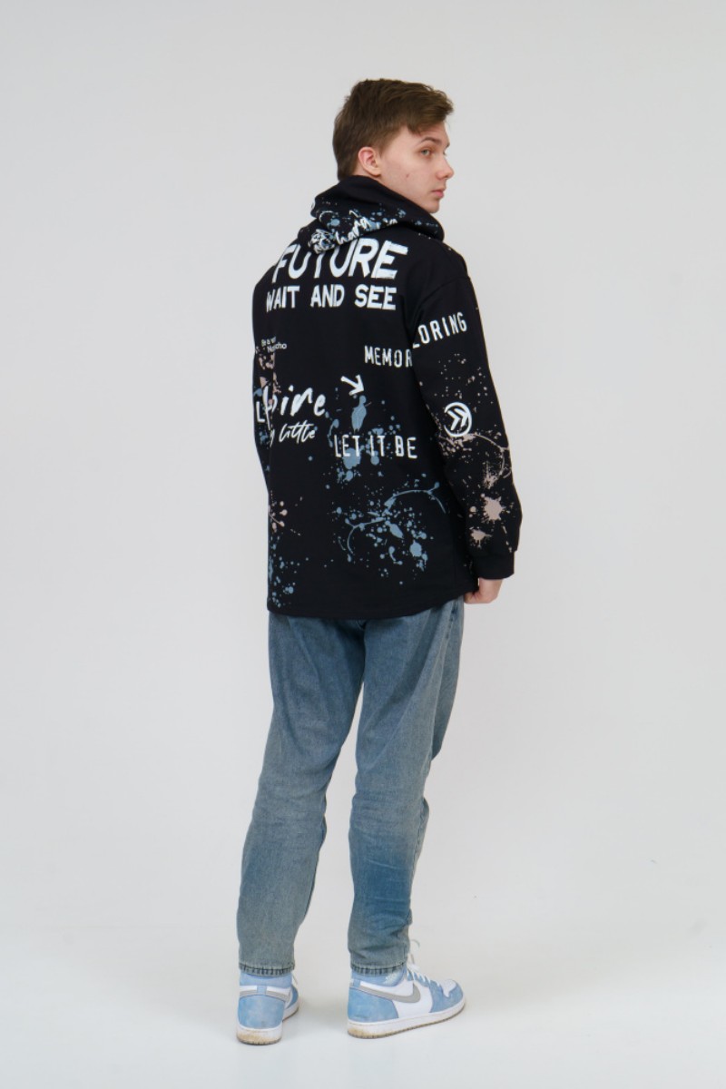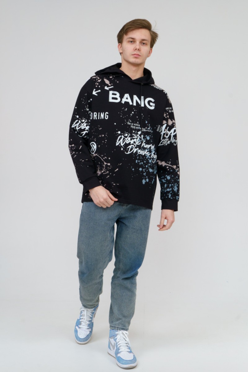 Представляем Вашему вниманию стильное, современное и удобное мужское худи oversize покроя. Модель полностью декорирована контрастным принтом. Изделие с длинным рукавом на манжете, с капюшоном и кулисой со шнуром внутри. Этот стиль помогает гармонично вписать спортивную одежду в повседневный гардероб.