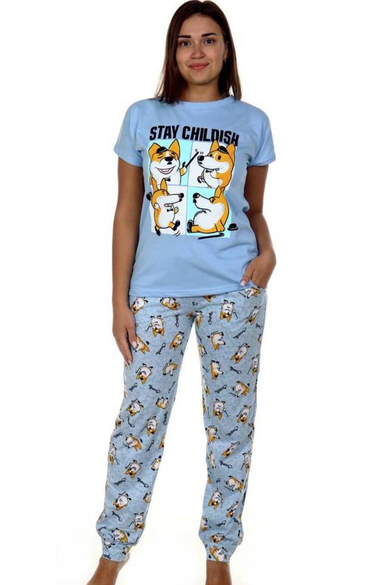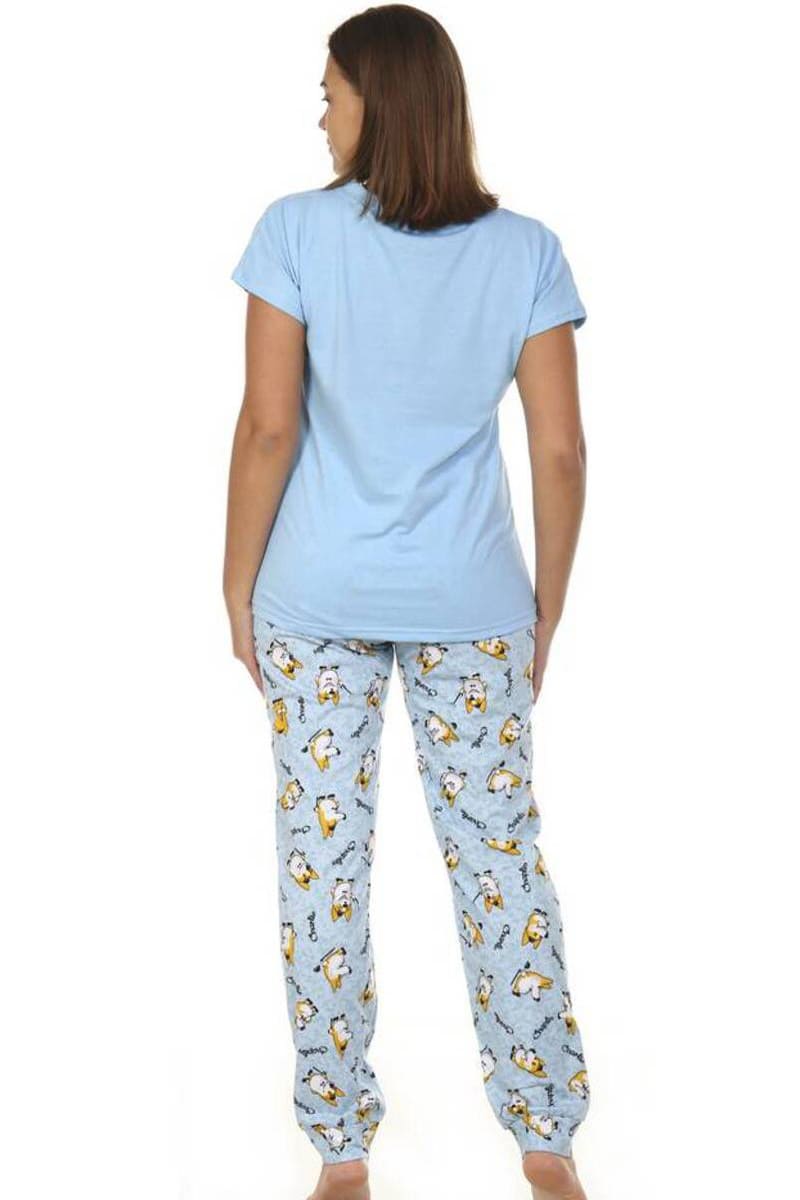 Представляем Вашему вниманию легкий женский костюм двойку из хлопковой ткани, которая идеально повторяет изгибы тела и не стесняет движений. Трикотаж легкий и гигроскопичный. В комплекте идет футболка полуприлегающего силуэта, украшенная очаровательным принтом, и длинные брюки с небольшими кармашками. В этом костюме Ваш домашний отдых будет максимально приятным и расслабляющим.