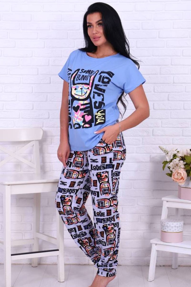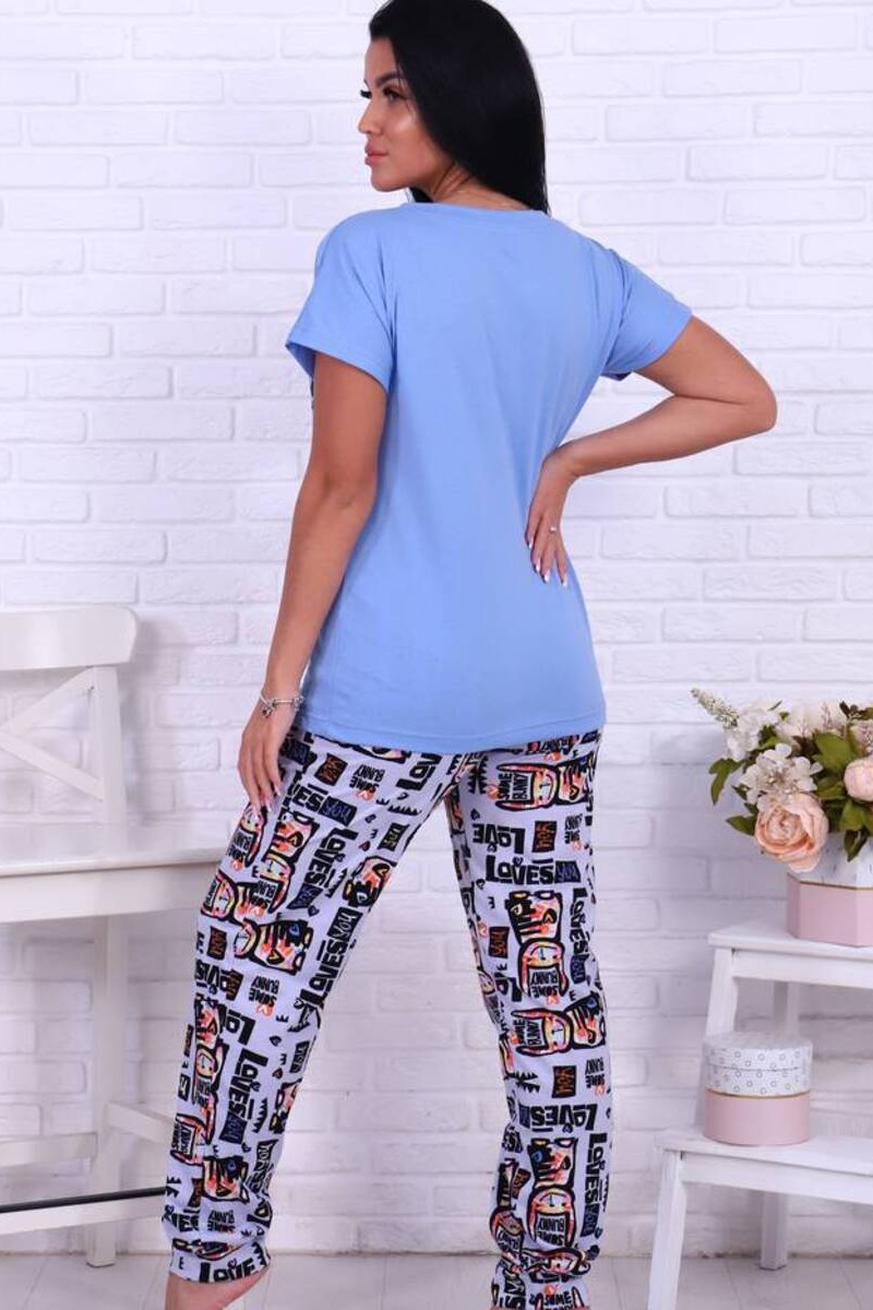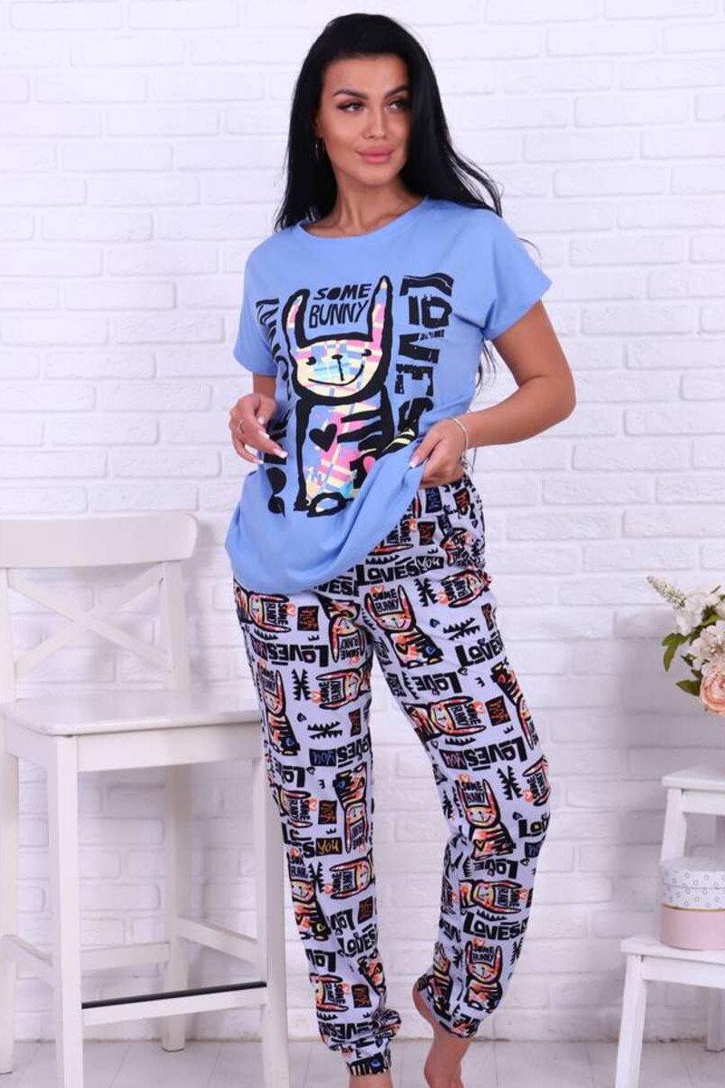 Представляем Вашему вниманию легкий женский костюм двойку из хлопковой ткани, которая идеально повторяет изгибы тела и не стесняет движений. Трикотаж легкий и гигроскопичный. В комплекте идет футболка полуприлегающего силуэта, украшенная очаровательным принтом, и длинные брюки с небольшими кармашками. В этом костюме Ваш домашний отдых будет максимально приятным и расслабляющим.