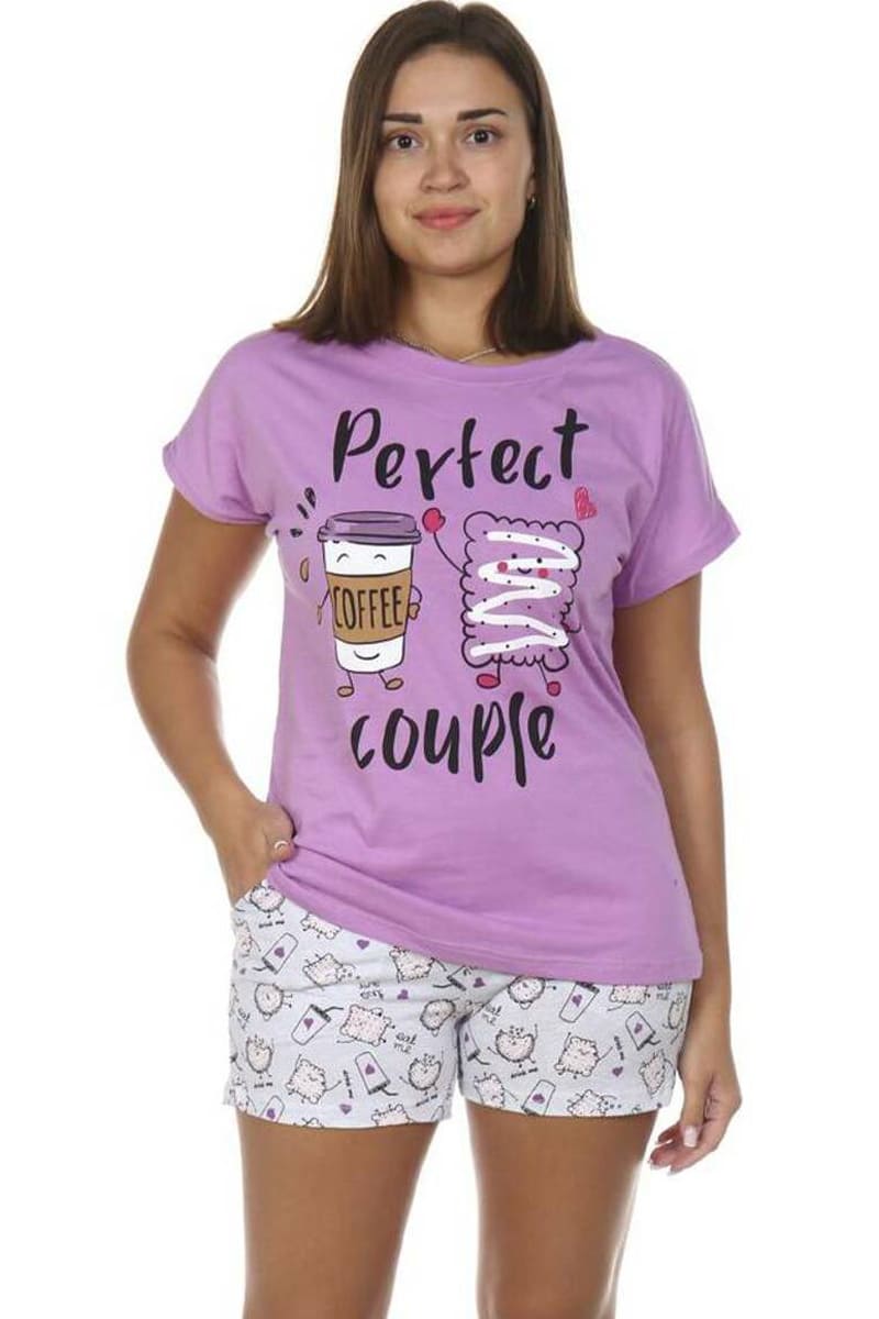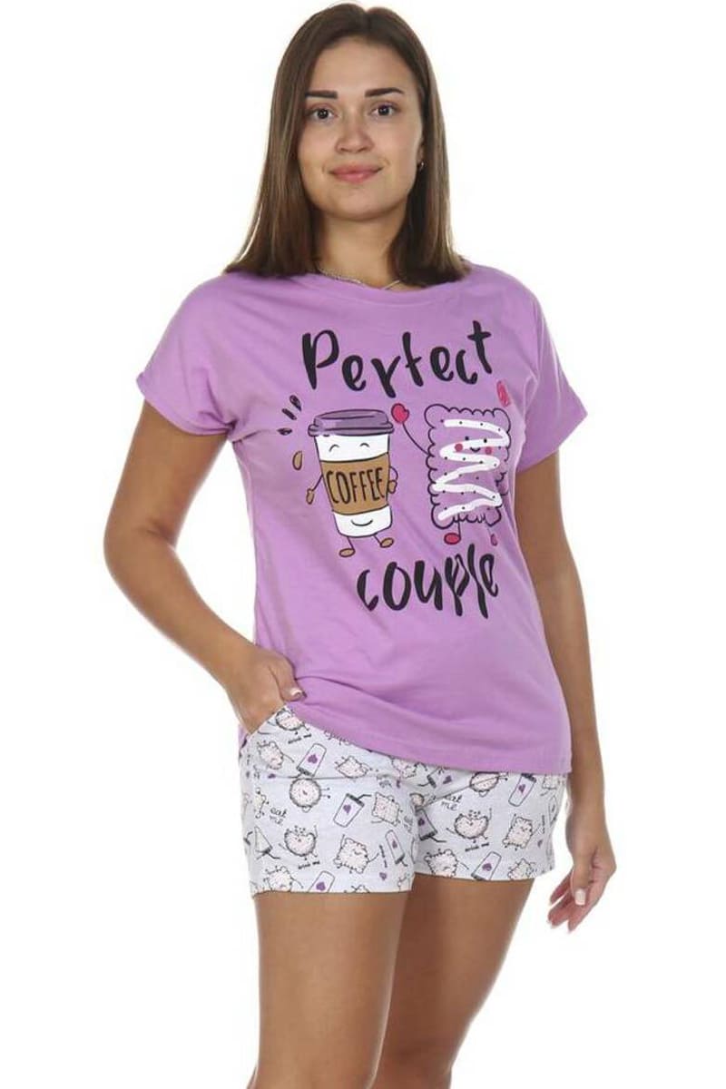 Представляем Вашему вниманию легкий женский костюм двойку из хлопковой ткани, которая идеально повторяет изгибы тела и не стесняет движений. Трикотаж легкий и гигроскопичный. В комплекте идет футболка полуприлегающего силуэта, украшенная очаровательным принтом, и короткие шорты с небольшими кармашками. В этом костюме Ваш домашний отдых будет максимально приятным и расслабляющим.