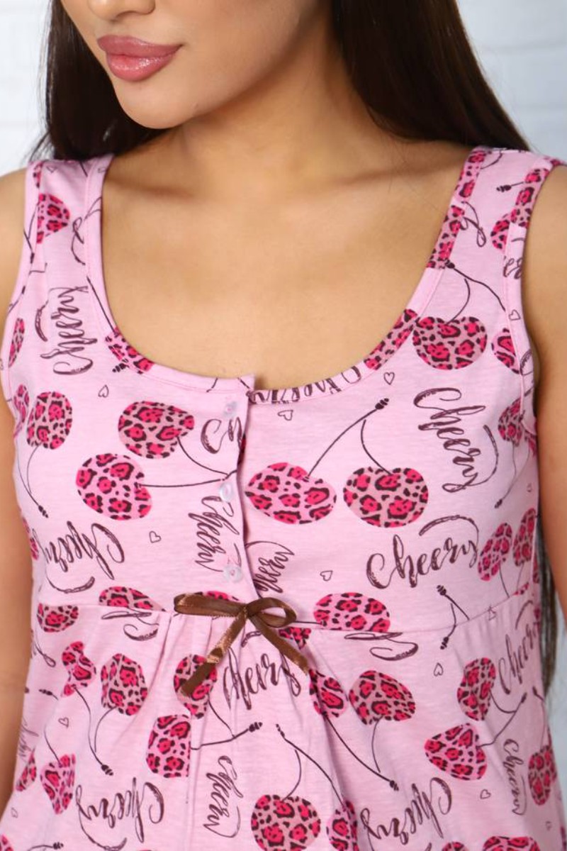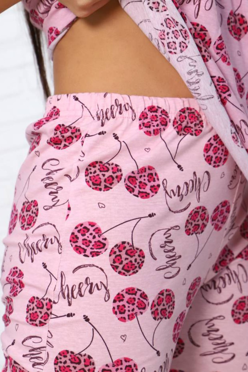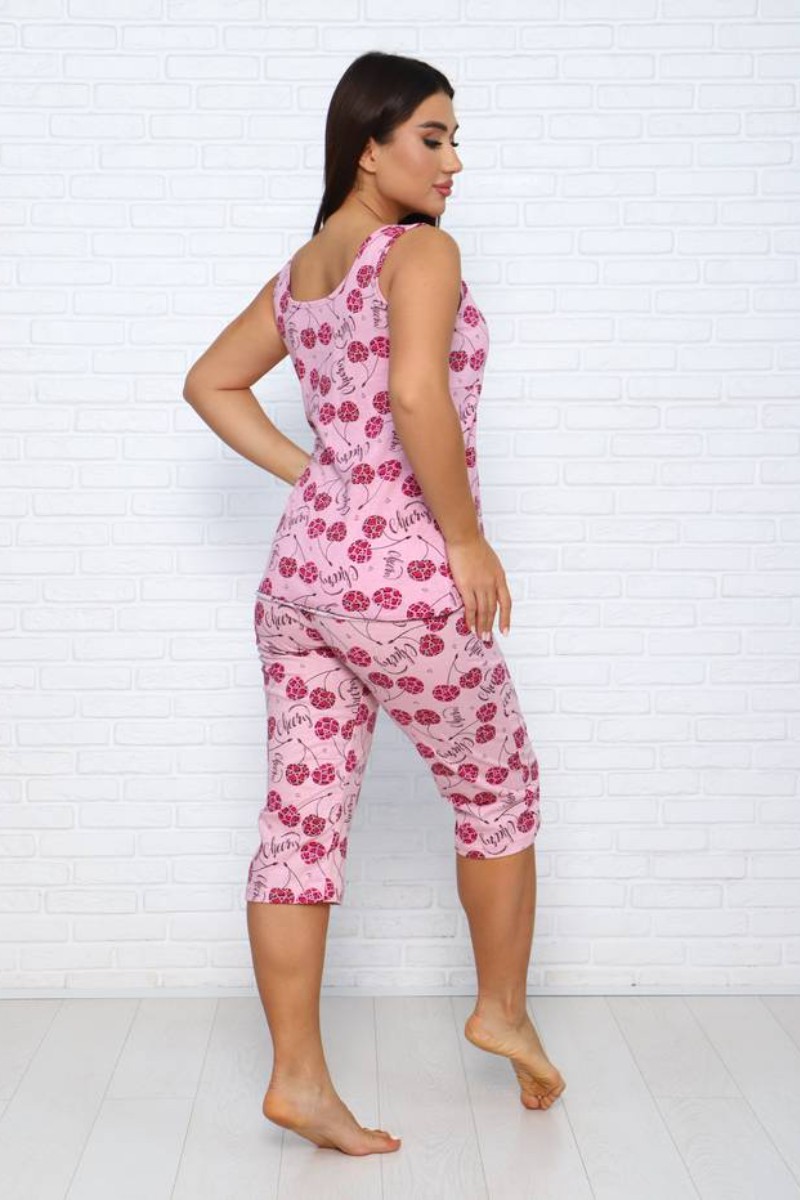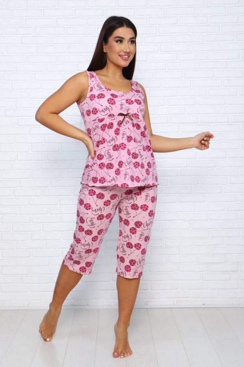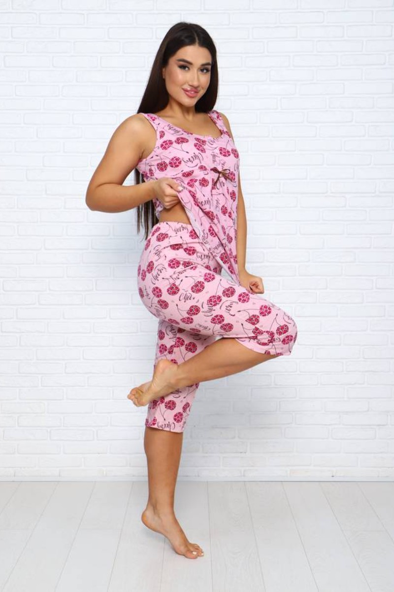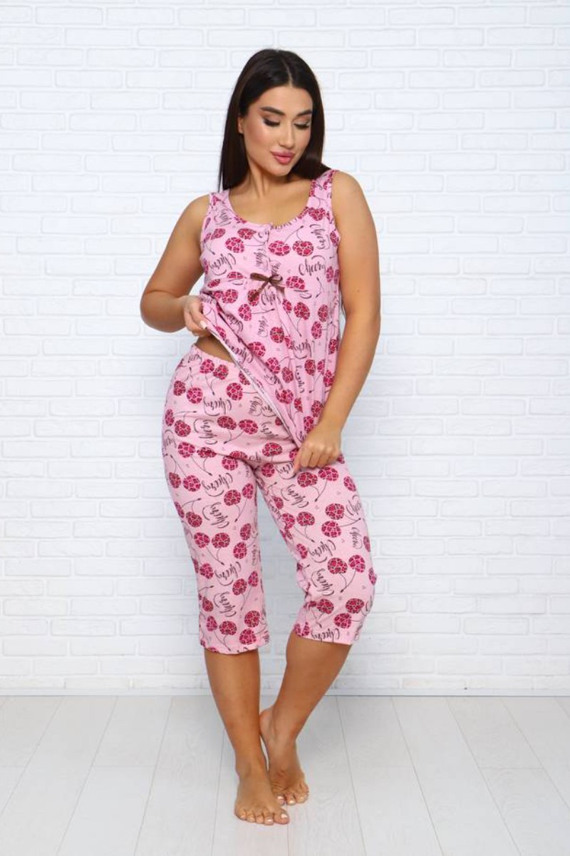 Представляем Вашему вниманию легкую и комфортную женскую пижаму, состоящую из очаровательных бриджей и удобной маечки. И бриджи и майка украшены изящным контрастным принтом. Комплект изготовлен из высококачественной кулирки, которая прослужит Вам много лет, радуя неповторимой мягкостью и нежностью.