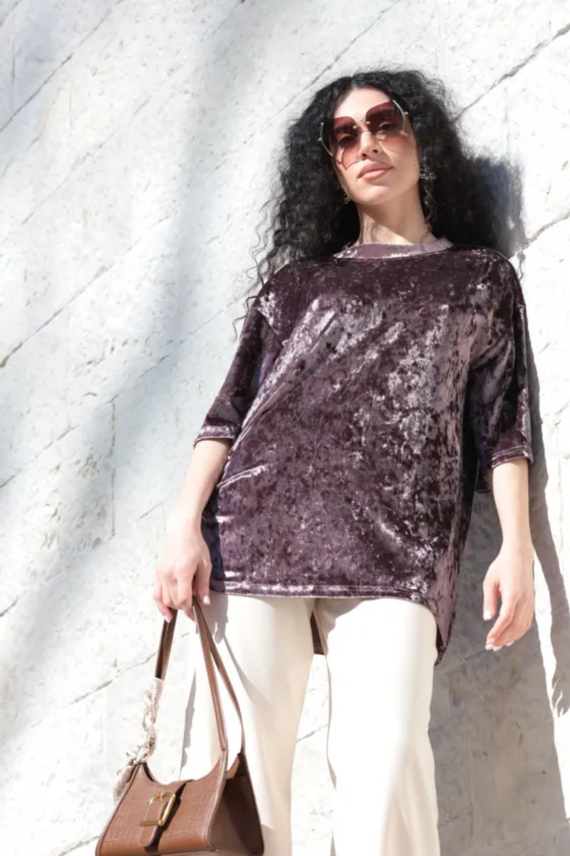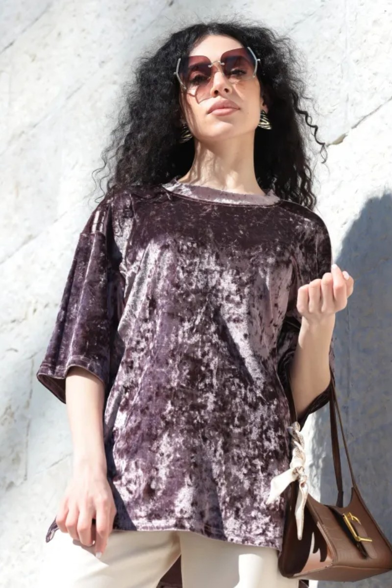 Представляем Вашему вниманию женскую велюровую футболку оверсайз. Эта велюровая футболка станет отличным дополнением гардероба. Объемная модель с классическим круглым вырезом горловины и слегка спущенными широкими рукавами обеспечит комфорт и стильный современный образ. Базовая футболка женская свободного кроя - оверсайз подходит для создания неповторимого образа. Данная модель включает в себя и большие размеры. Футболка подойдет как для вечерних выходов, прогулок по городу, так и для повседневной носки. Футболка велюровая прекрасно сочетается с различными элементами одежды, создавая уникальные сочетания. Изделие выполнено из мягкого велюра, что придает ему уютный вид. Это идеальный выбор для тех, кто ценит комфорт и стиль одновременно.