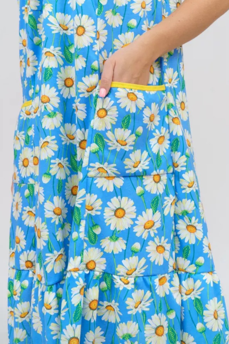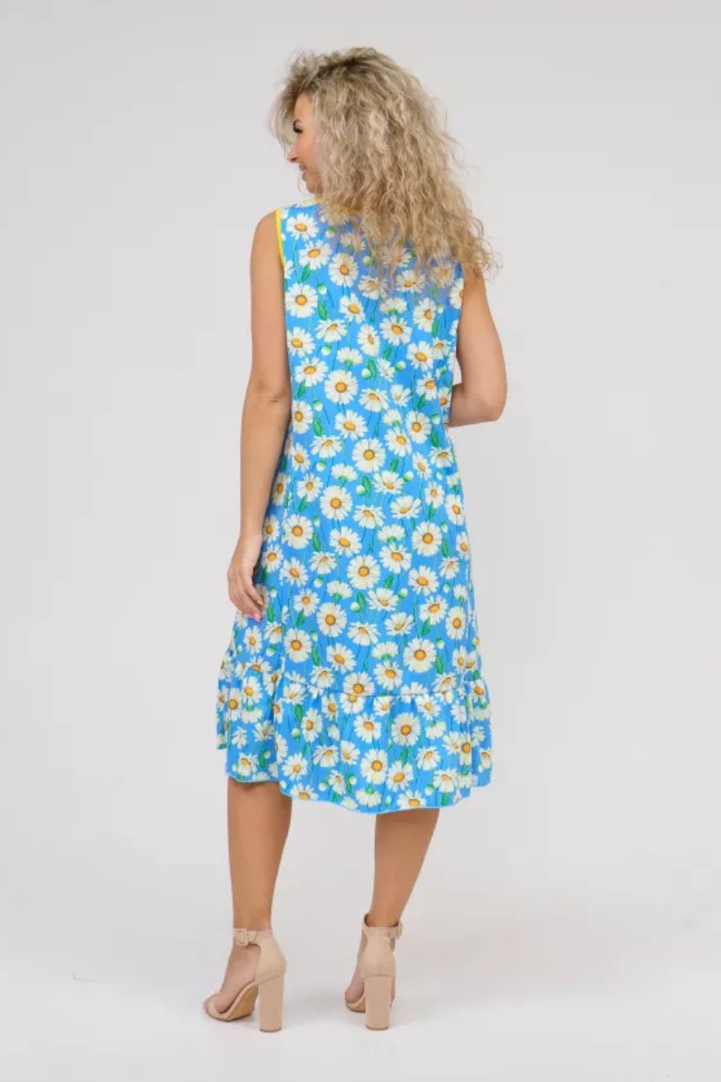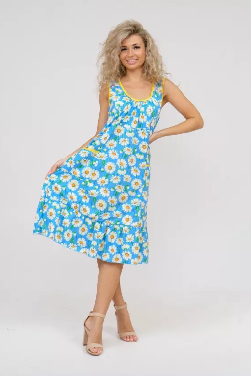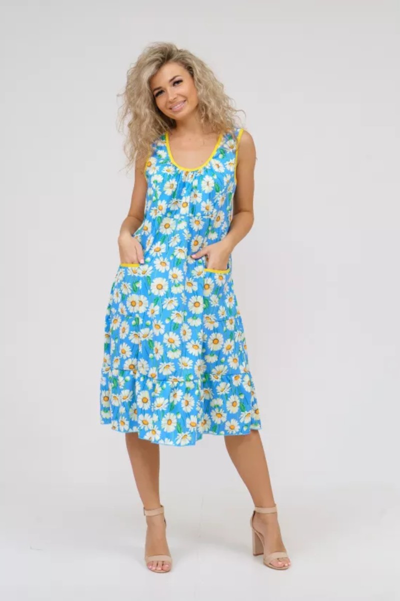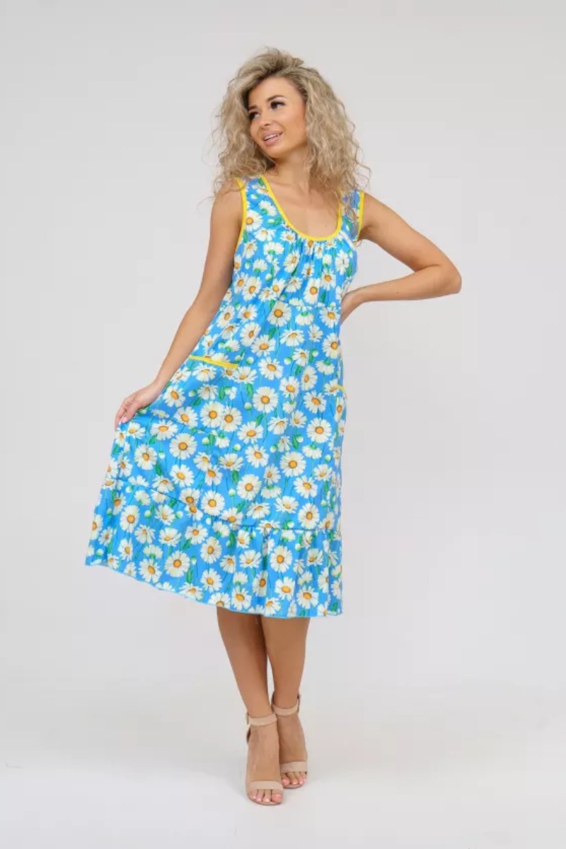 Представляем Вашему вниманию стильный женский сарафан на лето! Это универсальное платье станет незаменимой вещью в гардеробе любой женщины. Оно подходит для повседневного ношения, офисной работы, пляжа и праздника. Лёгкий хлопковый сарафан – это идеальная одежда для женщин, которые ценят удобство и красоту. Модель невероятно практичная, выполнена из премиального хлопка на котором нанесено изображение ромашки. Расклешенный к низу сарафан до колена украшен по подолу оборкой в тон сарафану и однотонной окантовкой , которая подчеркивает небольшой округлый вырез горловины и наличие для функциональности двух карманов. Натуральный хлопок в летнюю жару подарит ощущение легкости. А наличии большого размерного ряда и свободного кроя- идеальный вариант для дам больших размеров и девушек на последних сроках беременности.