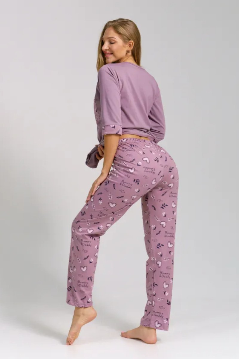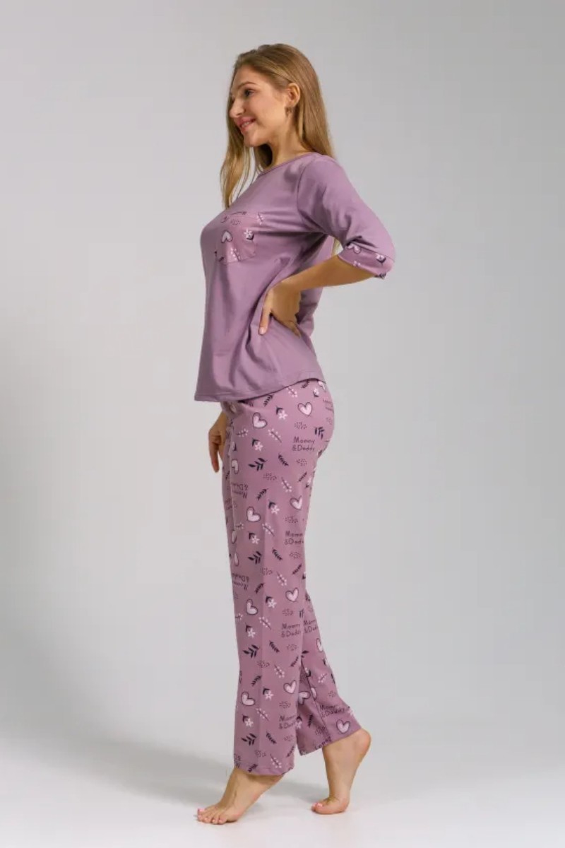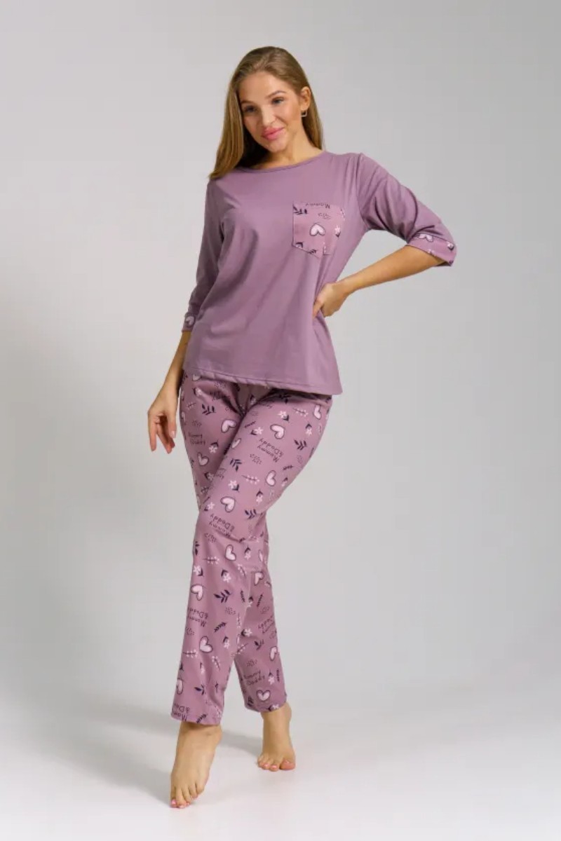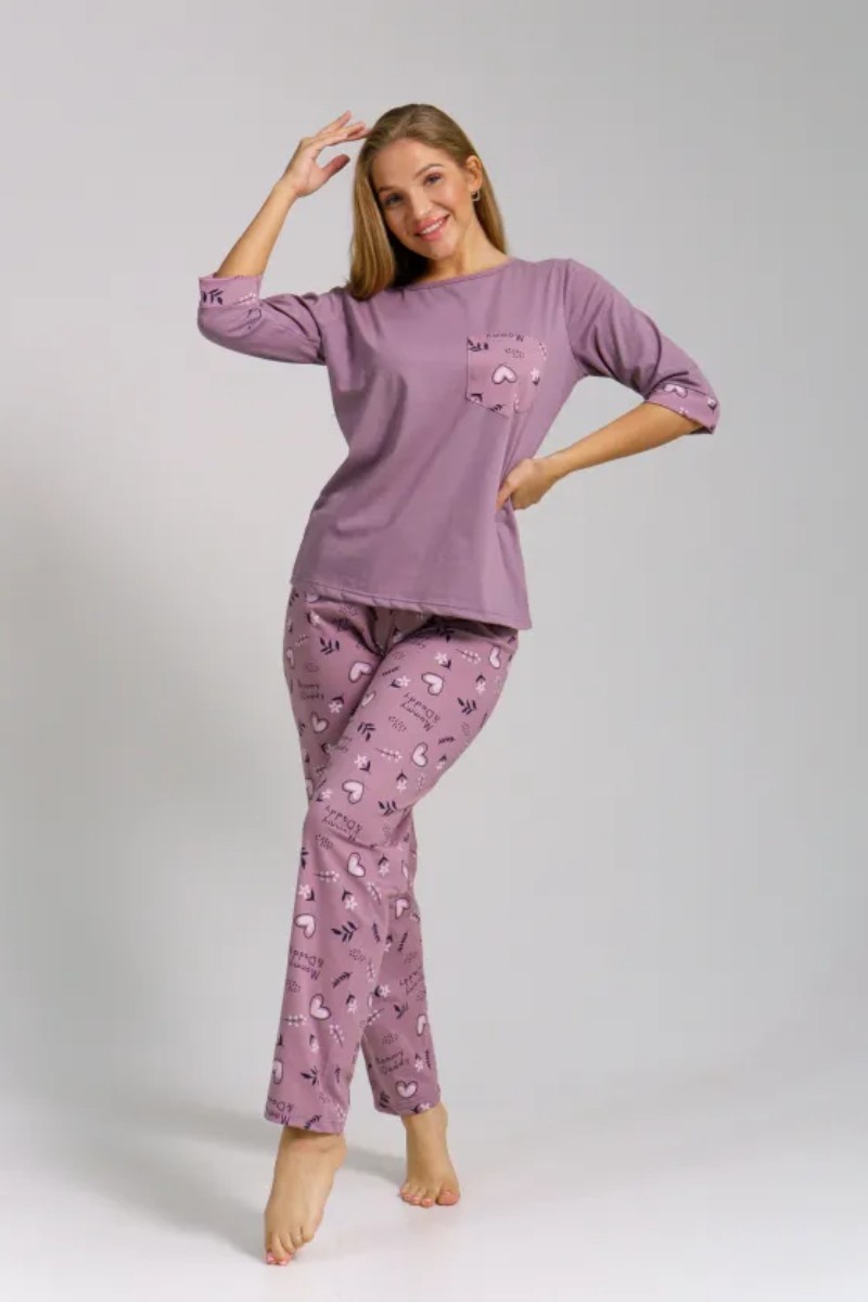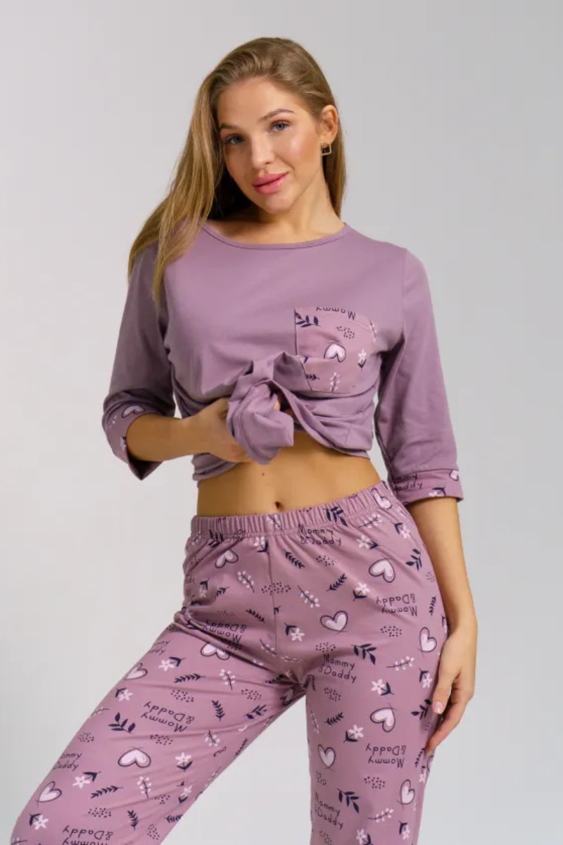 Представляем Вашему вниманию легкую женскую пижаму из кулирки - 100% натурального, дышащего хлопка. Состоит из свободной кофты с рукавом 3/4 и свободными прямого кроя брюками. Комплект имеет элегантную расцветку, которая интересно смотрится и поднимает настроение. Изделие красиво сидит на фигуре и подчеркивает её достоинства. В ней Ваш сон будет максимально приятным и расслабляющим.