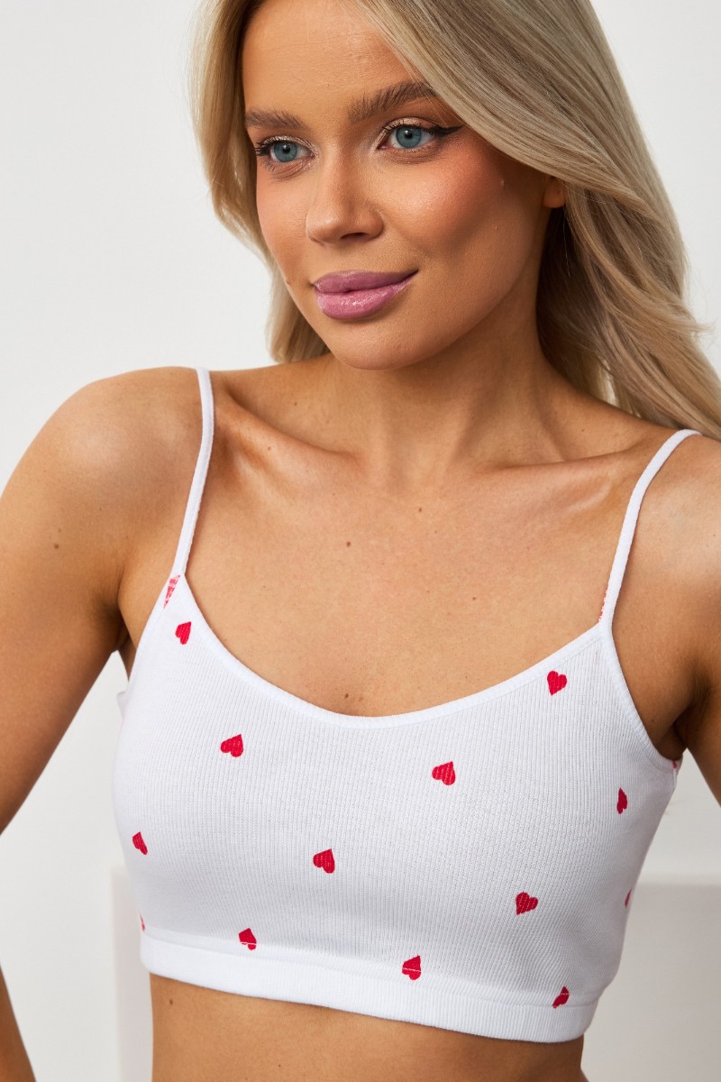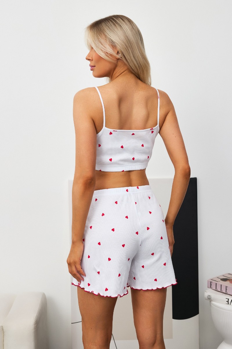 Представляем Вашему вниманию женскую пижаму из трикотажного полотна «кашкорсе» с набивным рисунком, которая состоит из майки-топа и шорт. Майка-топ – на узких бретелях, с V-образным вырезом горловины, низ изделия с эластичной тесьмой, которая дает прилегание по фигуре.Шорты - укороченные, расширенные книзу, с эластичной тесьмой по талии и атласным бантиком в центре. Нижние срезы шорт обработаны узкой обметочной строчкой контрастного цвета, создающей красивый волнистый край.