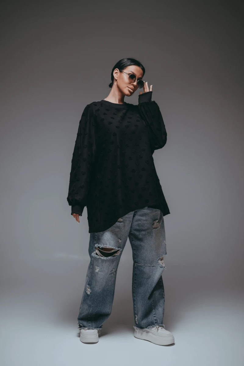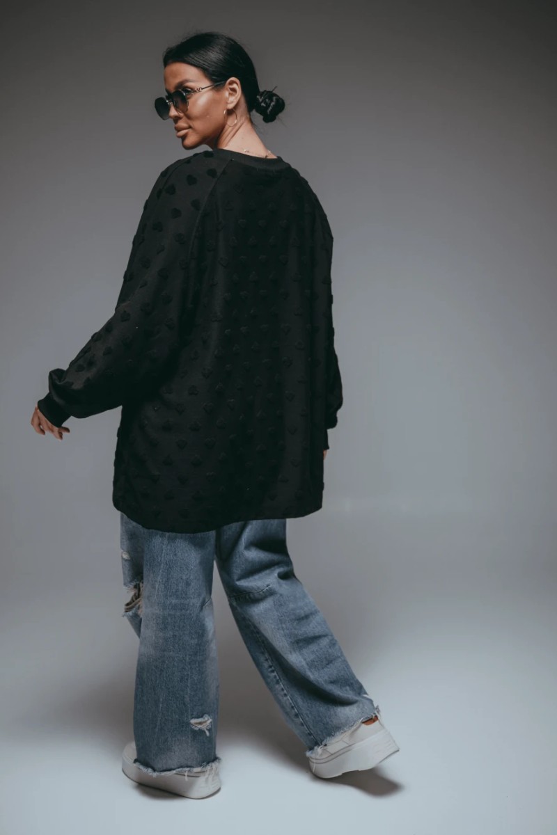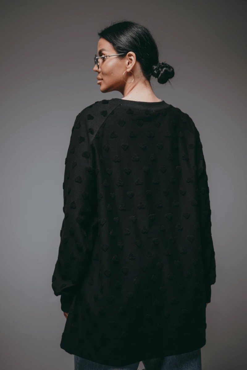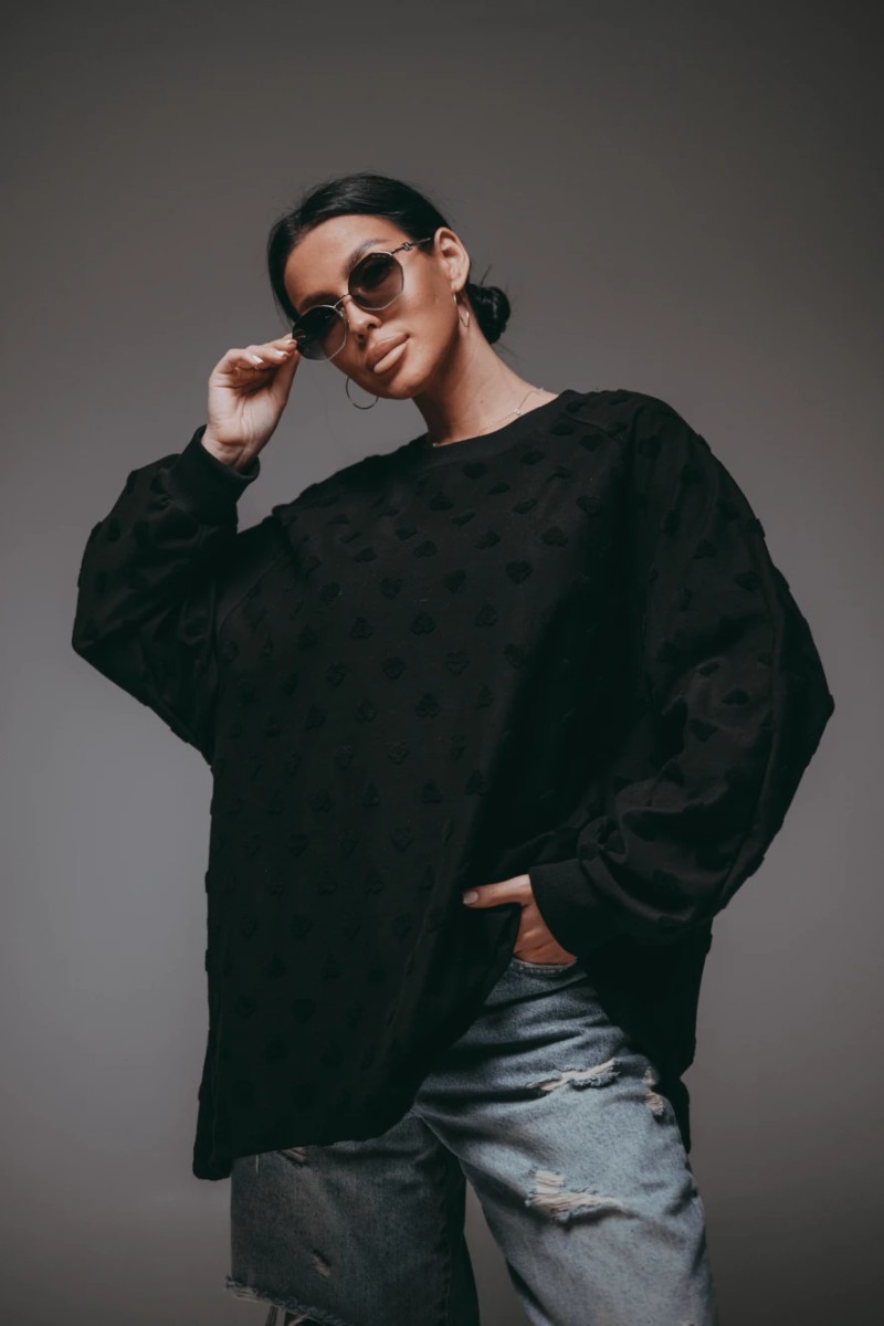 Свитшот женский "Ребека" махра жаккард (р-ры: 44-66) махра черный сердечки