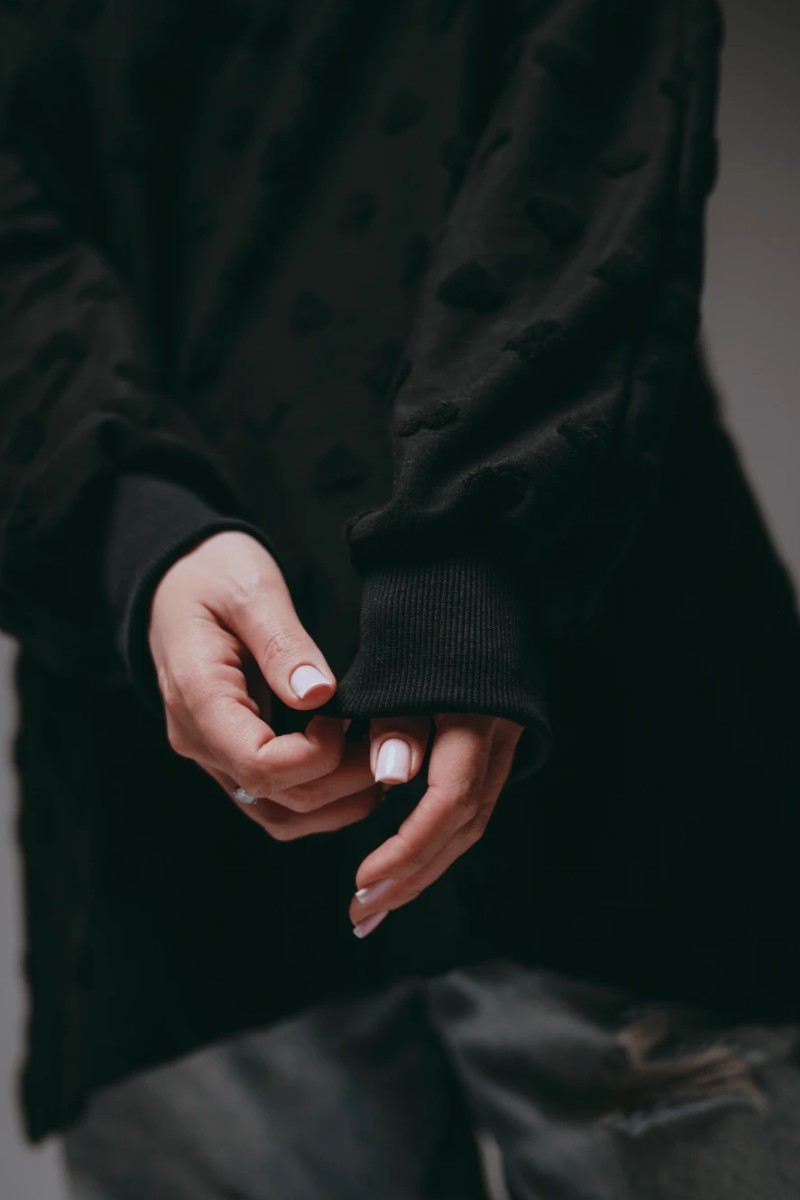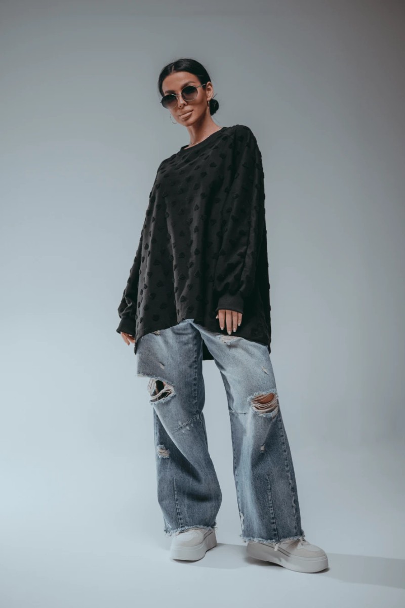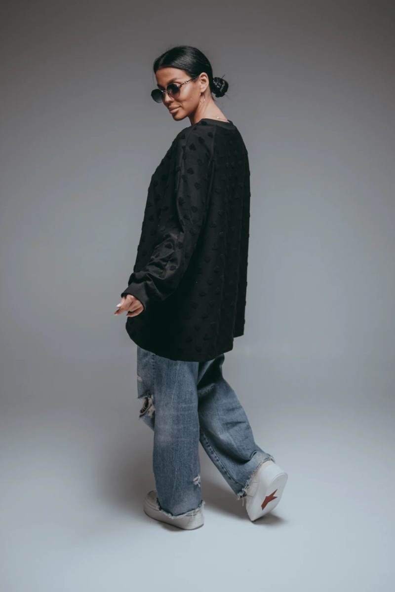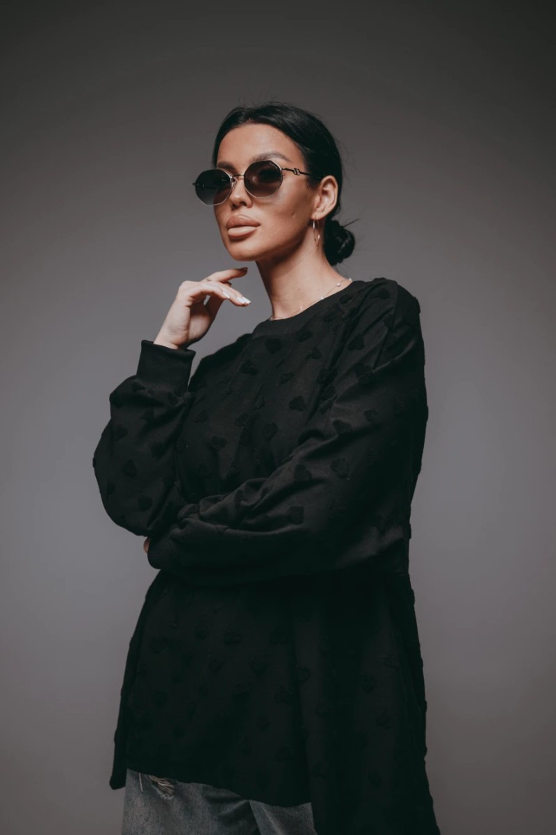 Свитшот женский "Ребека" махра жаккард (р-ры: 44-66) махра черный сердечки