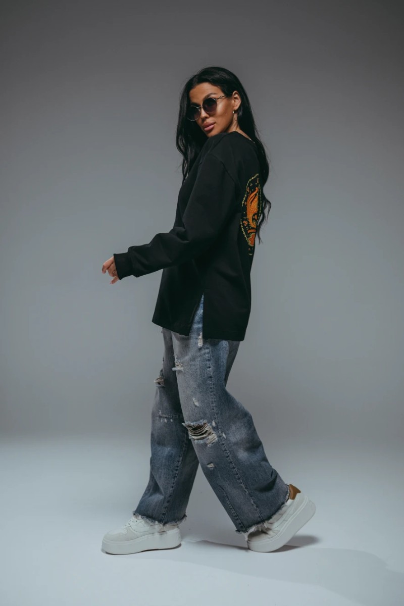 Представляем Вашему вниманию прямой женский свитшот оверсайз со спущенным плечом и длинным втачным рукавом. По низу рукавов втачаны манжеты из кашкорсе. Принт на полочке и спинке. Изготовленный из мягкой ткани с персиковым эффектом (peach touch), он нежно обнимает тело, обеспечивая максимальный комфорт для повседневных прогулок, домашних посиделок или уютных вечеров.