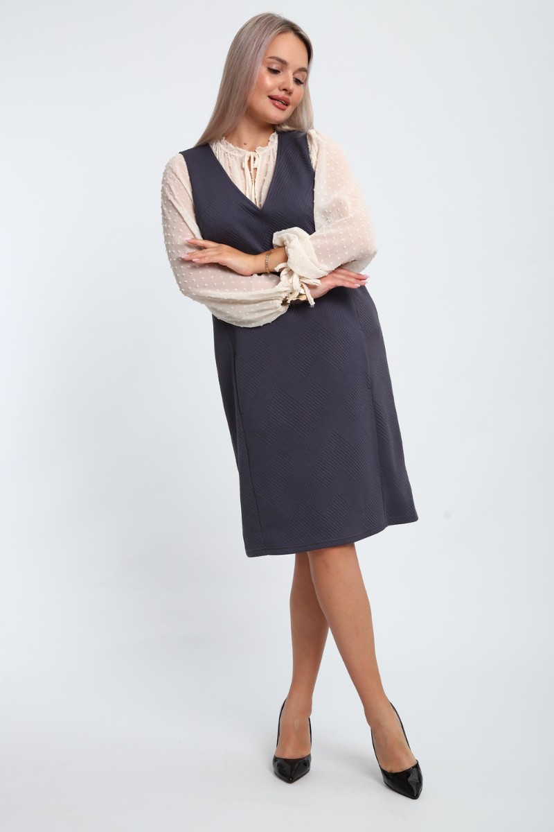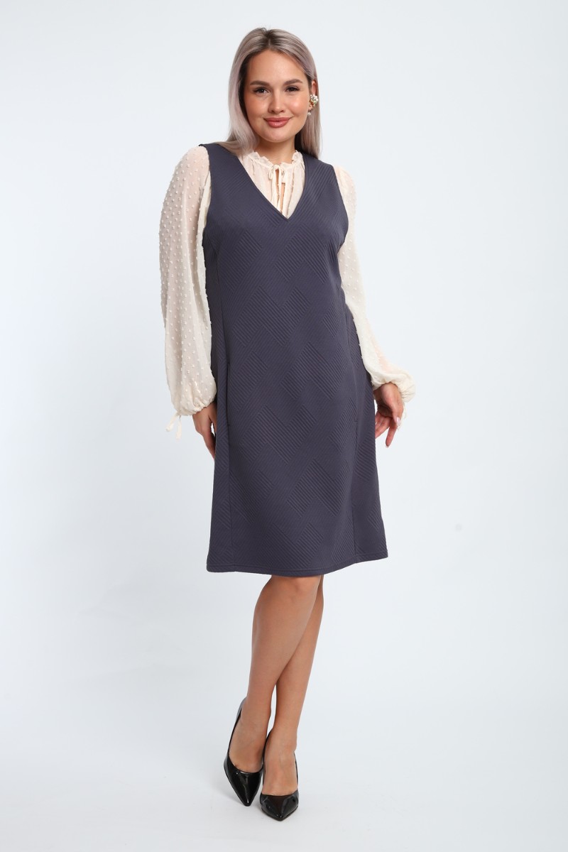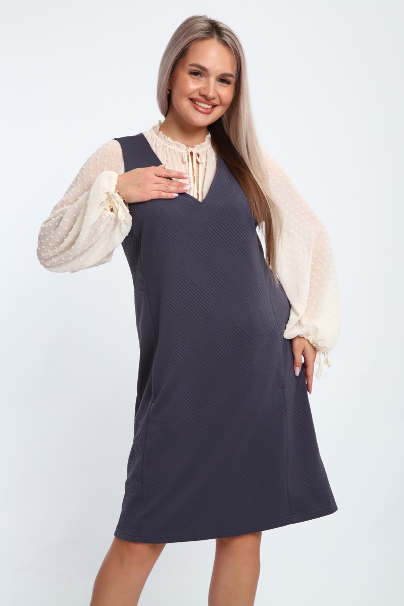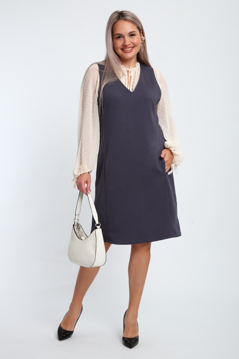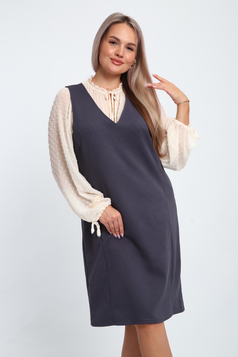 Представляем Вашему вниманию универсальный женский сарафан, к которому можно подобрать разнообразные блузки, водолазки, свитшоты. Модель прямого кроя, слегка притален, благодаря отрезному бочку, аккуратная V-образная горловина обработана обтачкой, в швах притачивания бочков имеются внутренние карманы. Пройма достаточно глубокая, чтобы не стеснять рукав блузки, длина до середины колена. Лаконичность деталей кроя подчеркивает стиль и элегантность изделия. Свободный крой сарафана и воздухопроницаемость ткани обеспечивают комфорт и свободу движения, что делает его идеальным для повседневного ношения. Модная геометрическая рельефная фактура ткани придает изделию стильный и современный образ. Базовые расцветки сарафана помогут с легкостью подобрать к нему пару. На работе, в офисе, на прогулке, на празднике вы будете чувствовать себя комфортно и уверенно.