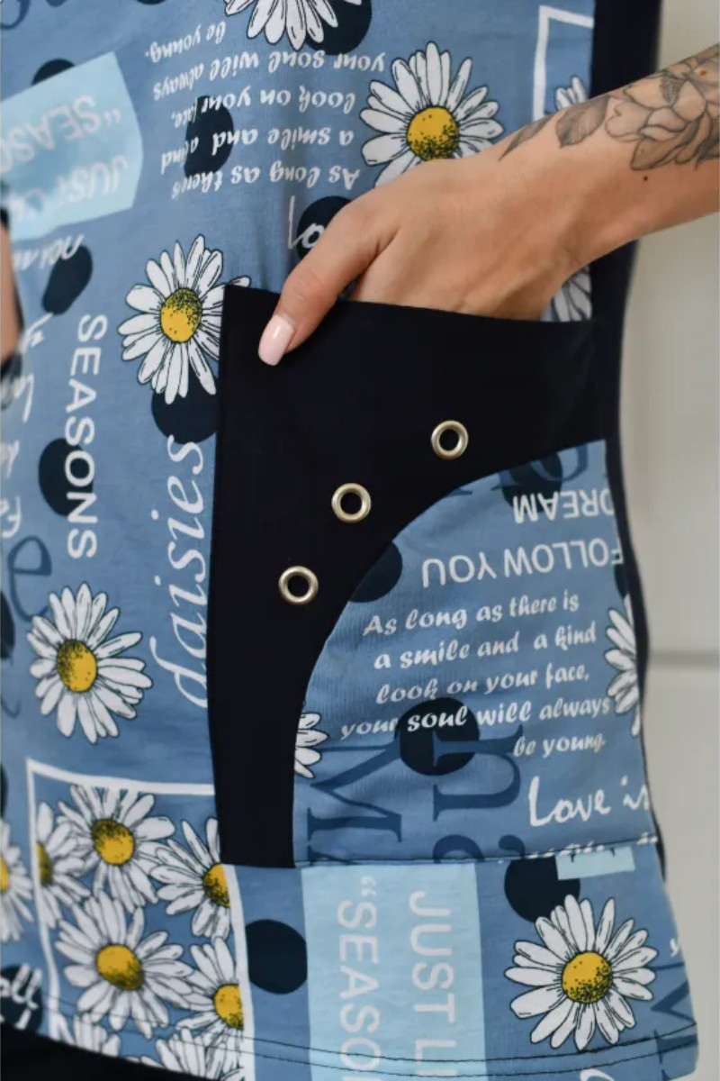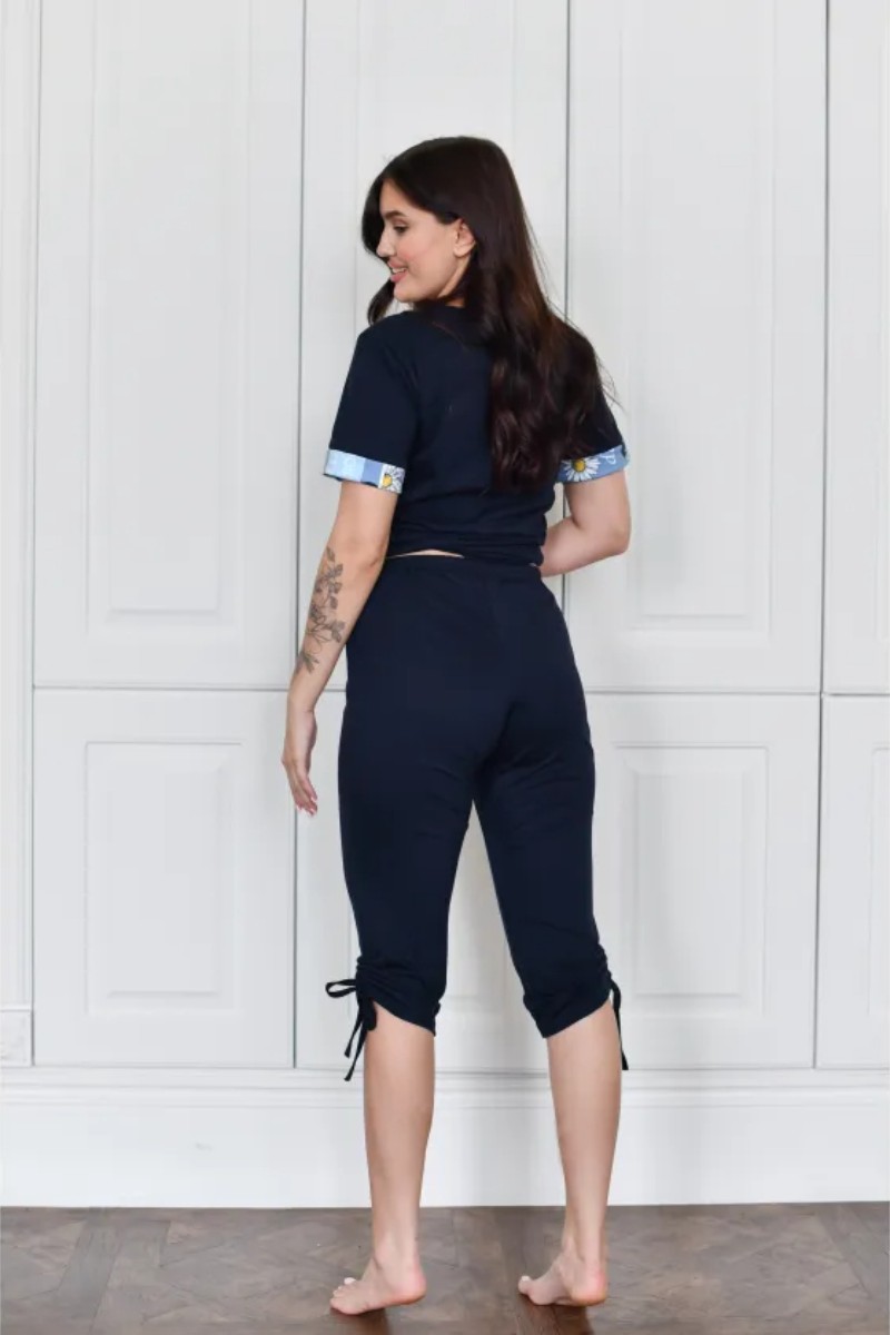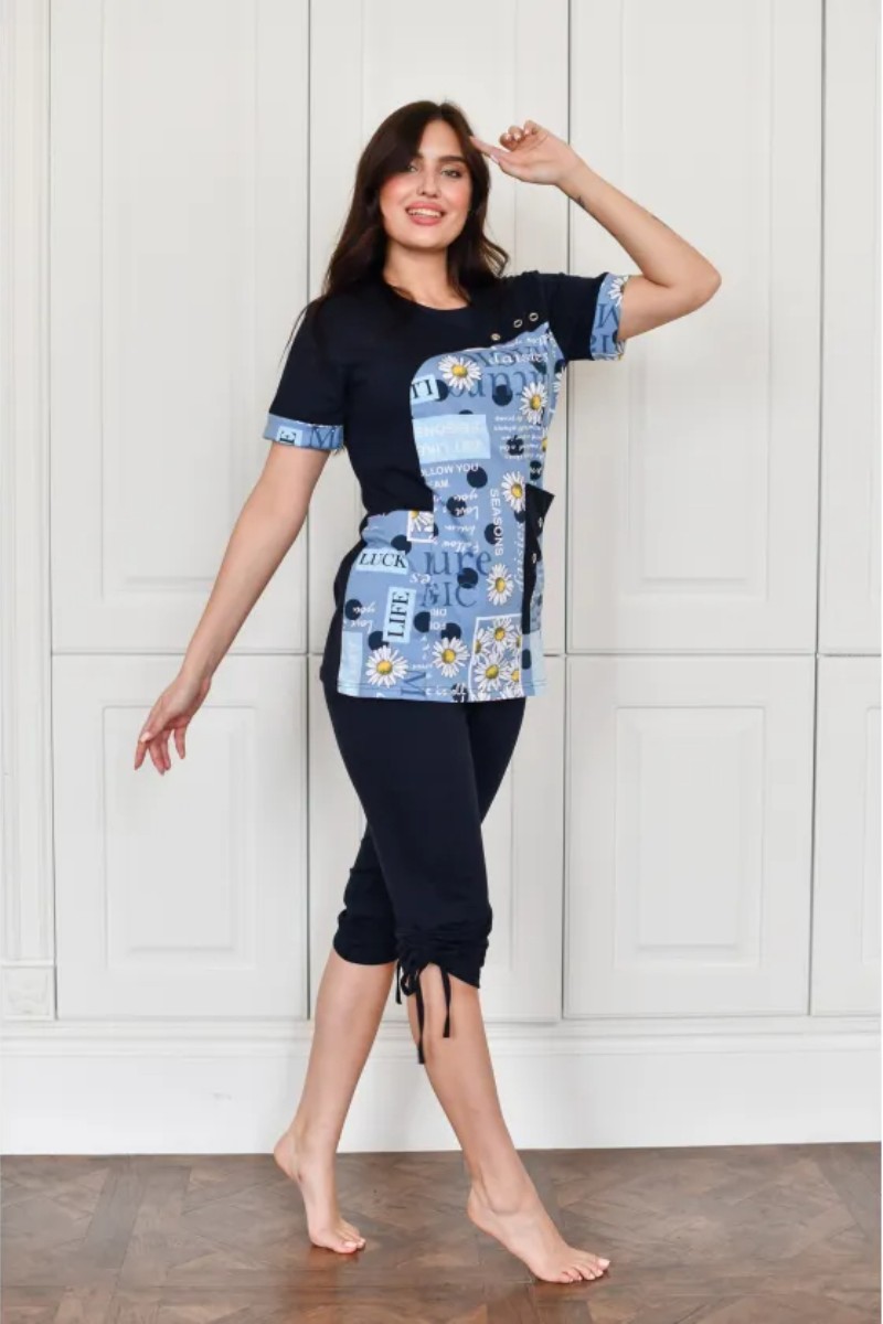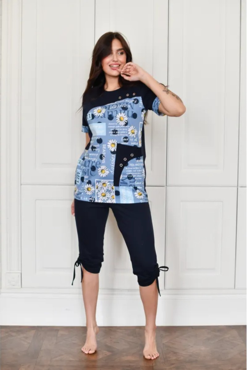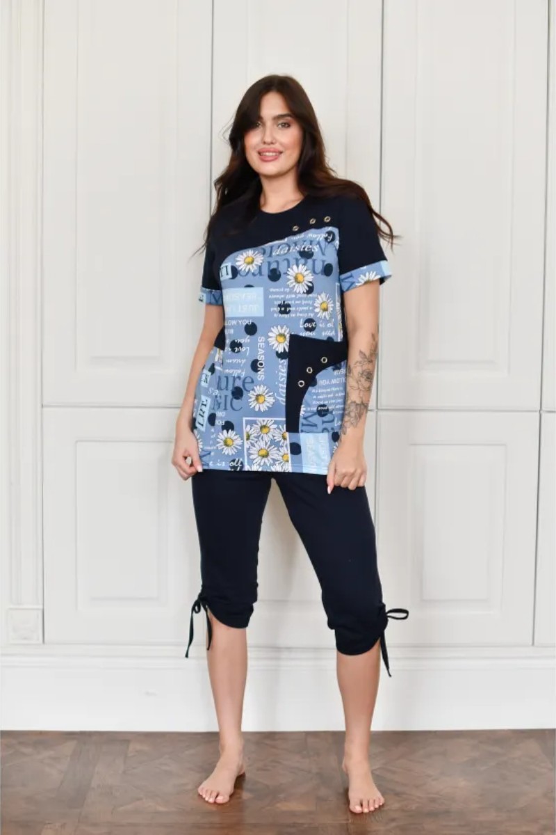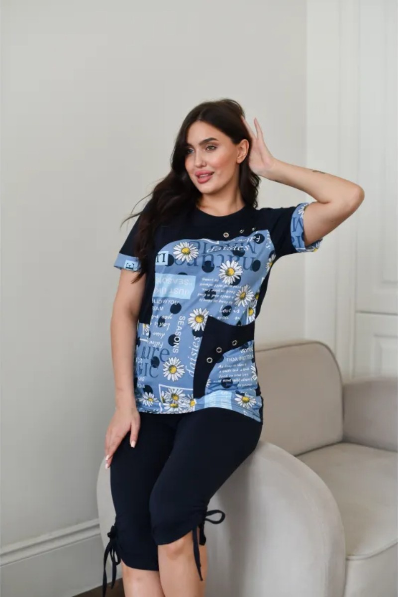 Представляем Вашему вниманию костюм с бриджами, выполненный из 100% хлопка, что делает его воздухопроницаемым, гигроскопичным и гипоаллергенным - все эти параметры играют немаловажную роль при выборе одежды. Футболка полуприлегающего кроя, с втачным рукавом и карманом на передней полочке, который украшен люверсами. Бриджи прямого кроя на эластичной резинке. Размерная линейка костюма с бриджами имеет большие размеры, а за счет свободного кроя беременные и кормящие женщины будут чувствовать себя в нем удобно и комфортно. Небольшой округлый вырез горловины подчеркивает однотонная отделочная вставка, которая так же украшена люверсами. Натуральная ткань и жизнерадостная расцветка - с этим комплектом вам не захочется расставаться.