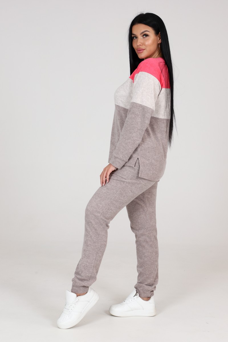 Представляем Вашему вниманию стильный домашний костюм из односторонней махры. Брюки чуть заужены к низу. Рукава реглан. Рукава и низ брюк на манжете. Джемпер выполнен из оригинальных контрастных вставок, что делает образ оригинальным. Спинка у джемпера удлиненная, по бокам разрезы, что позволяет чувствовать себя комфортно в любой ситуации.