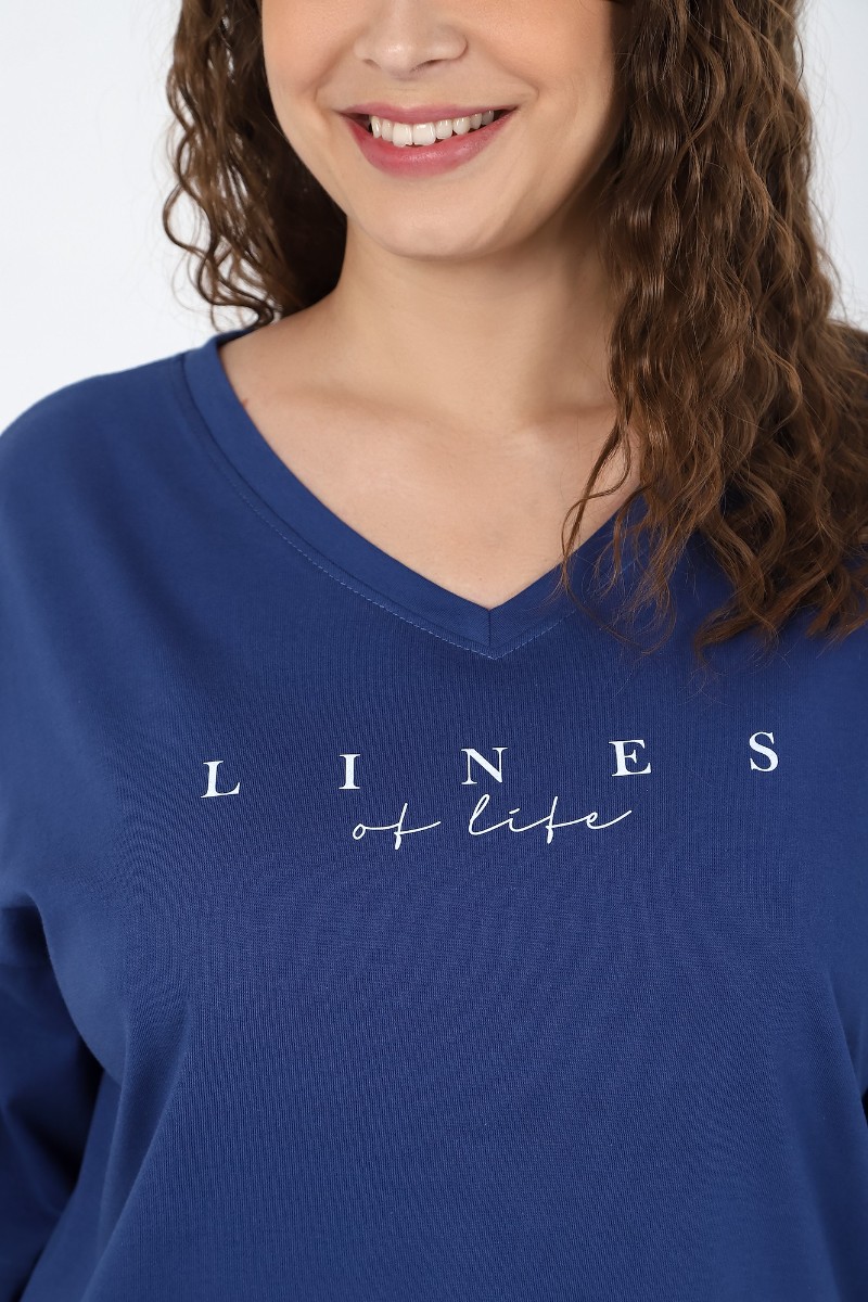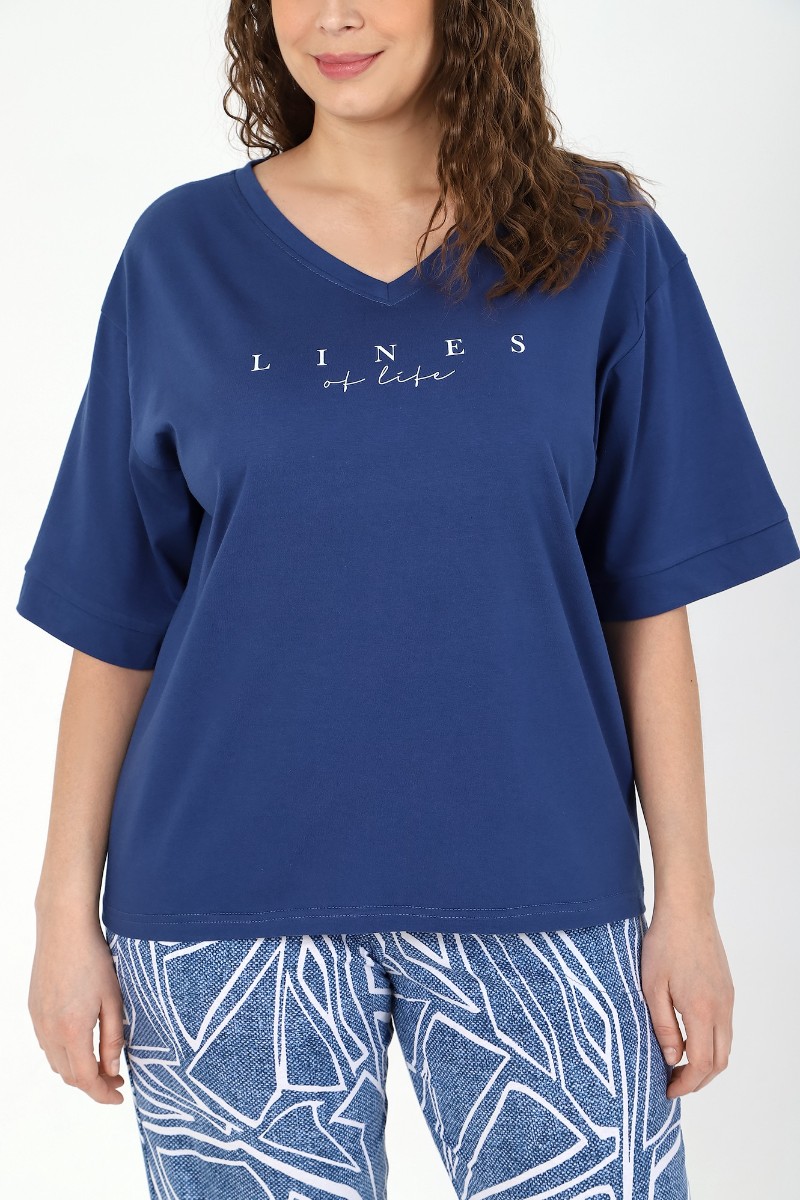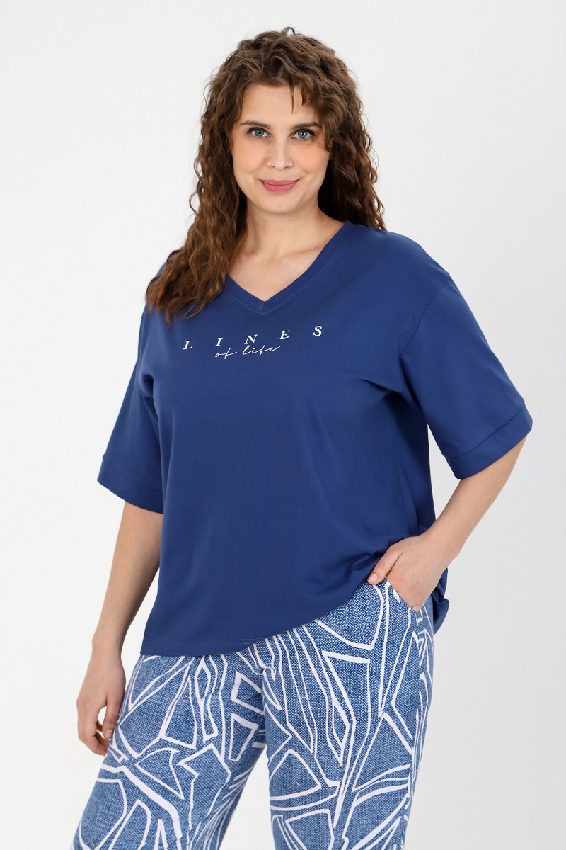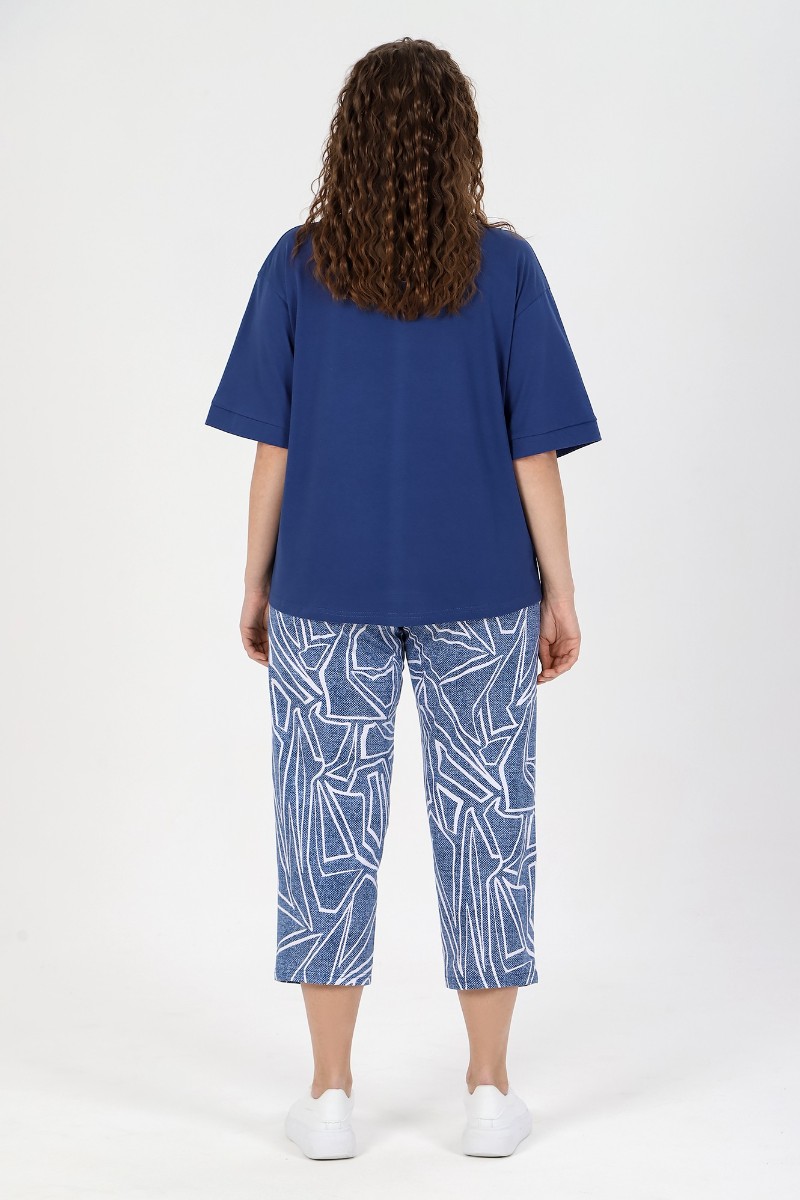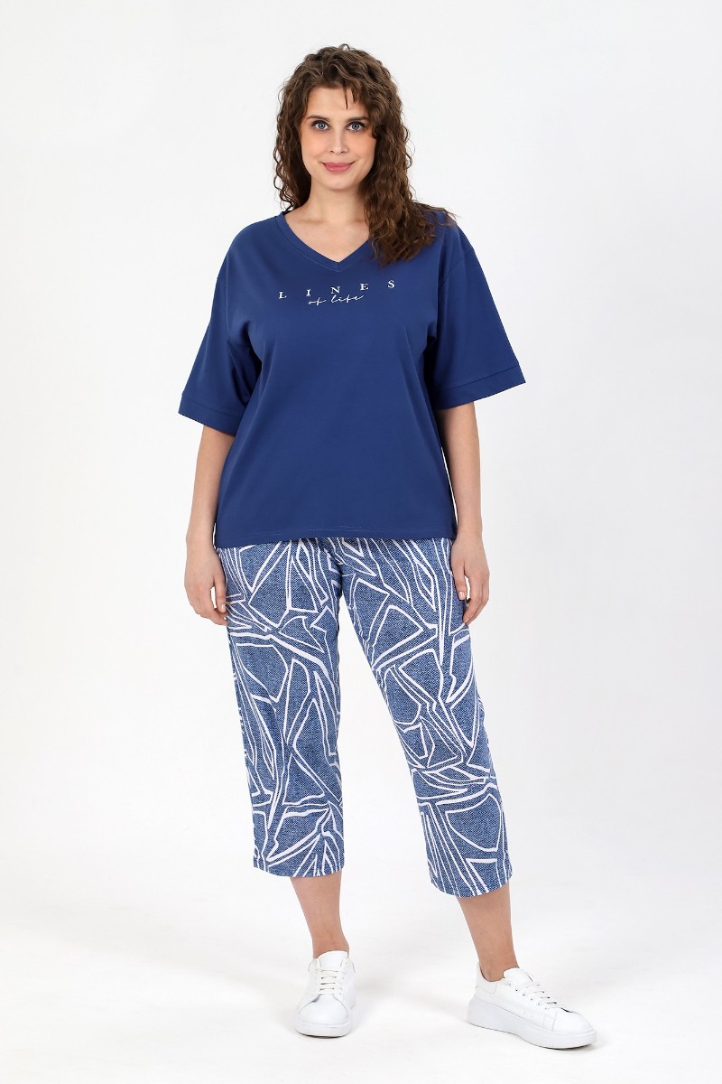 Представляем Вашему вниманию костюм женский из трикотажного полотна «кулирка» в комбинации двух видов в единой цветовой гамме: гладкокрашеный и с набивным рисунком, состоящий из футболки и брюк. Футболка - из гладкокрашеного трикотажного полотна «кулирка» классического покроя, с втачными рукавами длиной до локтя, горловиной V-образной формы, обработанной втачной планкой и принтом на полочке. Брюки – из полотна с набивным рисунком, длинные, свободные, на притачном поясе с эластичной тесьмой внутри, с карманами в боковых швах.