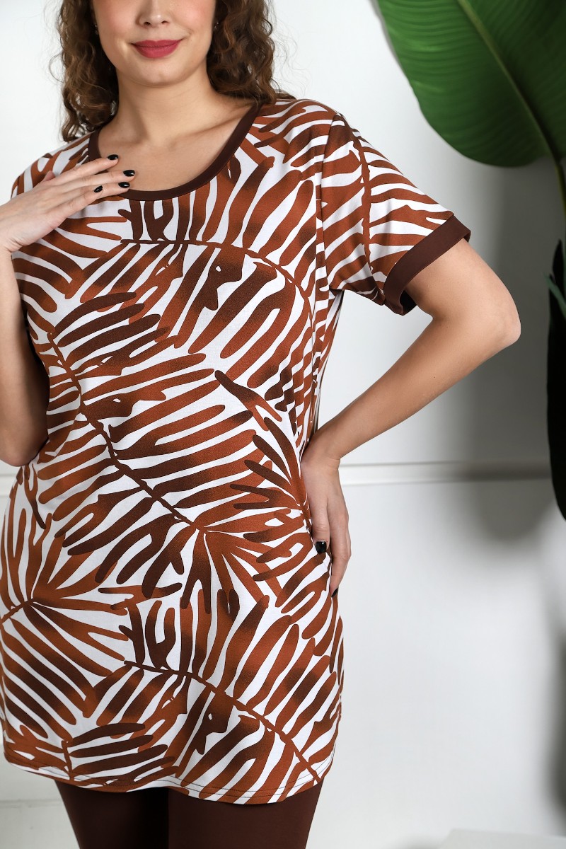 Представляем Вашему вниманию костюм из трикотажного вискозного полотна в комбинации двух видов в единой цветовой гамме: гладкокрашеного и с набивным рисунком, состоящий из туники и леггинсов. Туника – из полотна с набивным рисунком, свободного покроя, слегка расширенная книзу, с короткими втачными рукавами, горловиной овальной формы, обработанной притачной бейкой, и фигурной линией низа. Рукава с притачными манжетами. Планка горловины и манжеты выполнены из отделочного материала. Леггинсы – из гладкокрашеного полотна, прилегающие к телу, с эластичной тесьмой по талии.