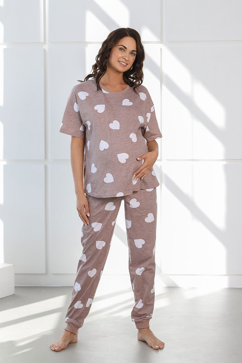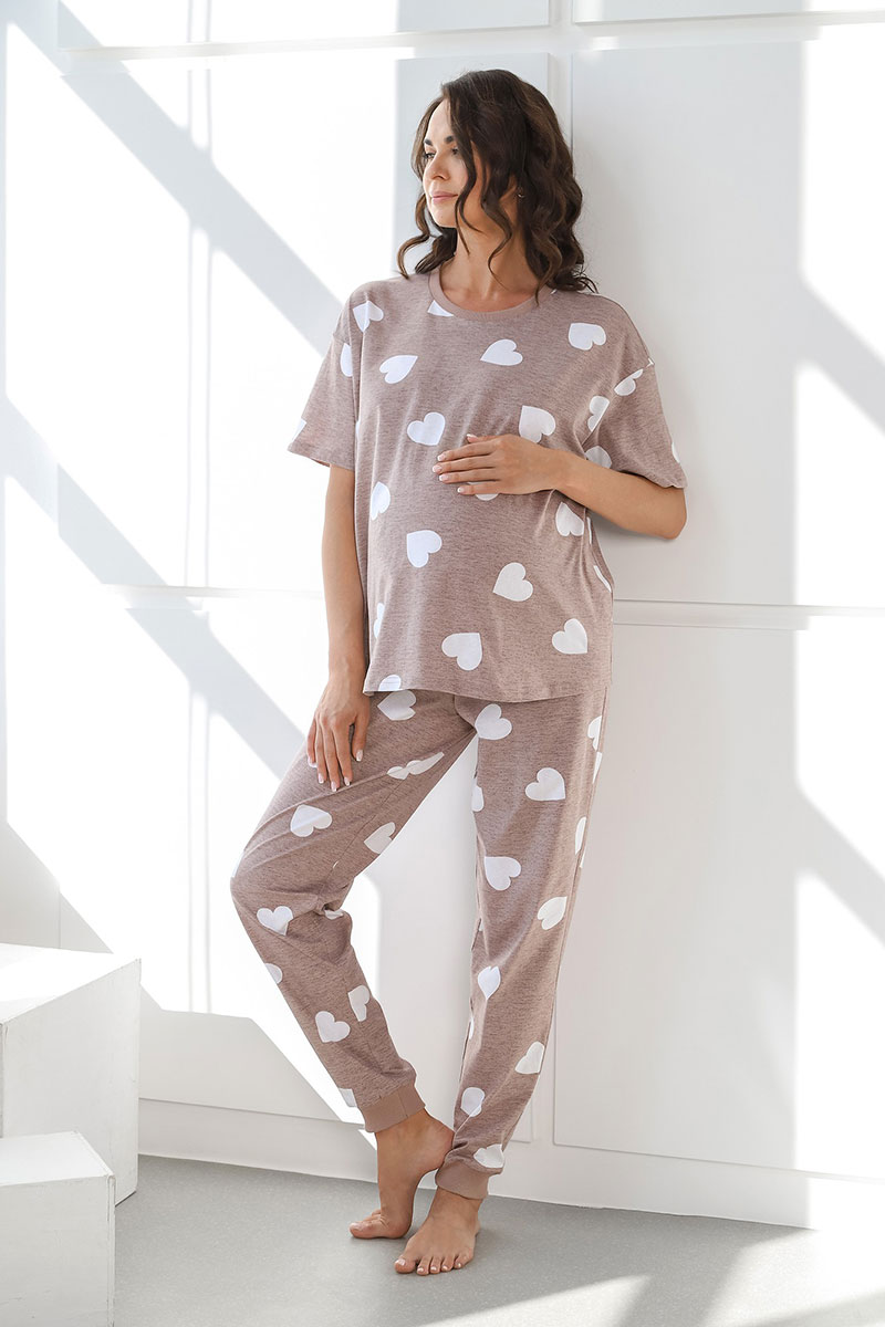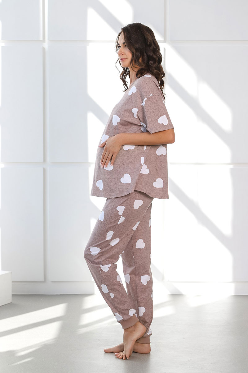 Представляем Вашему вниманию женский костюм двойку для беременных и кормящих женщин. Футболка со спущенной линией плеч, свободная, А-силуэта. Брюки с заниженной спереди линией талии. По горловине и низу брюк детали из кашкорсе.