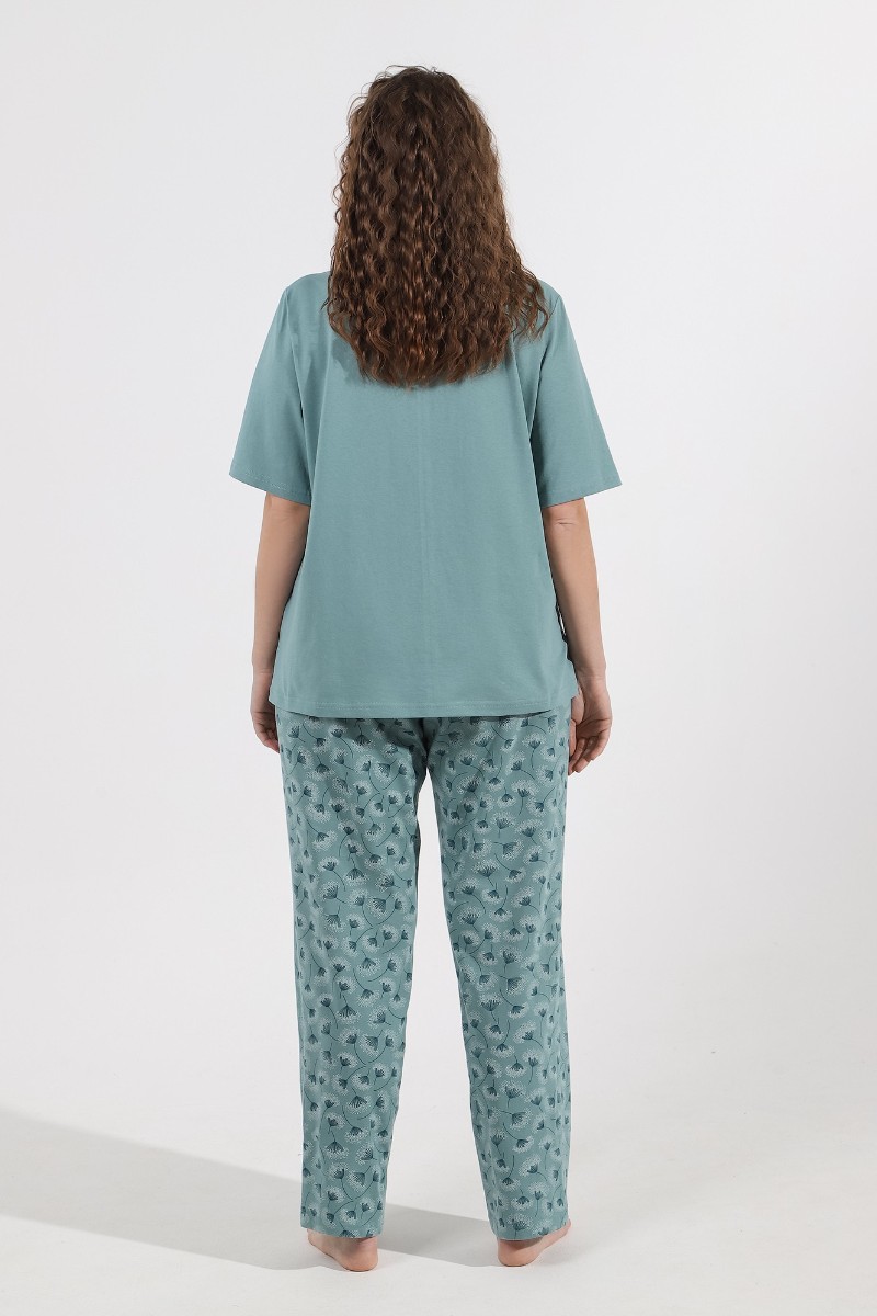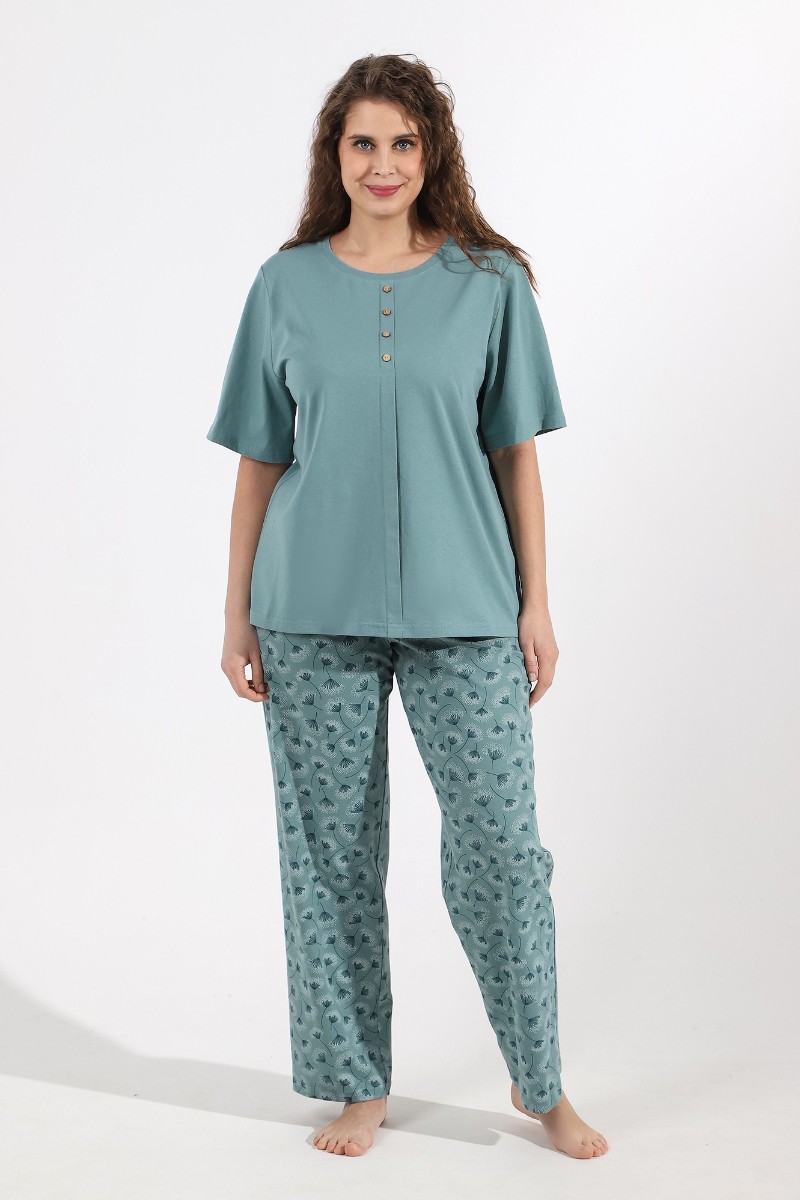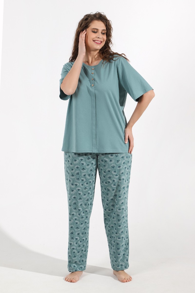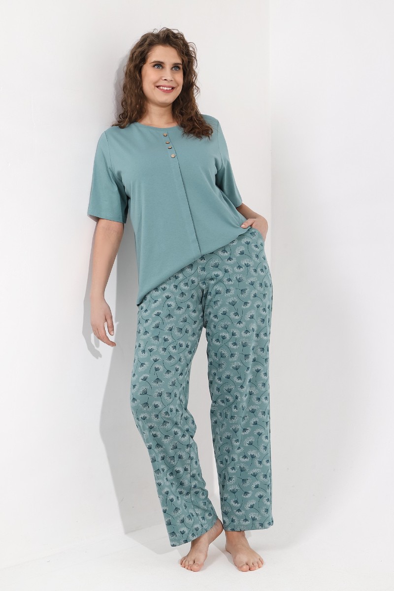 Представляем Вашему вниманию костюм женский из трикотажного полотна «кулирка» в комбинации двух видов ткани гладкокрашеной и с набивным рисунком, состоящий из футболки и брюк. Футболка - из гладкокрашеного полотна, классического покроя, с короткими втачными рукавами, горловиной овальной формы, обработанной притачной бейкой. Перед – с застроченной складкой, расположенной по центру и имитирующей застежку на пуговицы.Брюки - из полотна с набивным рисунком, длинные, свободные, с карманами в боковых швах, на притачном поясе с эластичной тесьмой внутри.