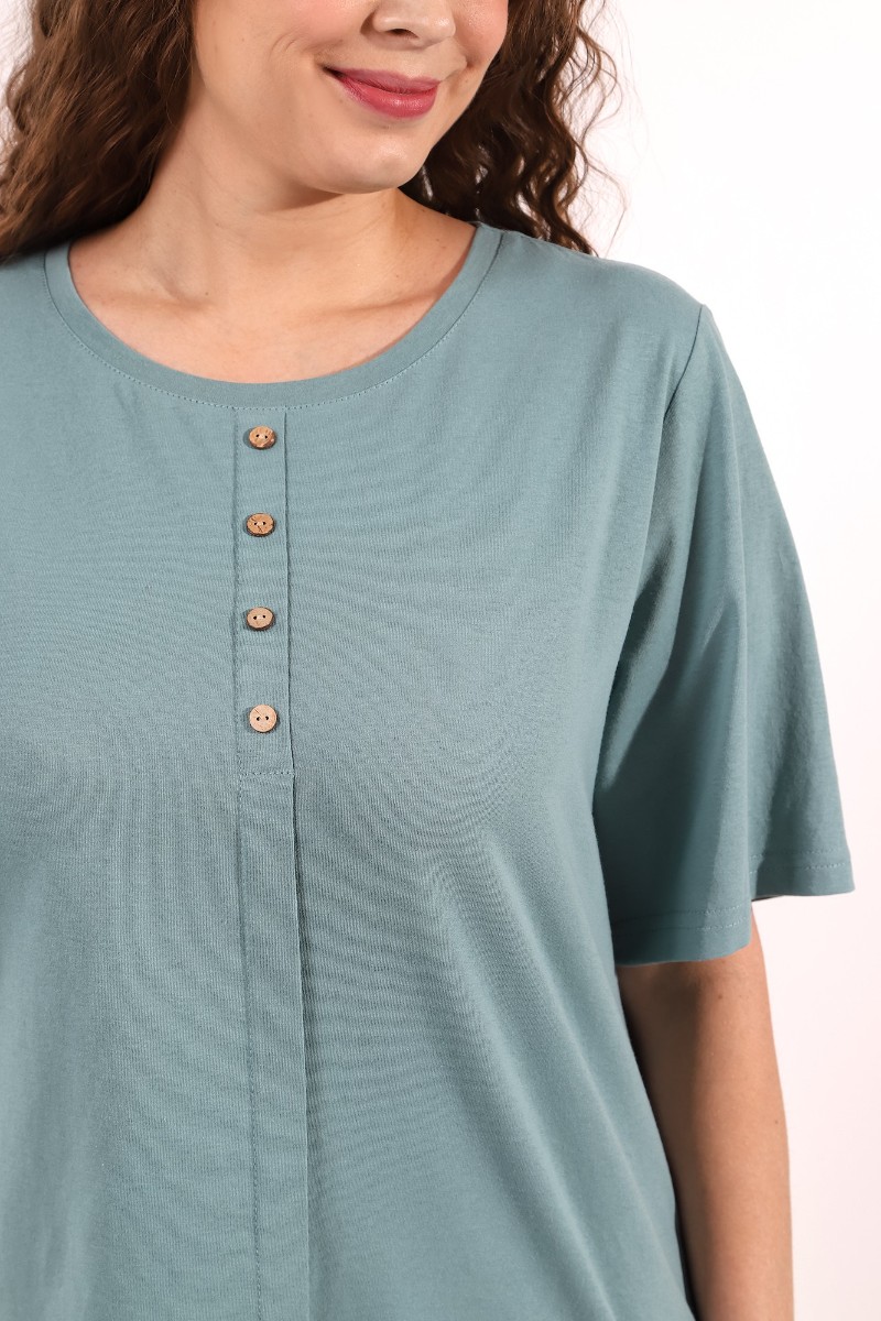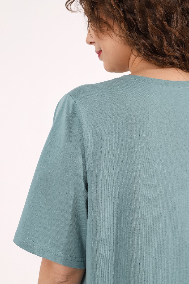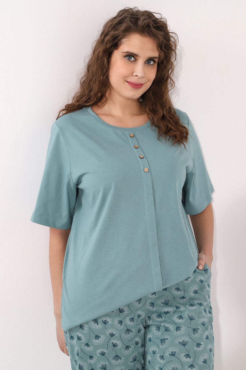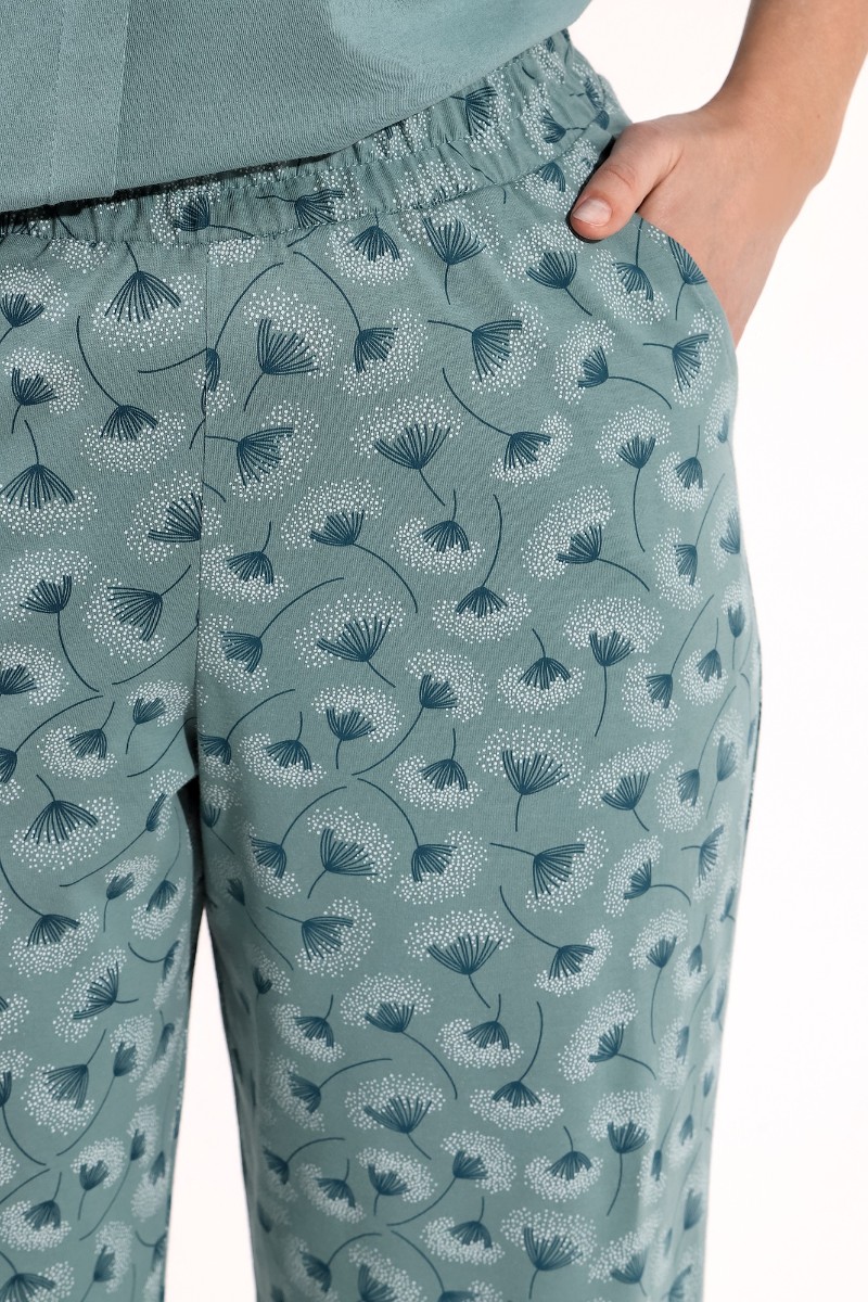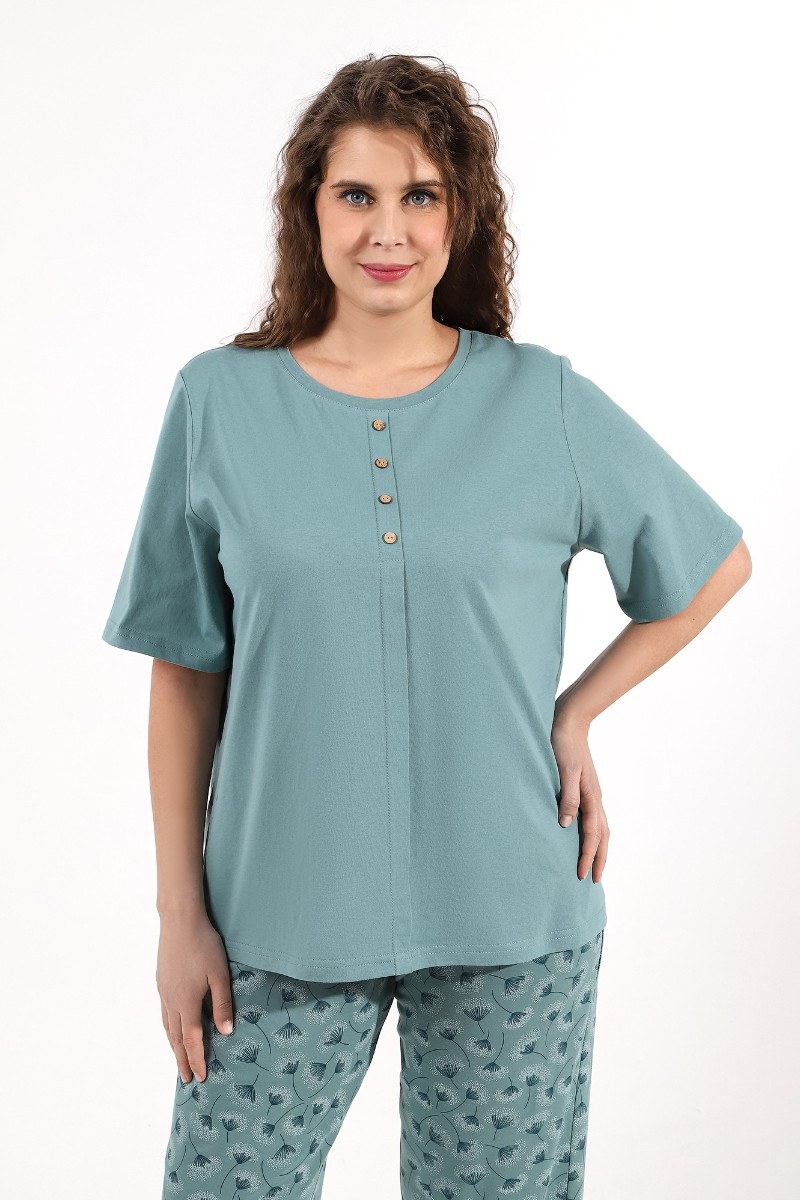 Представляем Вашему вниманию костюм женский из трикотажного полотна «кулирка» в комбинации двух видов ткани гладкокрашеной и с набивным рисунком, состоящий из футболки и брюк. Футболка - из гладкокрашеного полотна, классического покроя, с короткими втачными рукавами, горловиной овальной формы, обработанной притачной бейкой. Перед – с застроченной складкой, расположенной по центру и имитирующей застежку на пуговицы.Брюки - из полотна с набивным рисунком, длинные, свободные, с карманами в боковых швах, на притачном поясе с эластичной тесьмой внутри.