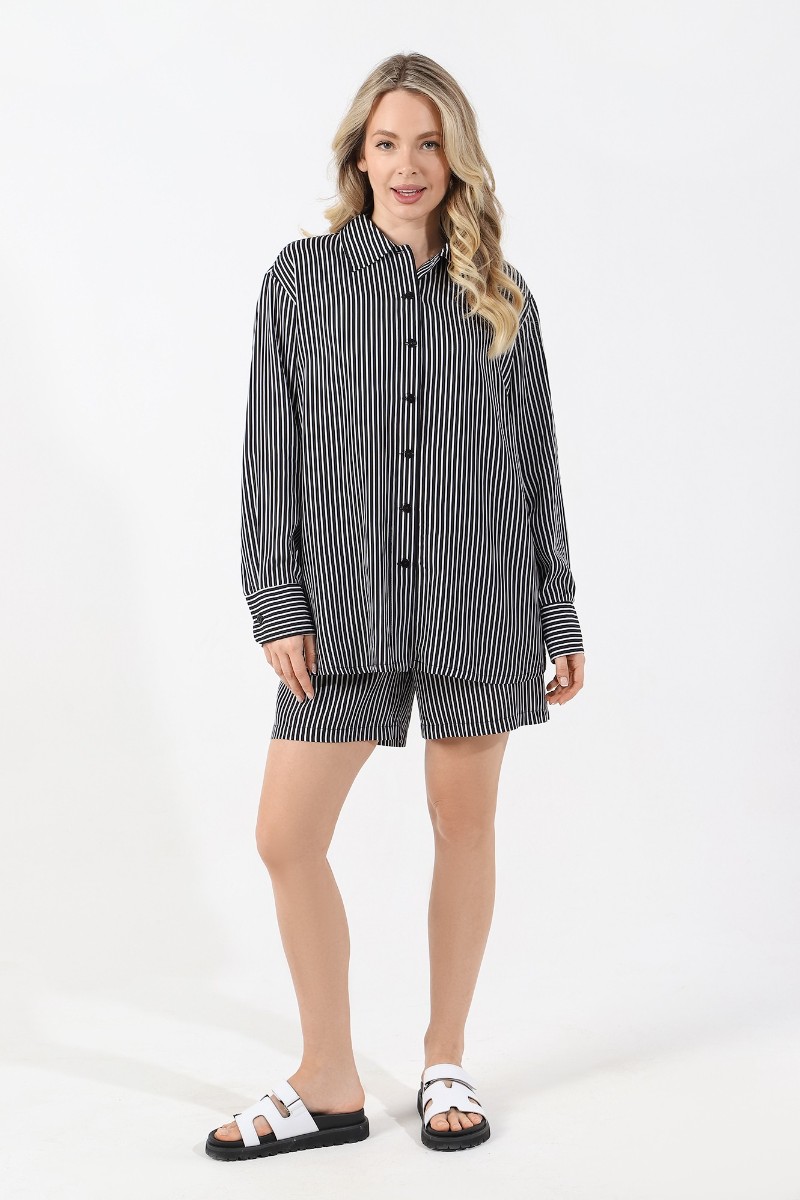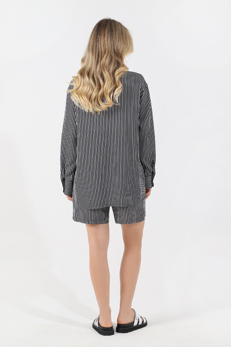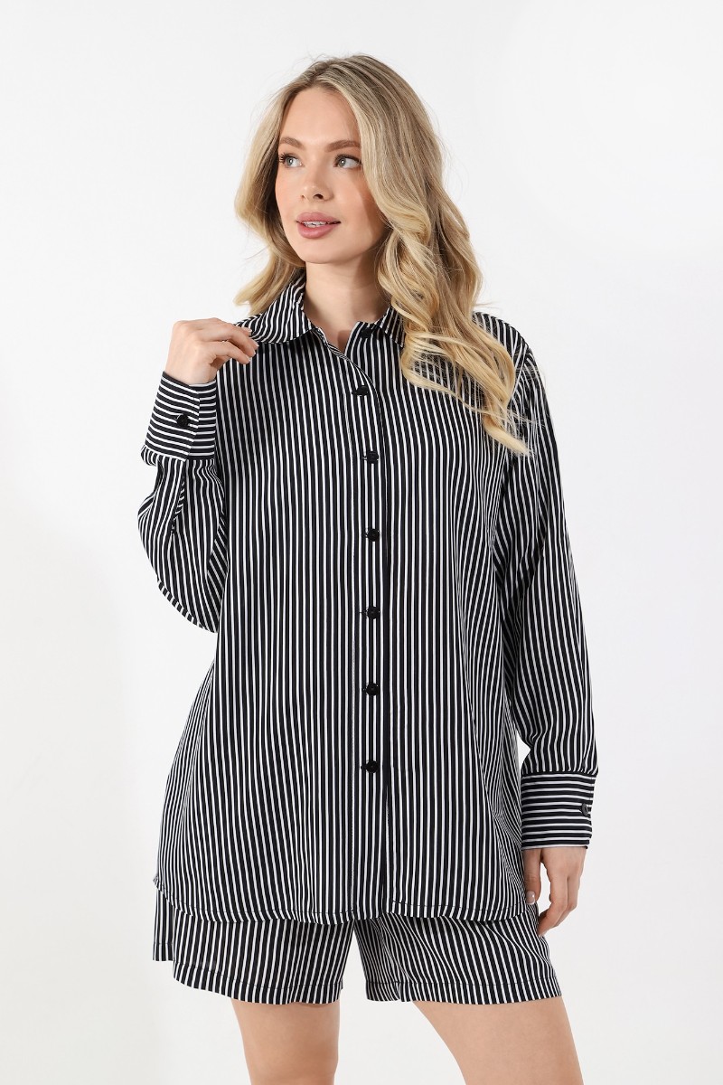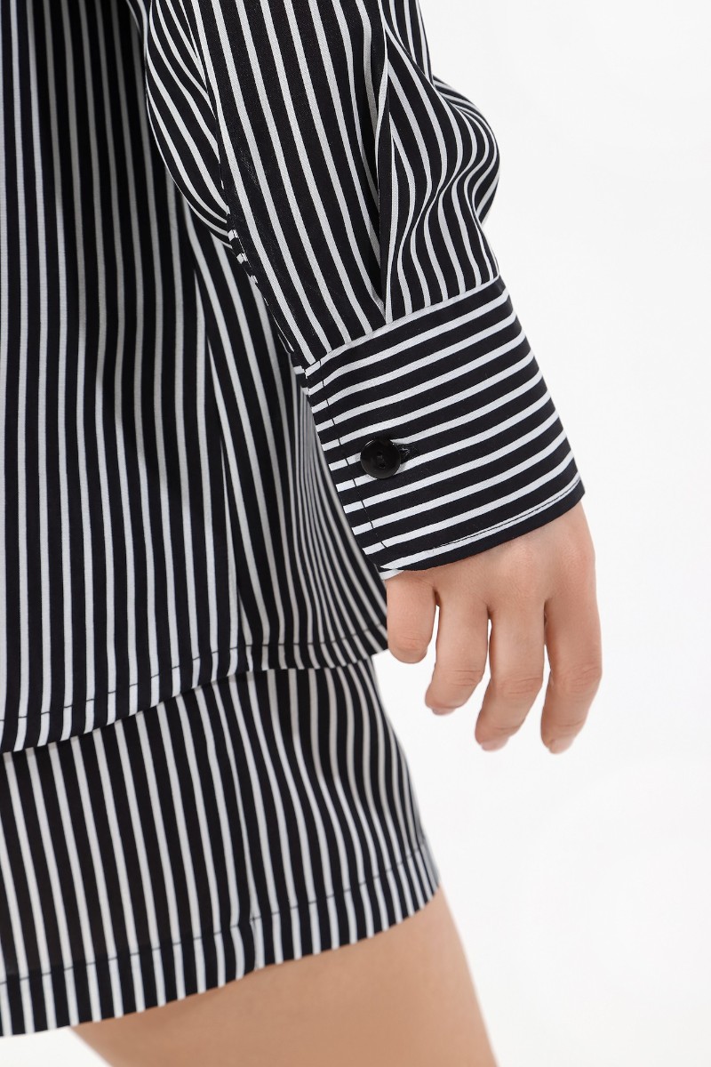 Представляем Вашему вниманию костюм молодежный из штапельного полотна с набивным рисунком «полоска», состоящий из блузки-рубашки и шорт.Блузка-рубашка свободного кроя, со стояче-отложным воротником, спущенным длинным рукавом. Перед из двух частей с центральной бортовой застежкой на петли и пуговицы, спинка цельнокроеная. Низ рукава с притачной манжетой, застегивающейся на петлю и пуговицу.Шорты свободные, средней длины, на притачном поясе с эластичной тесьмой внутри, карманами в боковых швах.