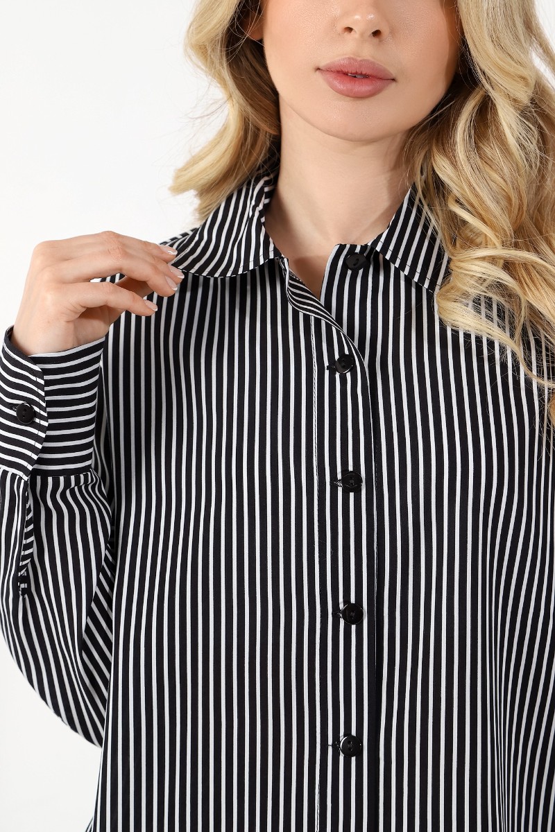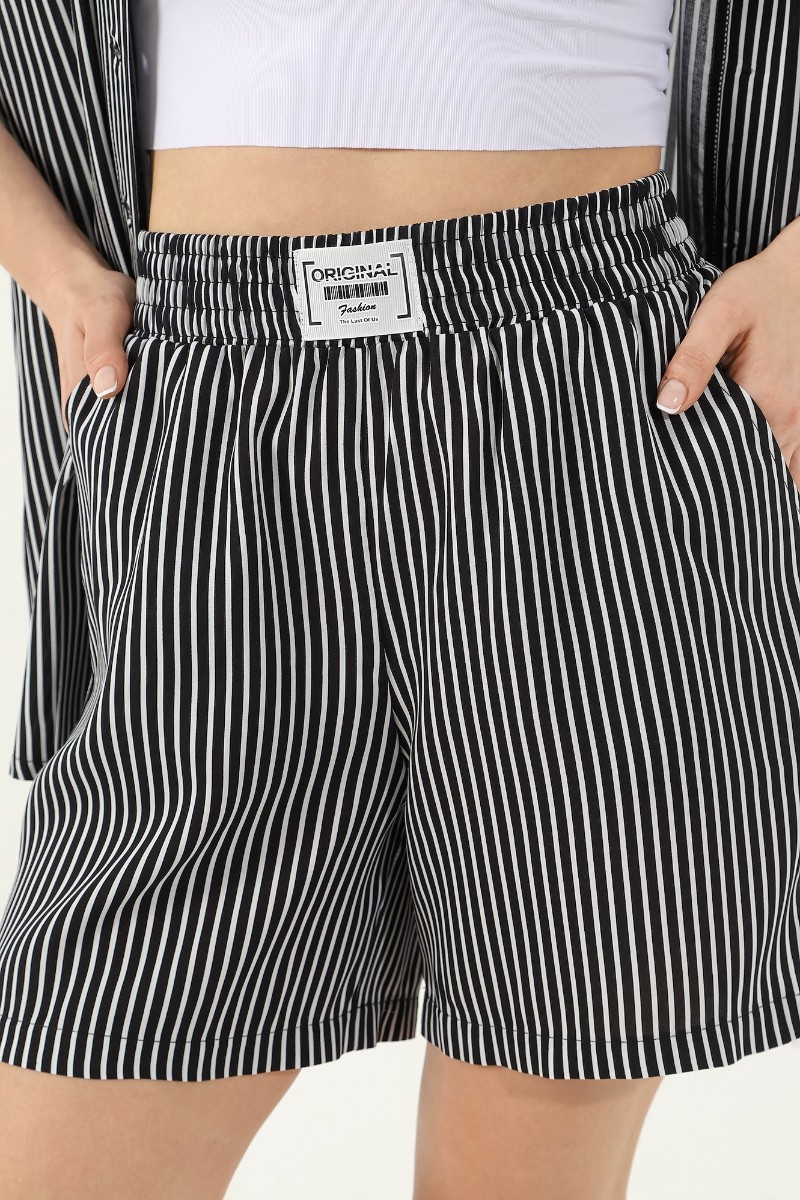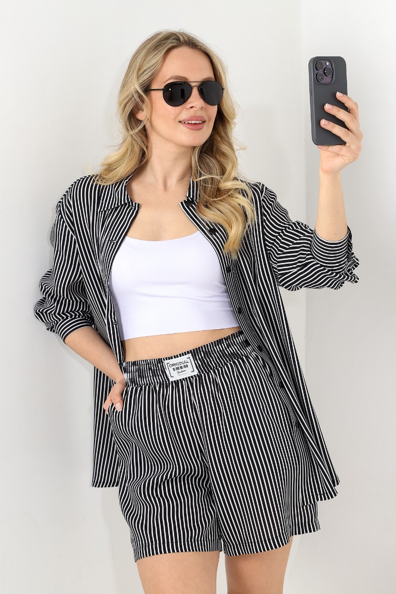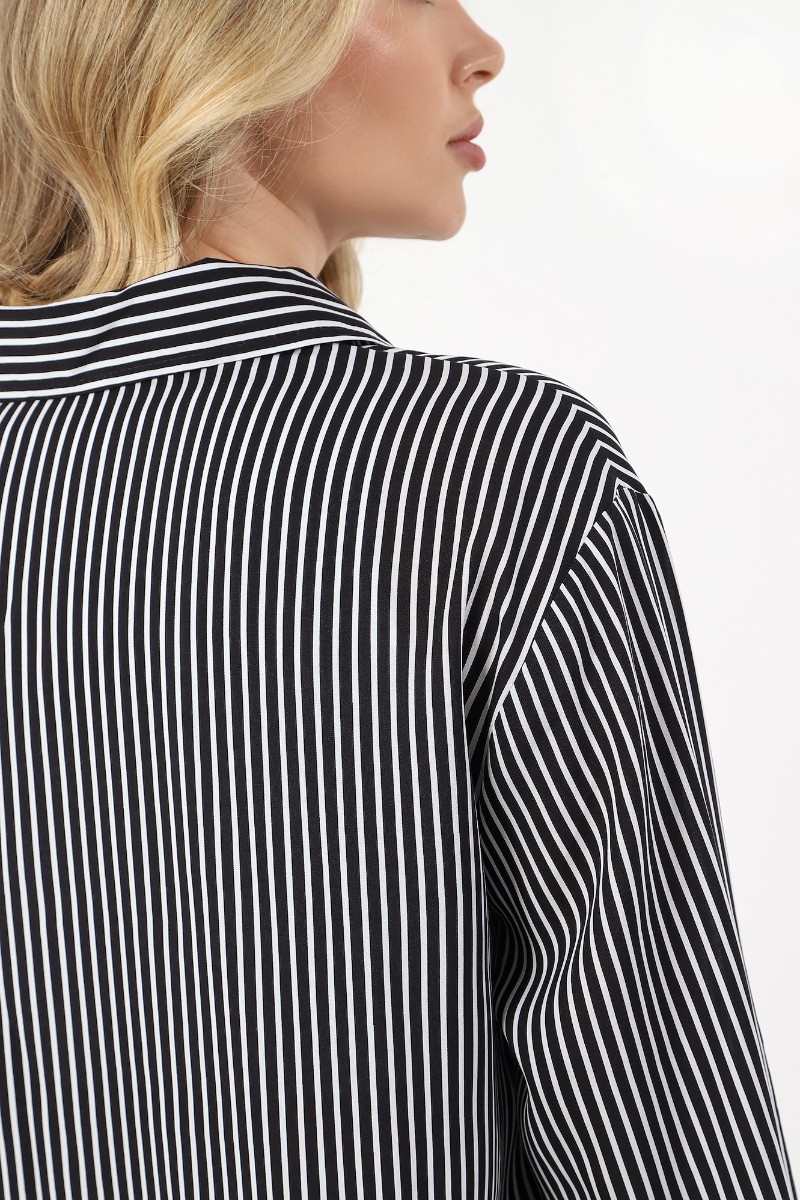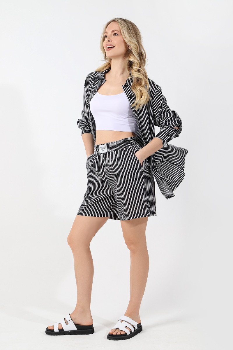 Представляем Вашему вниманию костюм молодежный из штапельного полотна с набивным рисунком «полоска», состоящий из блузки-рубашки и шорт.Блузка-рубашка свободного кроя, со стояче-отложным воротником, спущенным длинным рукавом. Перед из двух частей с центральной бортовой застежкой на петли и пуговицы, спинка цельнокроеная. Низ рукава с притачной манжетой, застегивающейся на петлю и пуговицу.Шорты свободные, средней длины, на притачном поясе с эластичной тесьмой внутри, карманами в боковых швах.