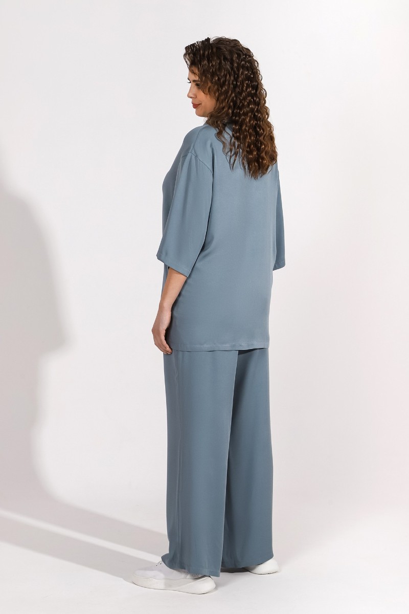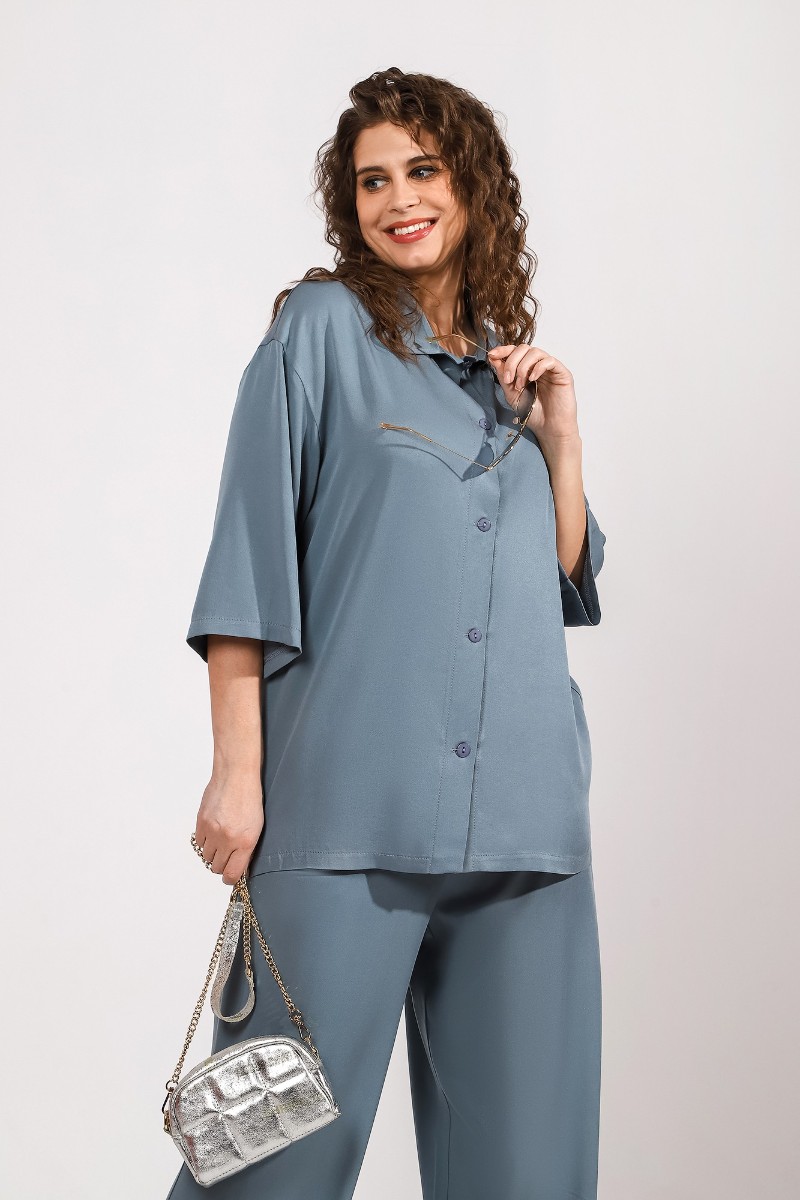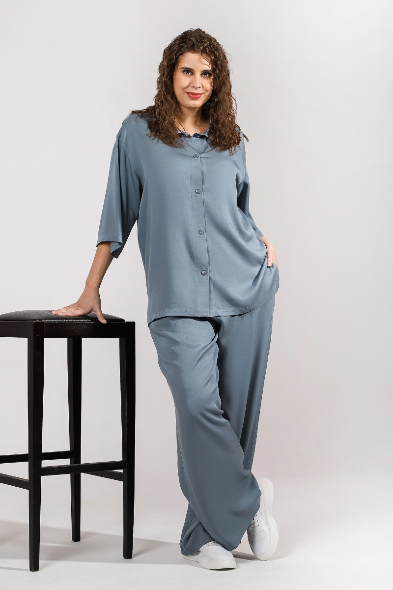 Представляем Вашему вниманию костюм женский из гладкокрашеного тканого полотна «штапель» состоящий из блузы и брюк в единой цветовой гамме. Блуза (рубашка) женская из тканого гладкокрашеного полотна «штапель», свободного покроя, с короткими втачными рукавами, стояче-отложным воротником, центральной бортовой застежкой на обметанные петли и пуговицы. В боковых швах разрезы. Брюки женские из гладкокрашеного тканого полотна «штапель», свободные слегка расширенные книзу, с карманами в боковых швах на притачном поясе с эластичной тесьмой внутри.