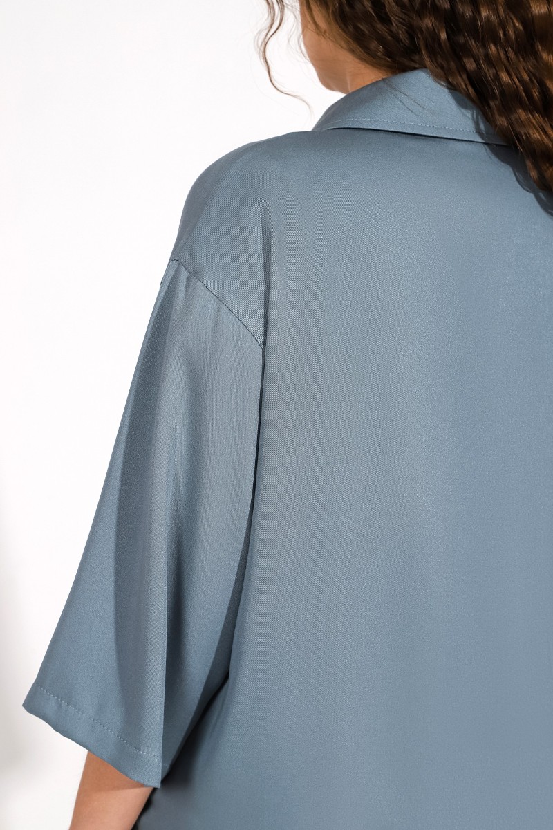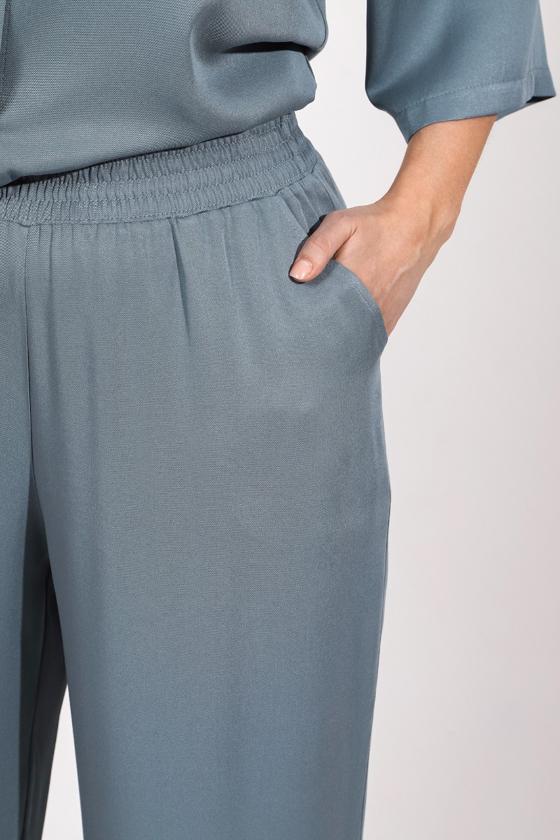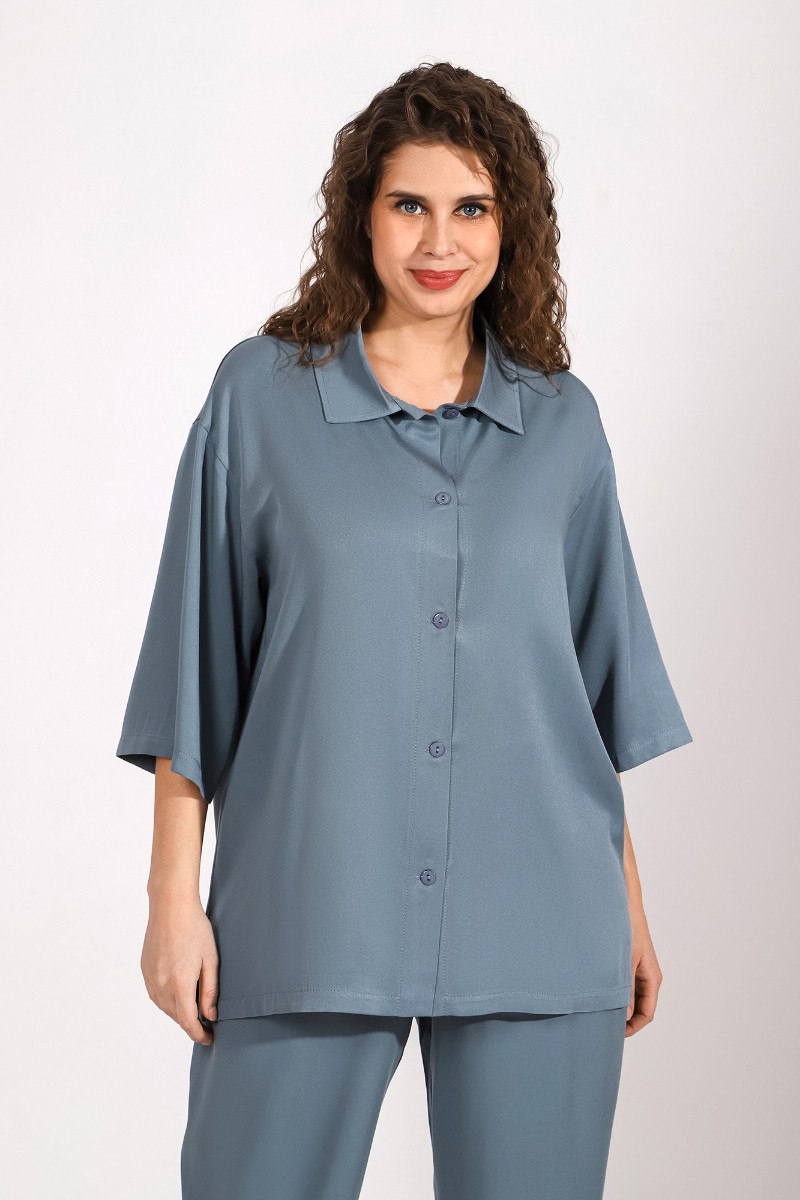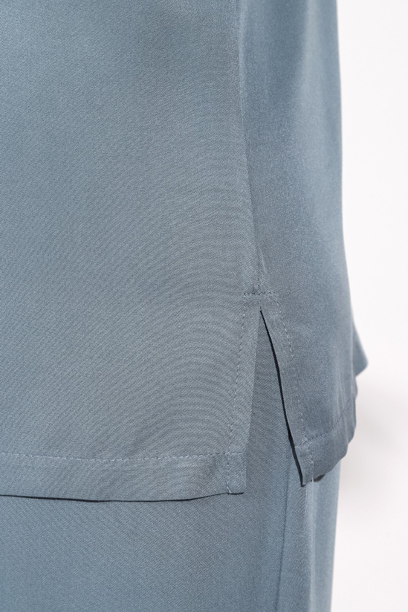 Представляем Вашему вниманию костюм женский из гладкокрашеного тканого полотна «штапель» состоящий из блузы и брюк в единой цветовой гамме. Блуза (рубашка) женская из тканого гладкокрашеного полотна «штапель», свободного покроя, с короткими втачными рукавами, стояче-отложным воротником, центральной бортовой застежкой на обметанные петли и пуговицы. В боковых швах разрезы. Брюки женские из гладкокрашеного тканого полотна «штапель», свободные слегка расширенные книзу, с карманами в боковых швах на притачном поясе с эластичной тесьмой внутри.