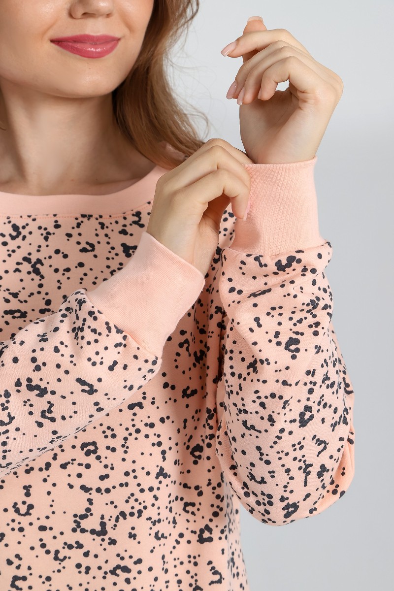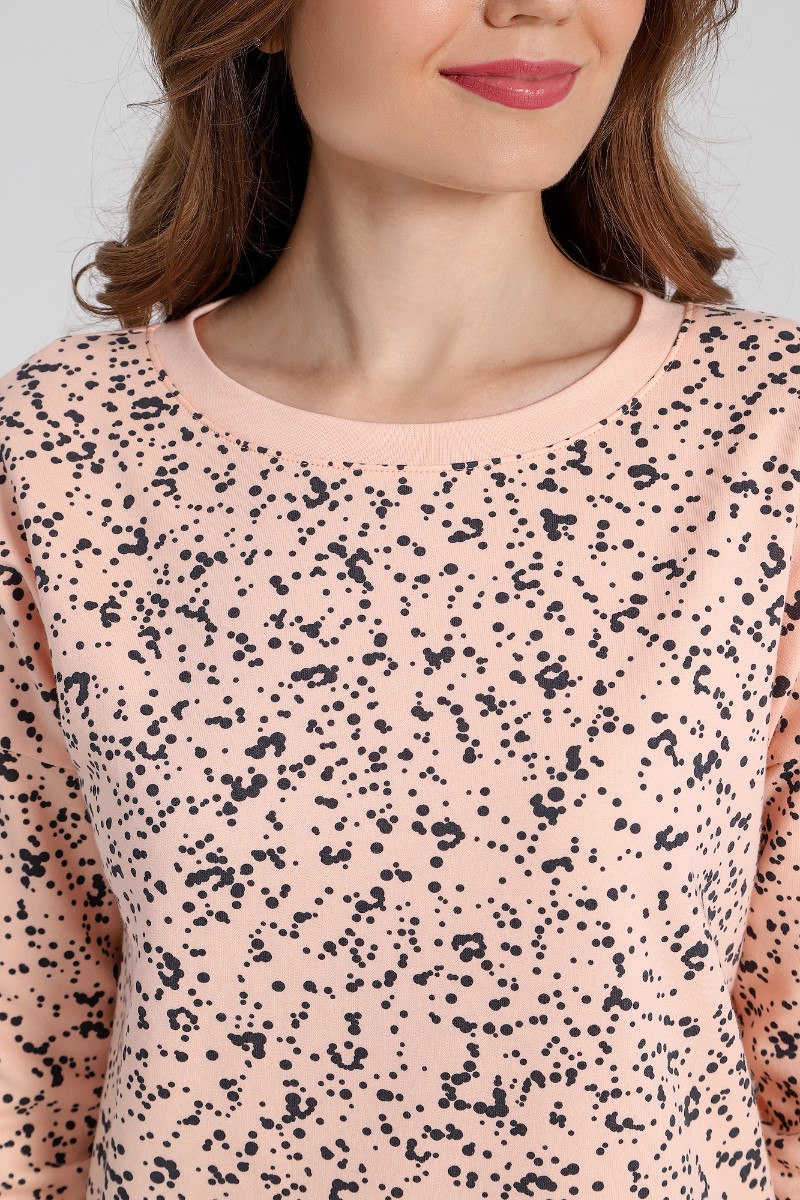 Представляем Вашему вниманию легкую женскую сорочку из трикотажного полотна «футер-двунитка с начесом» с набивным рисунком, прямого силуэта, с длинными рукавами на основе цельнокроеных и овальной горловиной. Втачная бейка горловины и манжеты рукавов выполнены из эластичного полотна «рибана» в цвет основного материала.