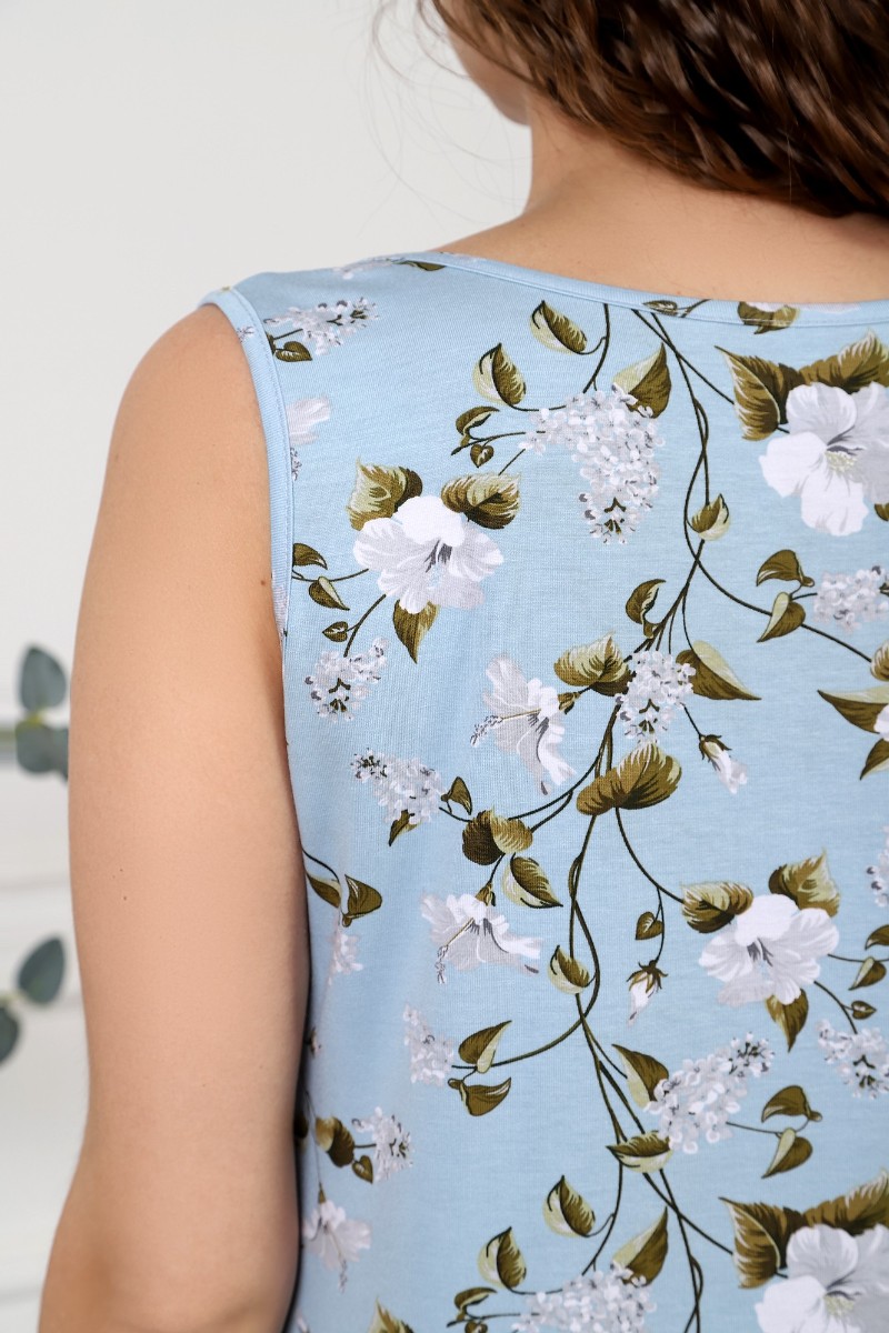 Представляем Вашему вниманию женскую сорочку из трикотажного вискозного полотна с набивным рисунком, слегка расширенная книзу, без рукавов, с кружевной вставкой-кокеткой V-образной формы и небольшой драпировкой в центре груди. Горловина и проймы окантованы основным материалом.