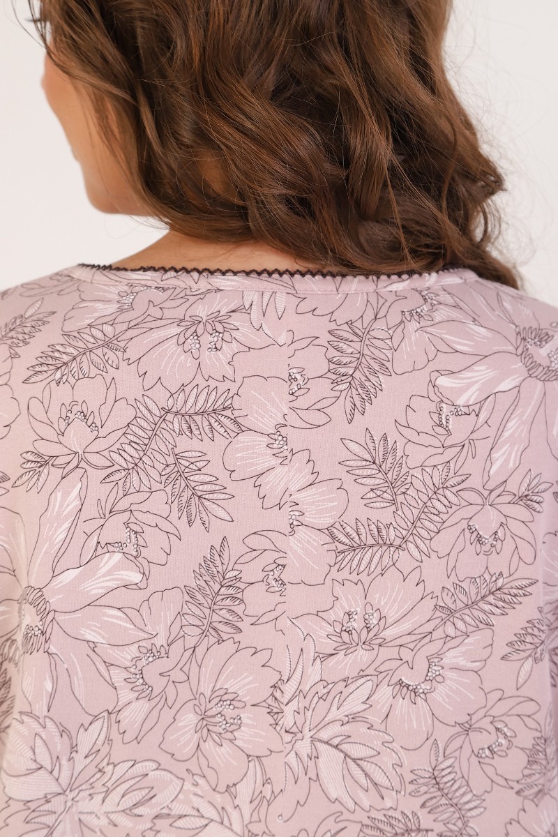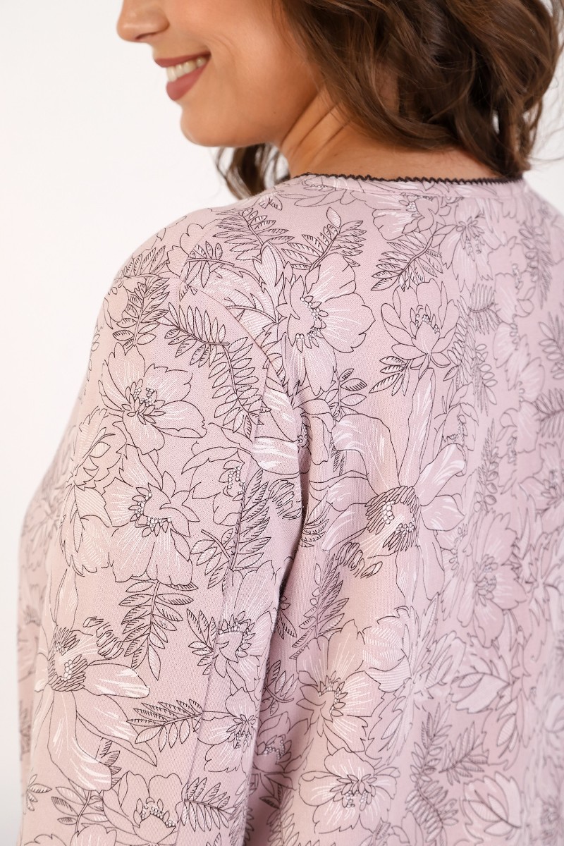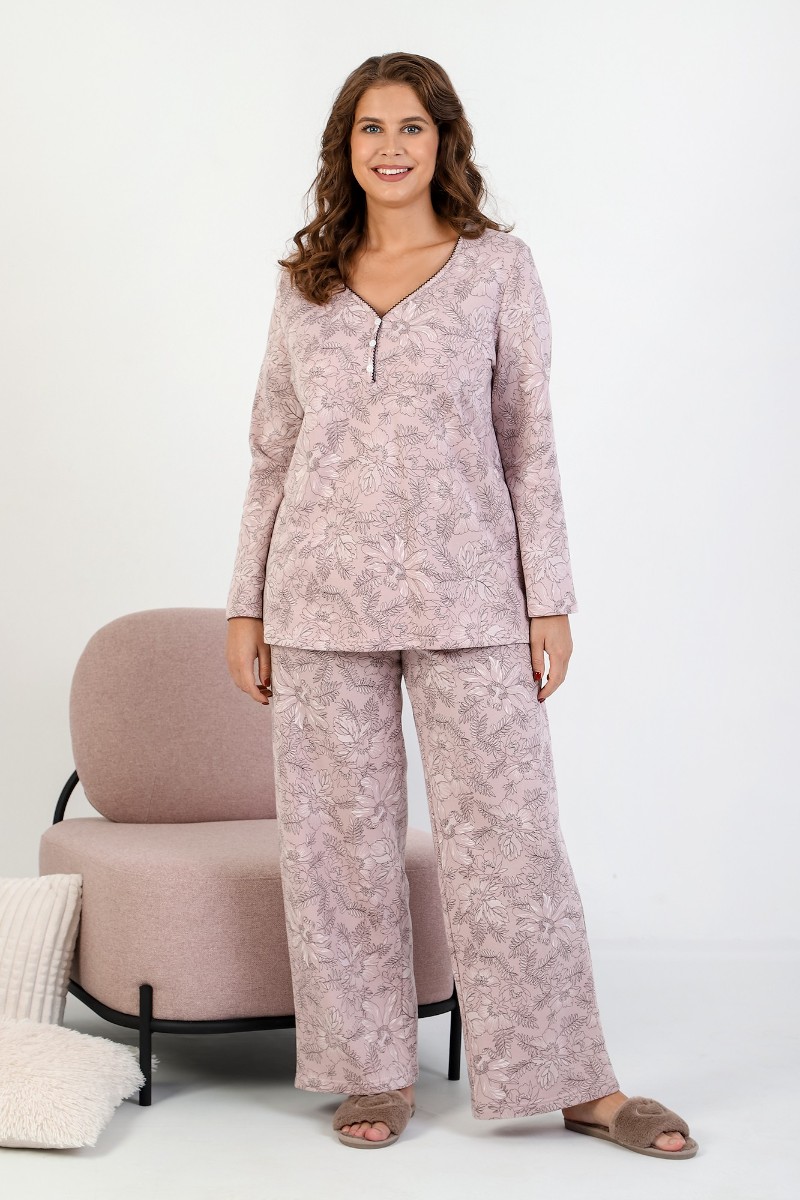 Представляем Вашему вниманию женскую пижаму из трикотажного полотна «футер-двунитка с начесом» с набивным рисунком, состоящая из футболки и брюк. Футболка - с длинными рукавами, горловиной V-образной формы, переходящей в разрез спереди. Горловина и разрез окантованы основным материалом и дополнительно украшены декоративной строчкой «кроше» нитками контрастного цвета. По разрезу пришиты три декоративные пуговицы, имитирующие застежку. Брюки – длинные, на резинке по талии, слегка расширенные книзу.