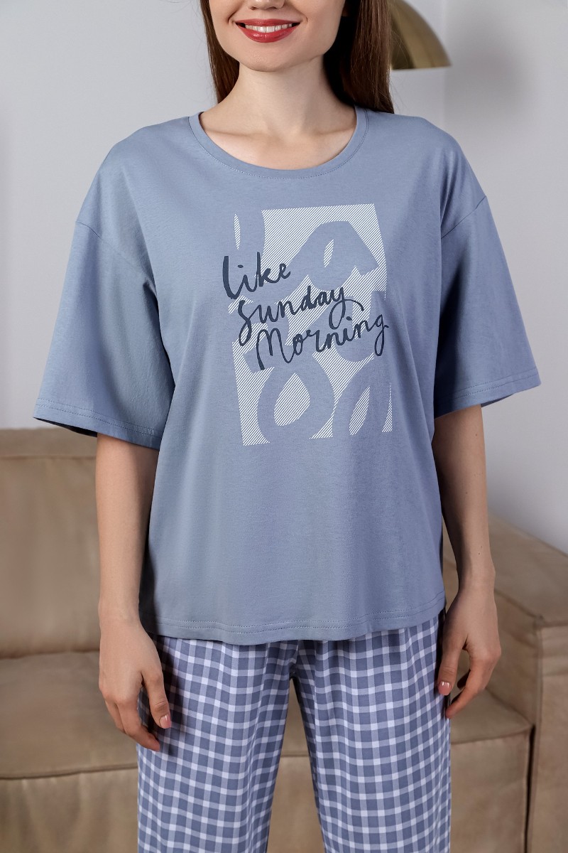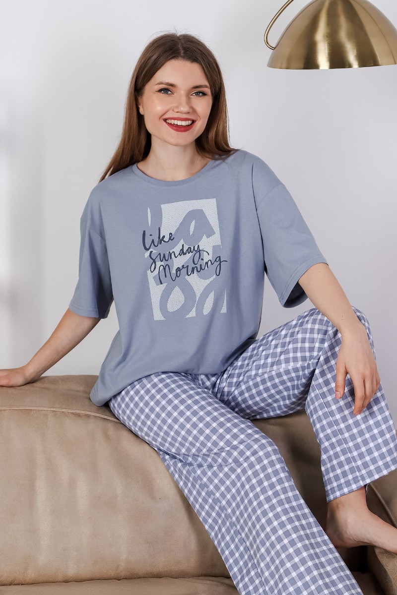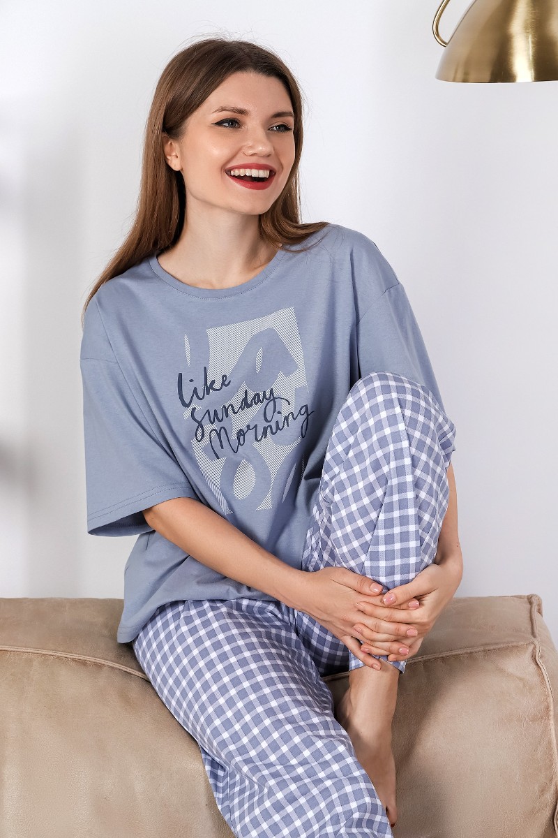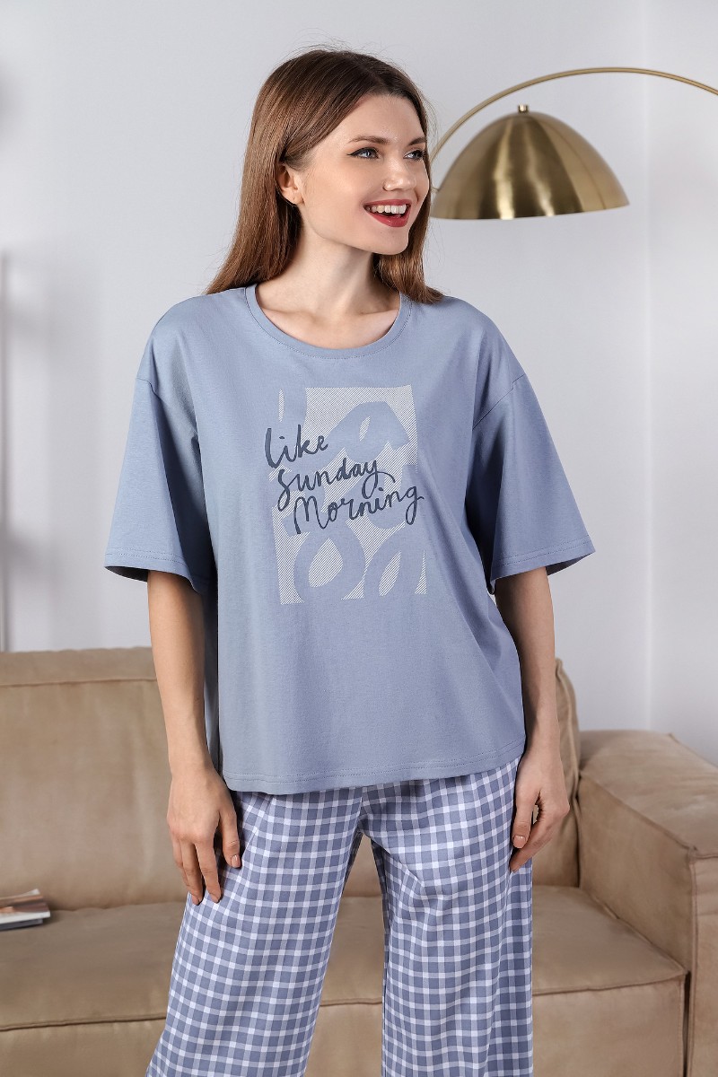 Представляем Вашему вниманию женскую пижаму из трикотажного полотна «кулирка» в комбинации двух видов: гладкокрашеного и с набивным рисунком, состоящая из футболки и брюк. Футболка – из гладкокрашеного полотна, классического покроя, с короткими втачными рукавами, горловиной овальной формы, обработанной притачной бейкой и принтом на полочке, выполненным в технике «шелкографии».Брюки – из полотна с набивным рисунком, свободные классического покроя, с эластичной тесьмой по талии.