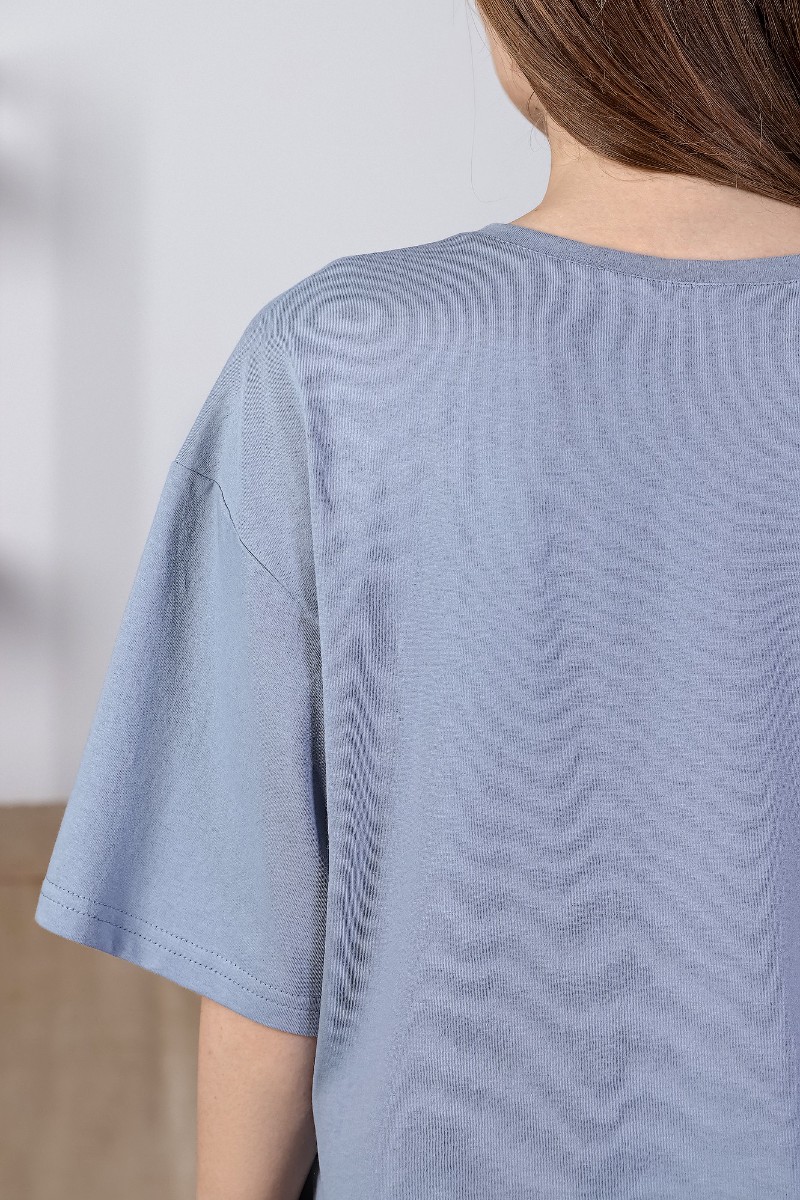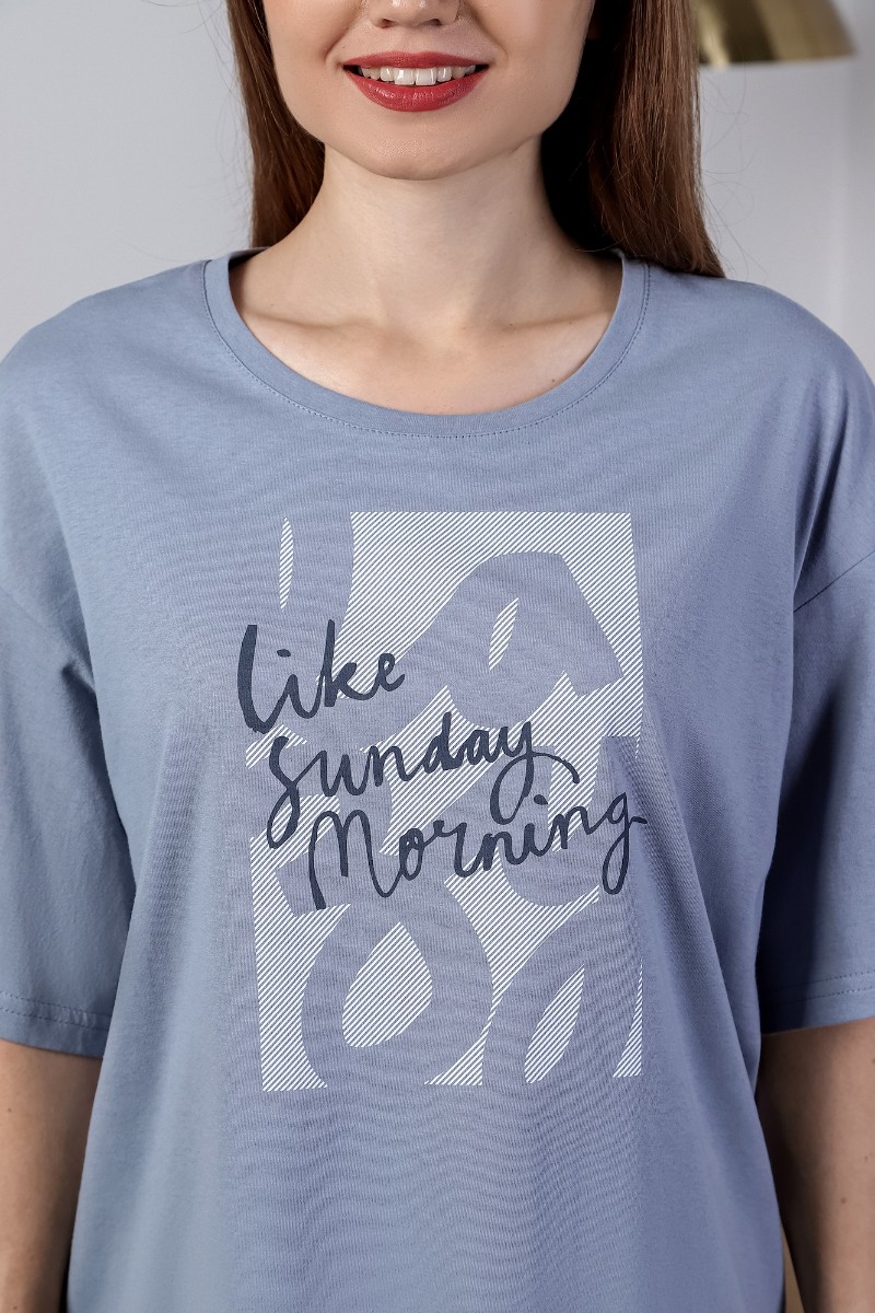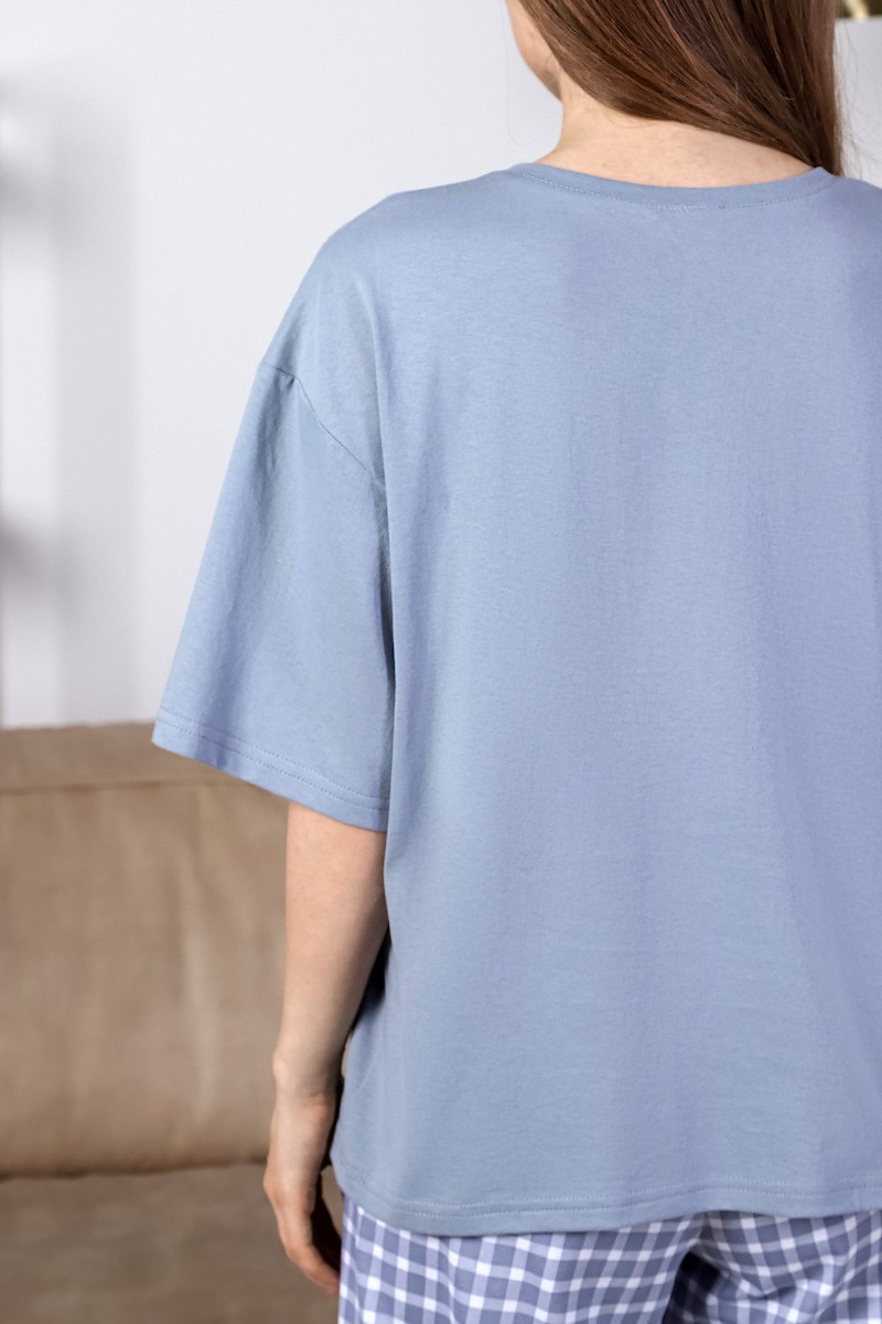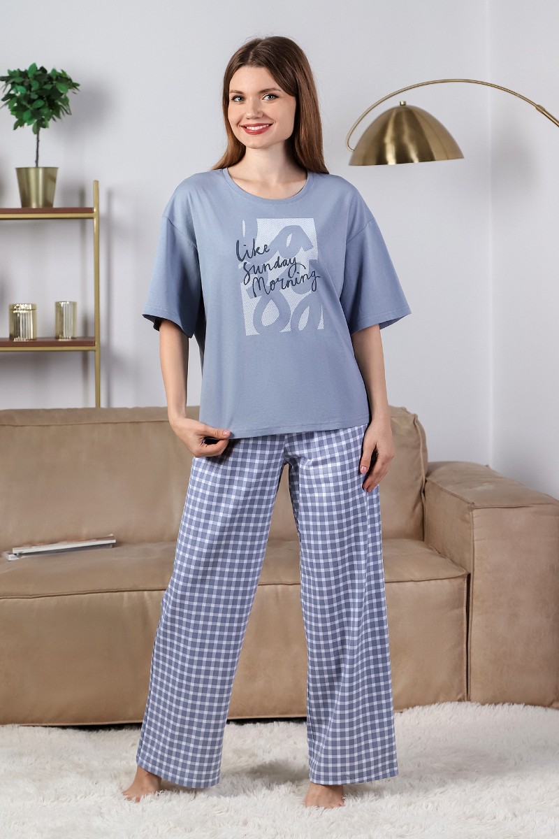 Представляем Вашему вниманию женскую пижаму из трикотажного полотна «кулирка» в комбинации двух видов: гладкокрашеного и с набивным рисунком, состоящая из футболки и брюк. Футболка – из гладкокрашеного полотна, классического покроя, с короткими втачными рукавами, горловиной овальной формы, обработанной притачной бейкой и принтом на полочке, выполненным в технике «шелкографии».Брюки – из полотна с набивным рисунком, свободные классического покроя, с эластичной тесьмой по талии.
