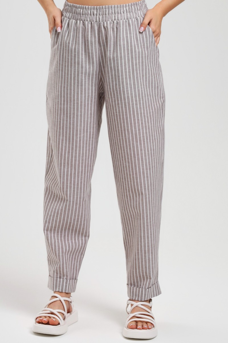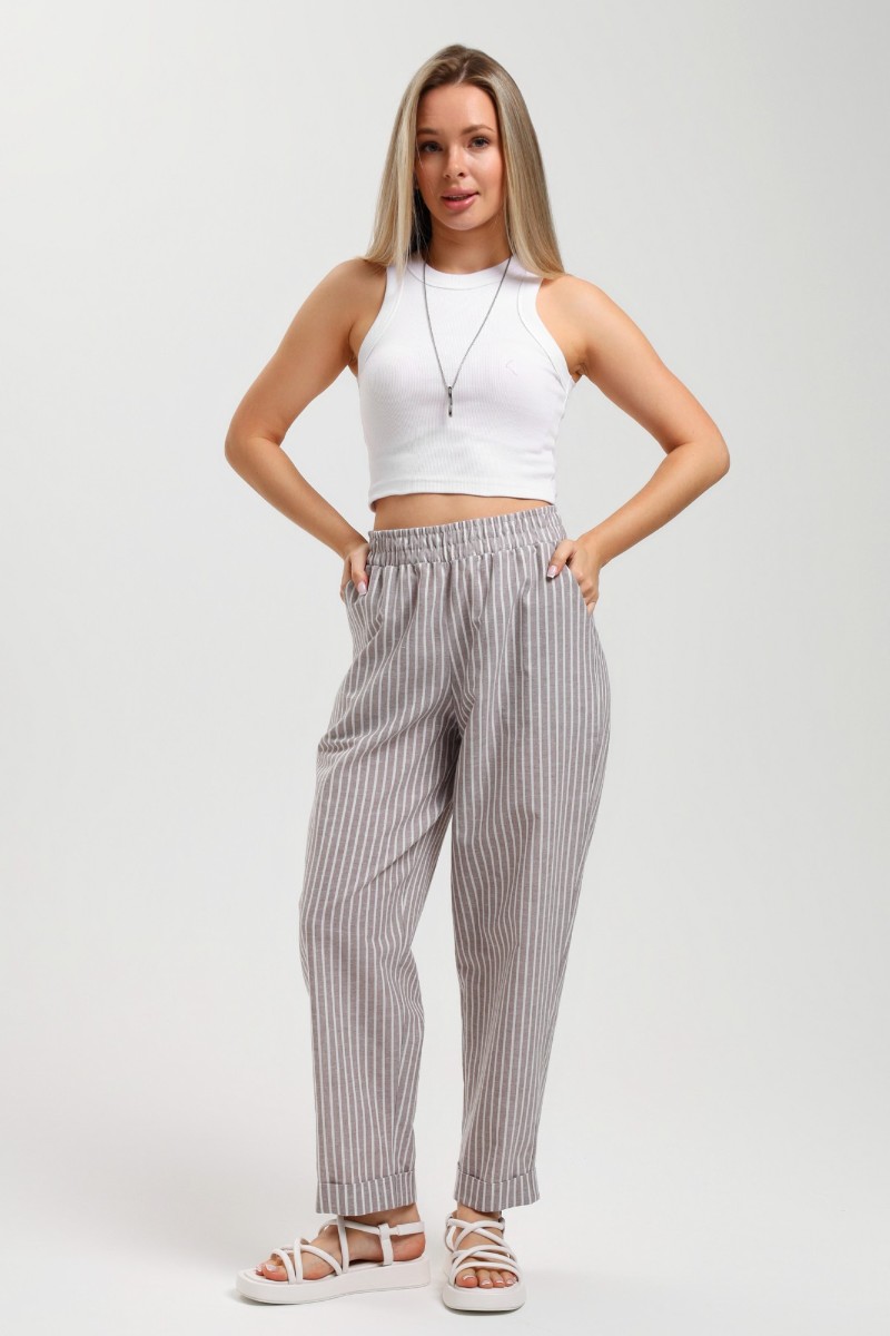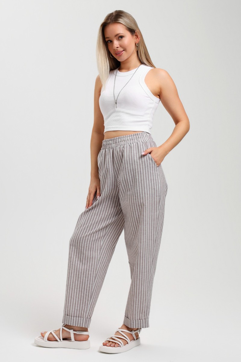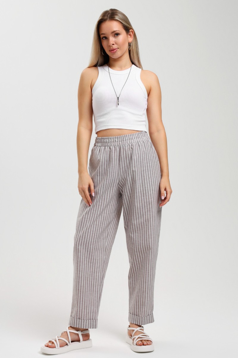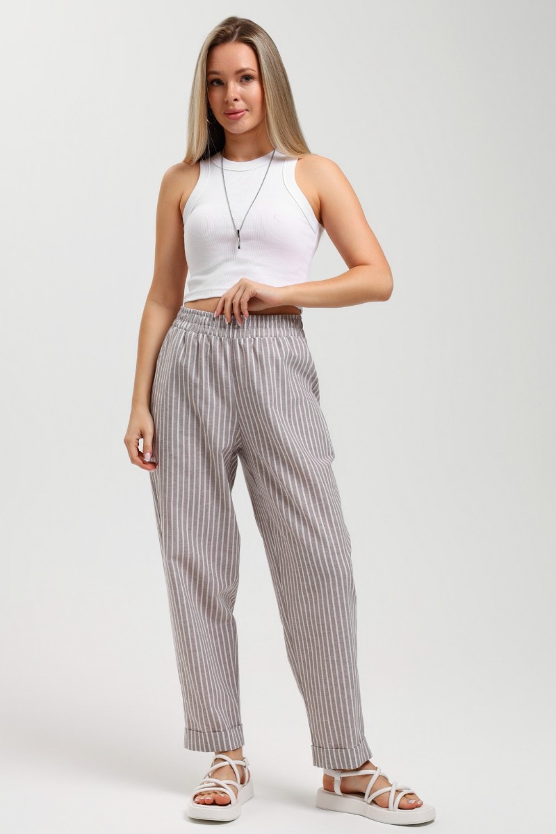 Представляем Вашему вниманию свободные женские брюки из тканого полотна с набивным рисунком в полоску, свободного покроя, с карманами в боковых швах, на притачном поясе с эластичной тесьмой внутри.